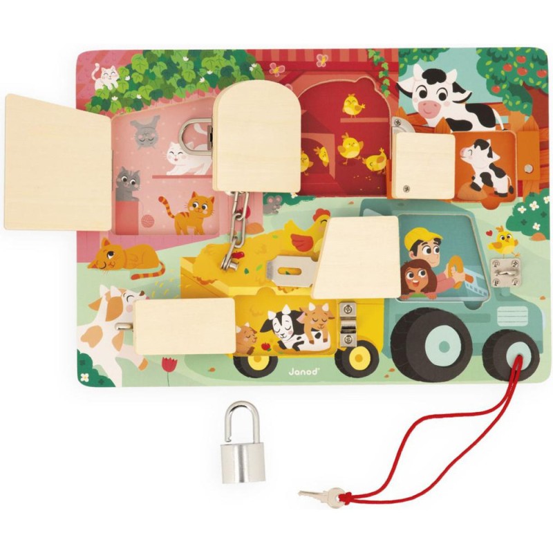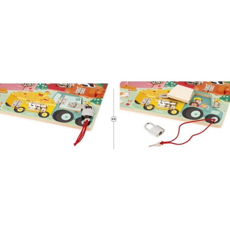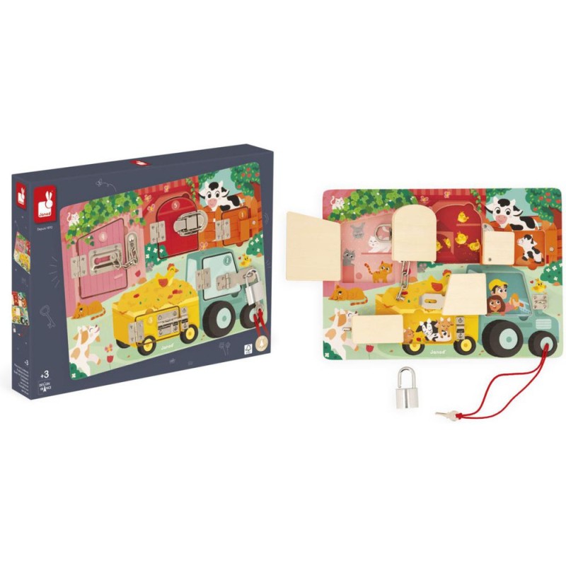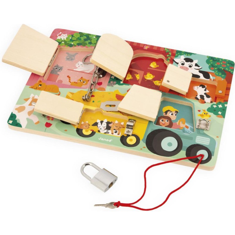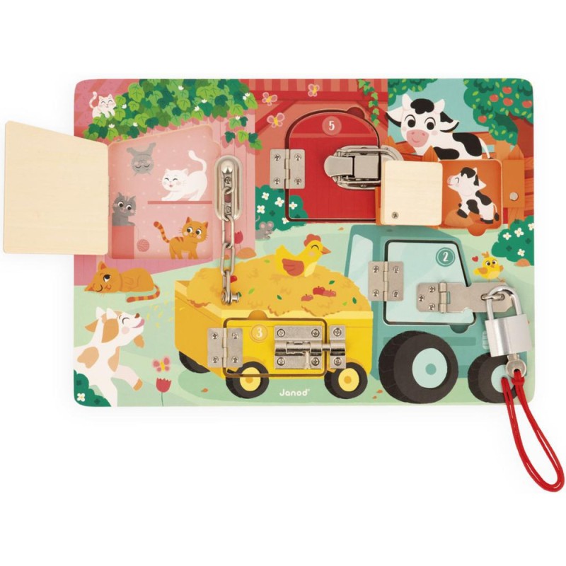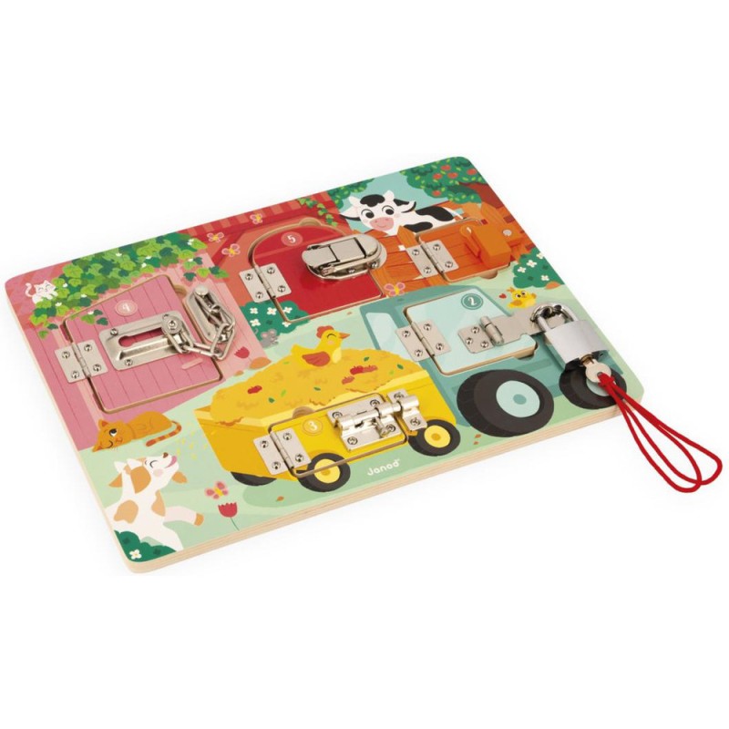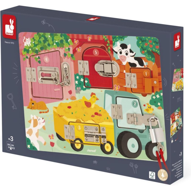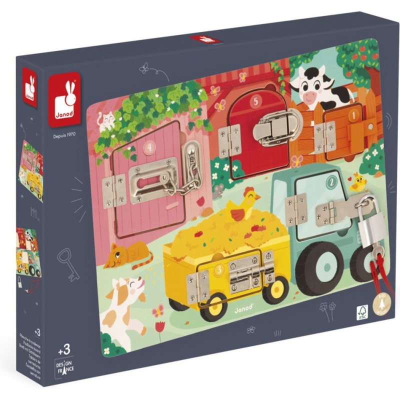 Serrures, verrous, clés ... les enfants adorent ! Alors quelle belle idée de leur proposer leur propre planche à cadenas pour découvrir, réfléchir, expérimenter avec les animaux de la ferme ! Pour découvrir tous les secrets de cette jolie busy board en bois, il faudra réussir à ouvrir les 5 portes fermées grâce à 5 systèmes différents : Clé, loquet, entrebâilleur à chaine, attache à bascule et verrou ! Chaque porte comporte sa propre couleur et son propre chiffre et celui-ci correspond au nombre de bébés animaux cachés derrière la porte ! De quoi s'amuser de plein de manières différentes ! Apprentissage des couleurs, des chiffres, connaissance des animaux de la ferme et de leurs bébés et développement de la dextérité et de la logique. Cette jolie planche d'activités éducatives en bois Fsc est idéale pour les enfants dès 3 ans.