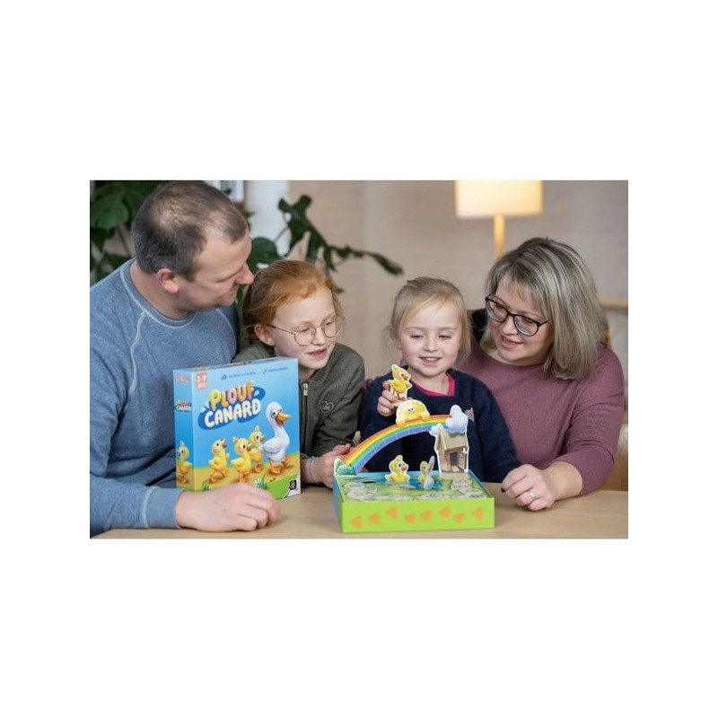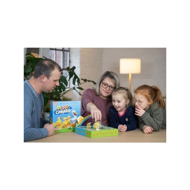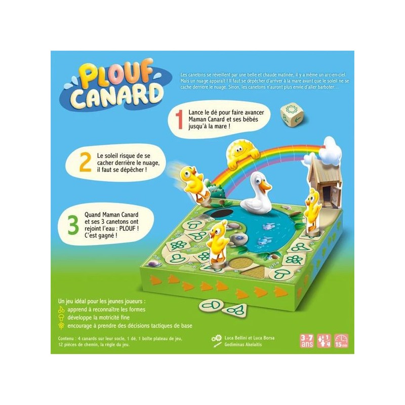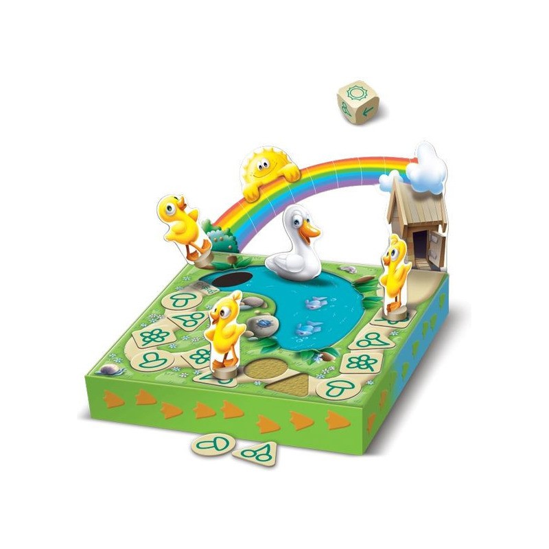 Jeu de parcours pour emmener les canards jusqu'à la mare avant que le soleil ne se cache derrière le nuage. Chaque joueur à son tour jette le dé et fait avancer la maman ou un caneton sur une case avec le symbole indiqué. Il ne peut y avoir qu'un canard par case, ce qui permet parfois de sauter des cases, si on choisit d'avancer celui qui est derrière!