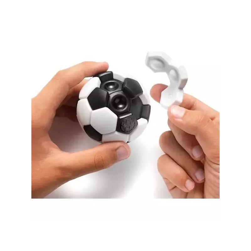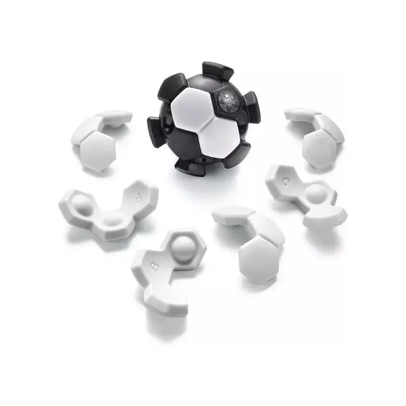 Étape 1 : Retirez toutes les pièces blanches du ballon de football et placez l’unique pièce de deux hexagones sur le ballon. Cette pièce de départ doit toujours couvrir une partie de l’ossature du ballon avec une alvéole et une partie lisse.