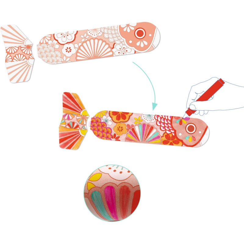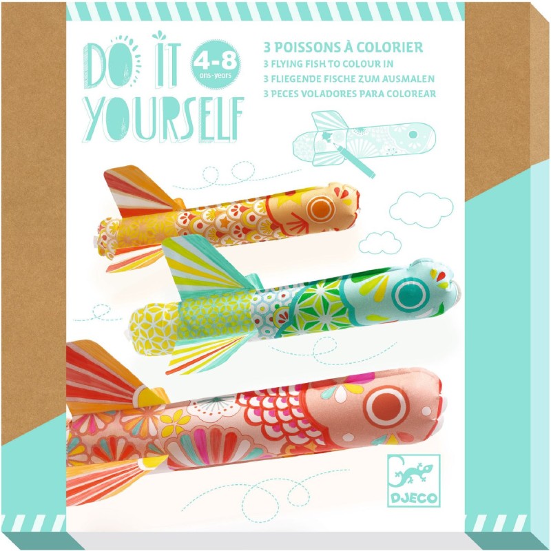 Un kit créatif avec 3 poissons volants gonflables à colorier. Les poissons se colorient simplement avec des feutres, se gonflent avec les pailles fournies, et volent dans les airs !