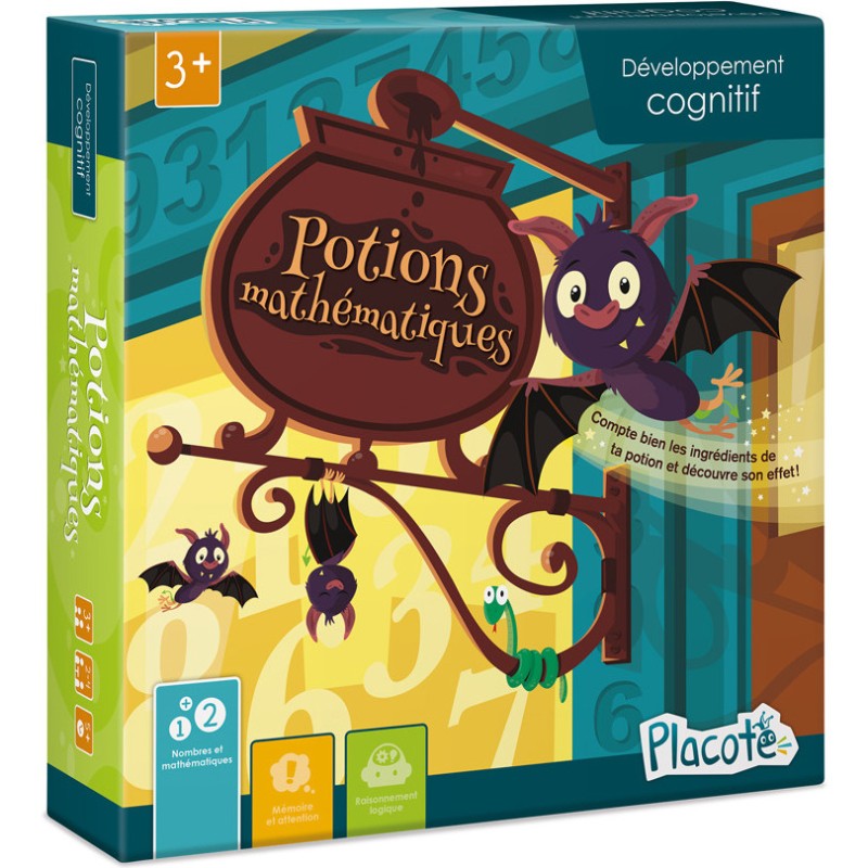 Potions mathématiques est conçu pour aider les enfants de 3 ans à 6½ ans à apprendre à compter et à reconnaitre les nombres écrits de 1 à 10. Le fait d’avoir à dénombrer des ingrédients farfelus comme des bananes pourries et des chaussettes qui puent les motive dans leur apprentissage.