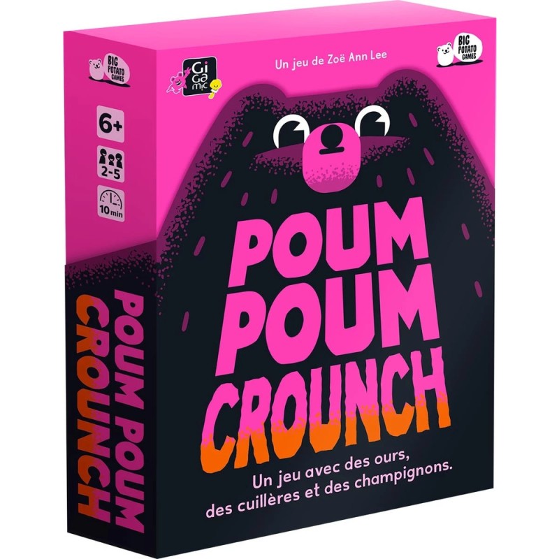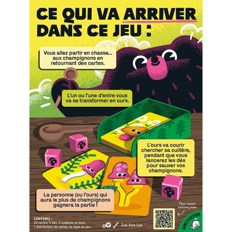 Au rythme du refrain "Poum Poum Crounch!", vous piochez des cartes avec des champignons que vous voulez dévorer. Mais si vous révélez un 3e ours, vous vous transformez, et foncez chercher la cuillère en bois pour tout rafler! Les autres tentent alors leur chance aux dés pour ne rien vous laisser... La personne (ou l'ours) qui a récupéré le plus de champignons au bout de 3 manches remporte la victoire!