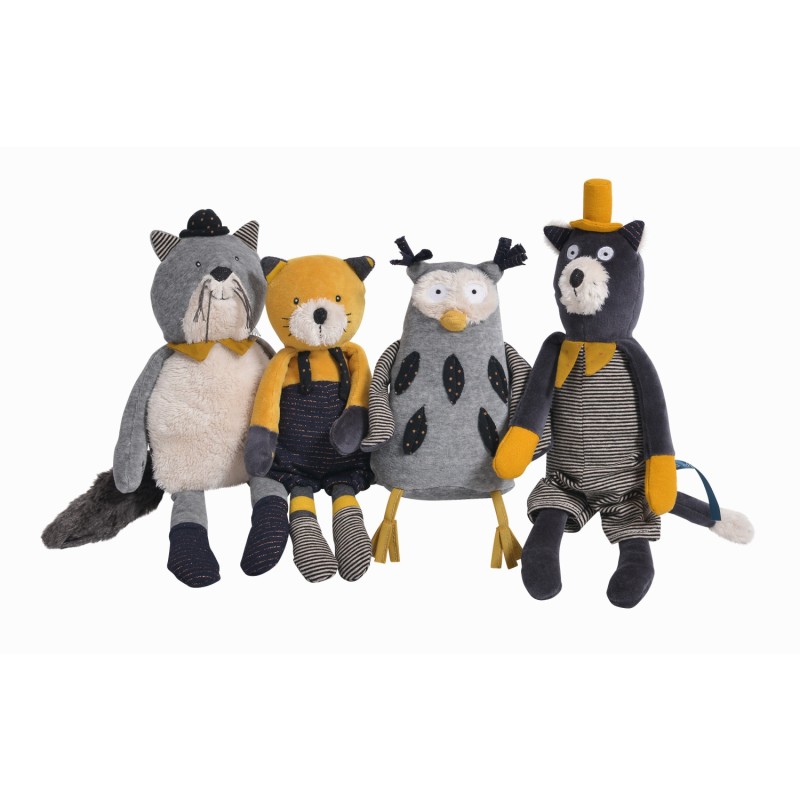 Tendre poupée chat en tissu tout doux et coloré. Petite et pratique, parfaite pour de gros câlins. Mais qui est ce tendre trio moustachu ? À la tombée de la nuit, les Moustaches jouent de la musique sur les toits, sous l’œil amusé de Monsieur Hibou, leur fidèle compagnon.