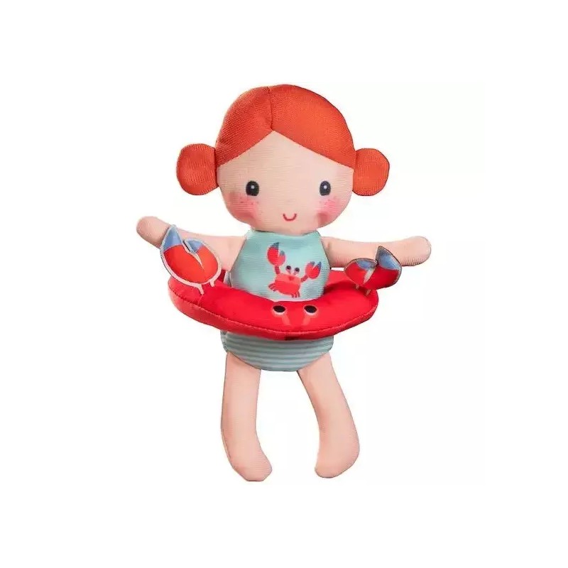 Cette poupée en polyester de 18 cm rendra l’heure du bain encore plus amusante ! Autour de sa taille se trouve une bouée rouge en forme de crabe.