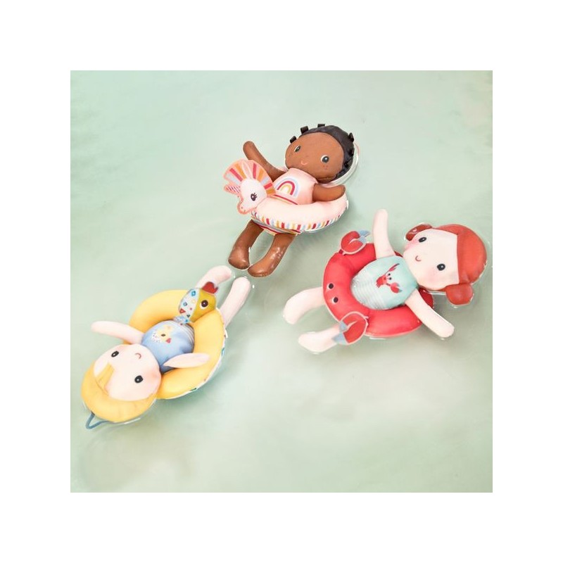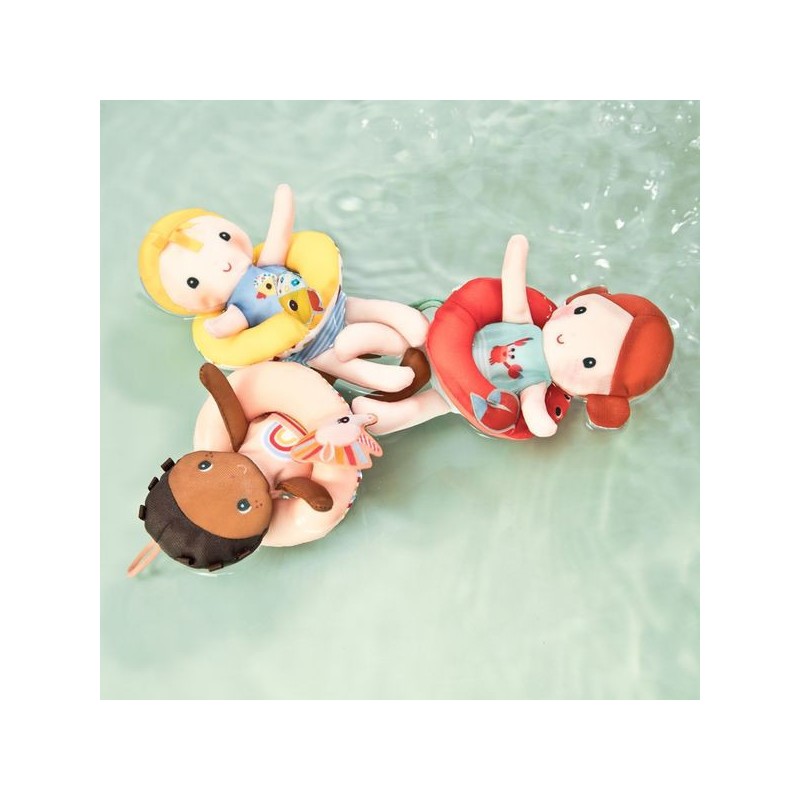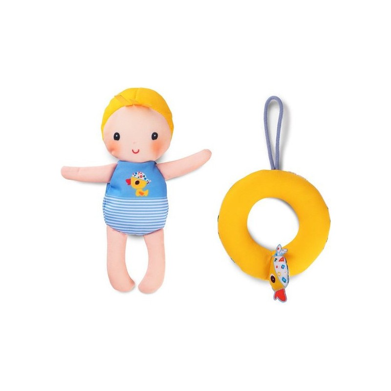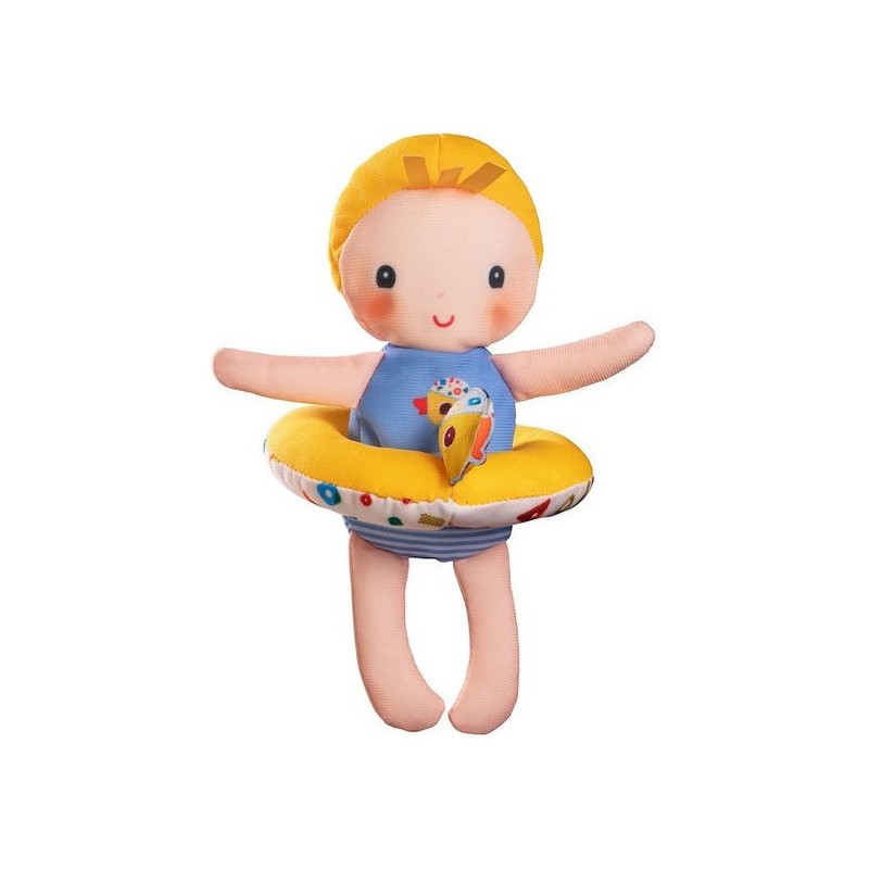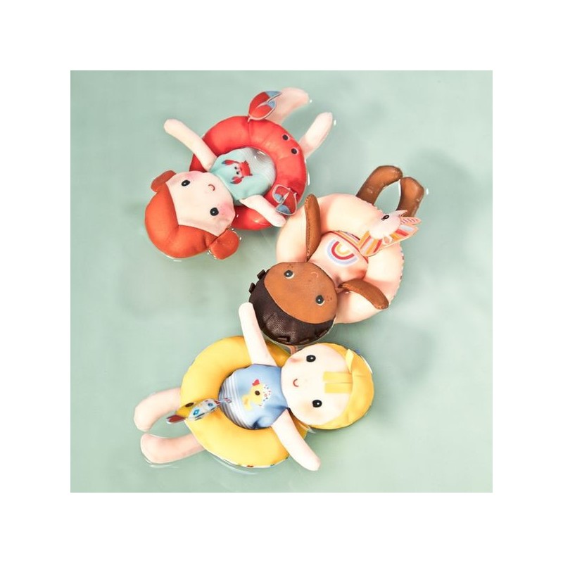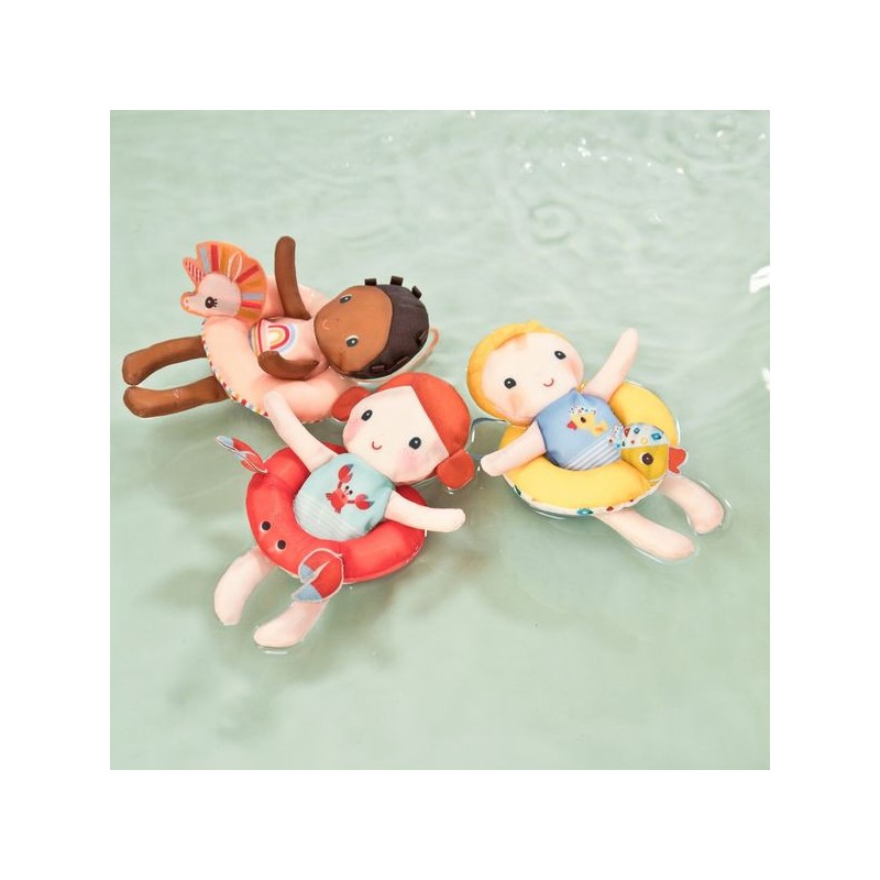 Cette poupée en polyester de 18 cm rendra l’heure du bain encore plus amusante ! Autour de sa taille se trouve une bouée jaune ornée d’une tête de canard.