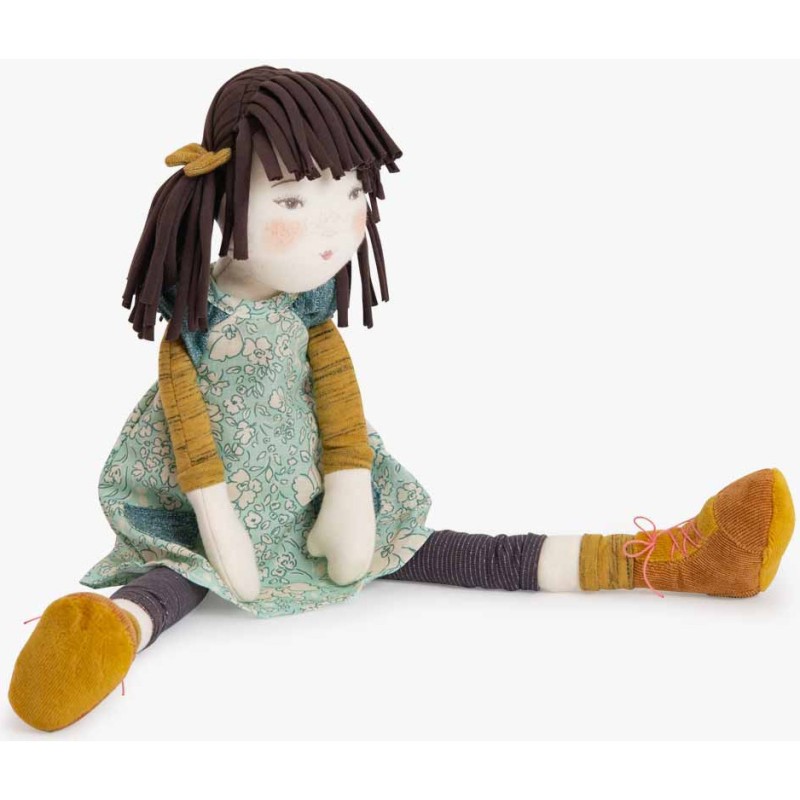 Grande poupée de chiffon Iris, au doux visage illustré et imprimé, avec de longs cheveux en jersey rouleauté noués en couettes. Elle est chaussée de bottines à lacets et vêtue d'une robe fleurie avec poches et legging tissés de fil cuivré.