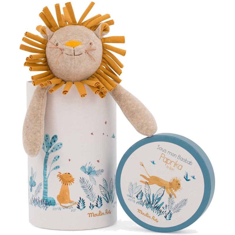 Paprika le lion nous offre un grand sourire et plein de curiosités au toucher : de longues pattes à attraper, une crinière et des moustaches à tortiller, et un corps moelleux pour se reposer… Il est installé dans une jolie boîte cadeau toute en rondeur. Sous mon Baobab haut comme le ciel, la savane s’éveille… Suivez Paprika le lion, Bibiscus la girafe et Bergamote l’éléphant au cœur d’une collection particulièrement destinée aux cadeaux de naissance.