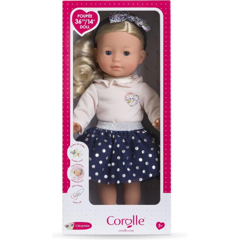 Cléophée est une poupée ma Corolle de 36 cm. Elle a un corps souple, avec une toile de corps « effet » sous-vêtements, et de longs cheveux blonds et bouclés, faciles à coiffer. Cette poupée a la peau claire et les yeux bleus. Son visage, ses bras et ses jambes sont en vinyle doux au toucher, avec cette délicate senteur de vanille, signature Corolle.