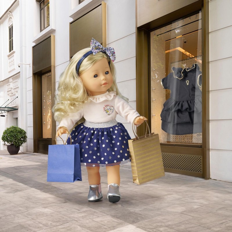 Réaliste, elle ferme ses yeux quand on la couche sur le dos. Cléophée est habillée d'un joli sweat beige avec une collerette et d'une élégante jupe en tulle bleu marine à pois argentés. Pour parfaire sa tenue, elle porte une paire de bottines argentées et un serre-tête bleu marine avec un nœud fleuri assorti à sa tenue.