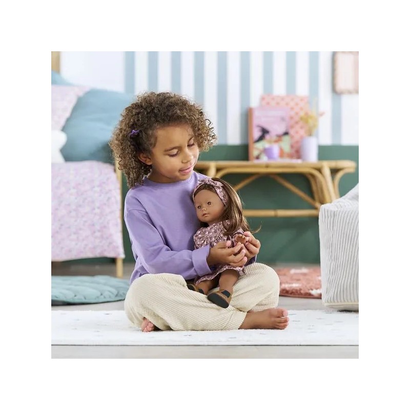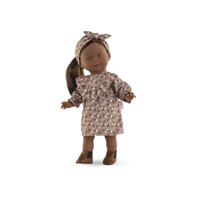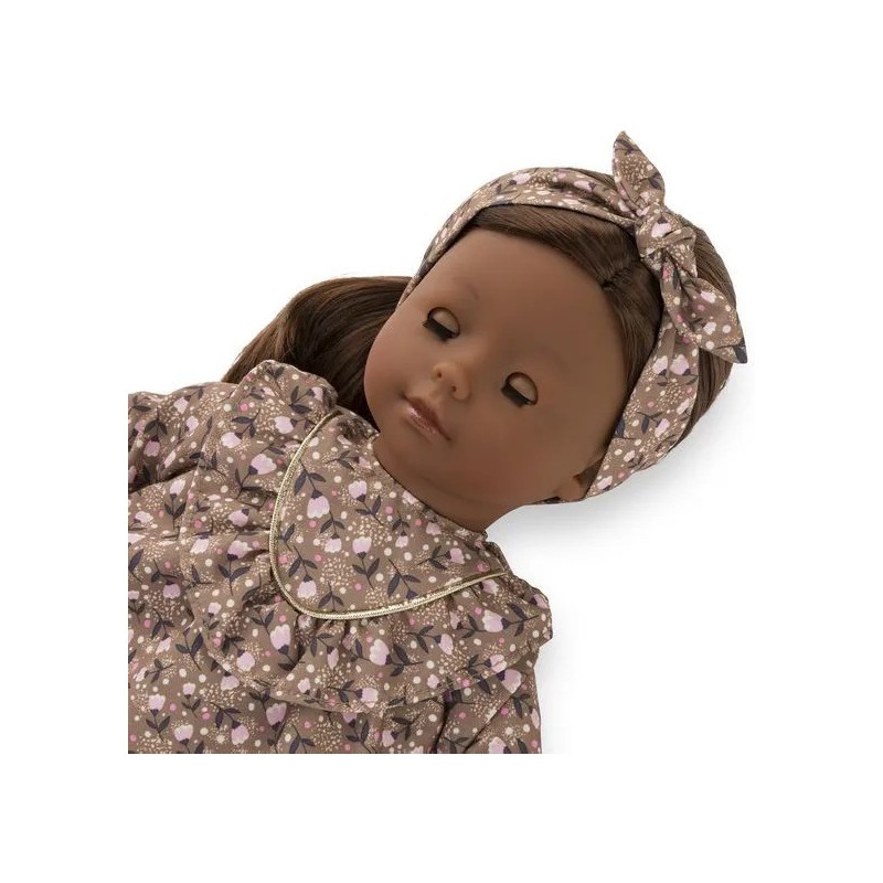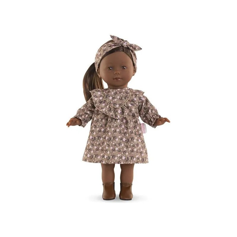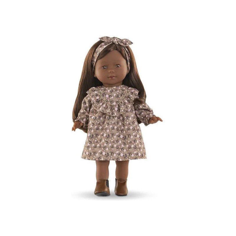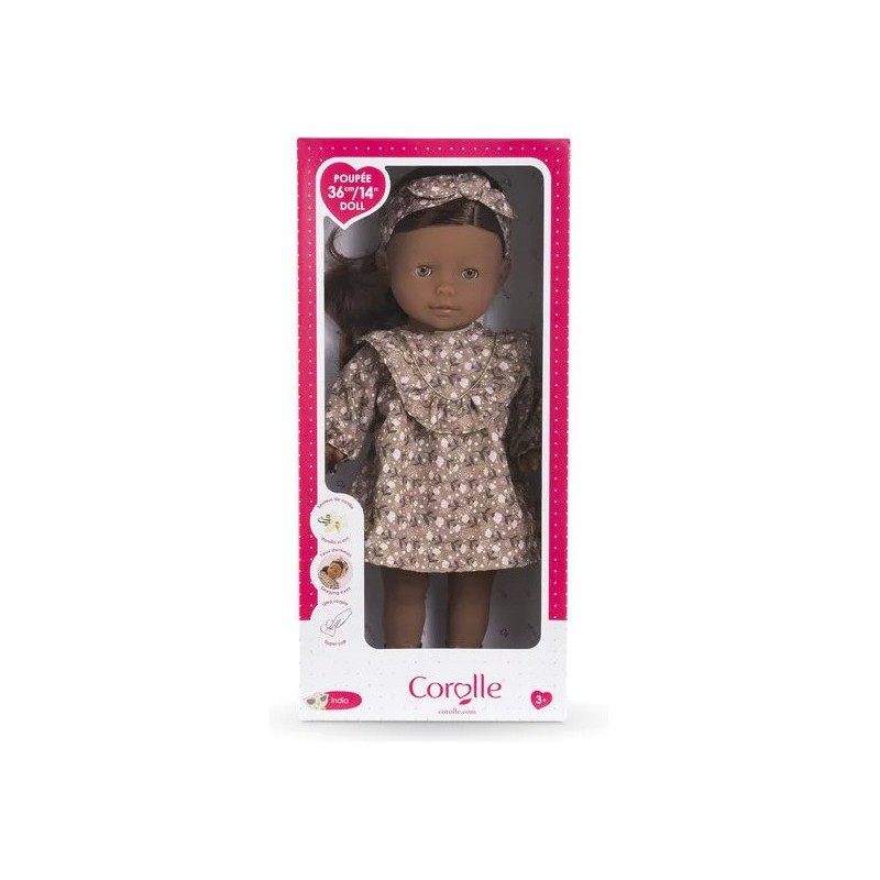 Ils diffusent la délicate senteur de vanille, véritable signature Corolle. Cette poupée réaliste, ferme ses yeux lorsqu'on la couche sur le dos. India est habillée d'une jolie robe marron à fleurs, ornée d'un col travaillé et est coiffée d'un joli bandeau à noeud assorti à sa robe.