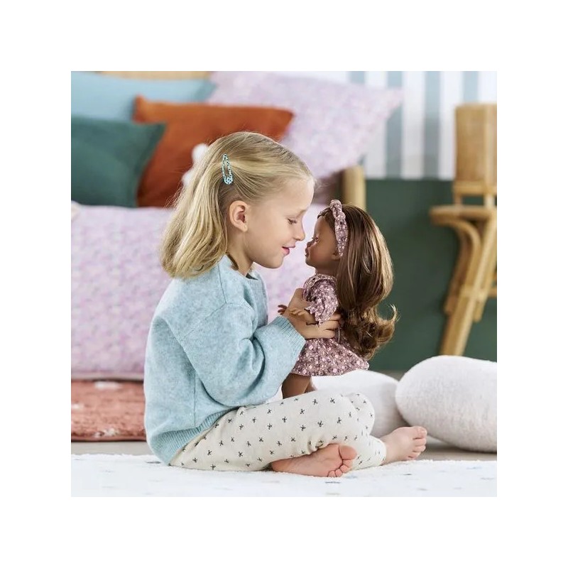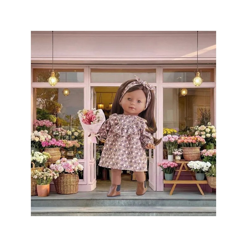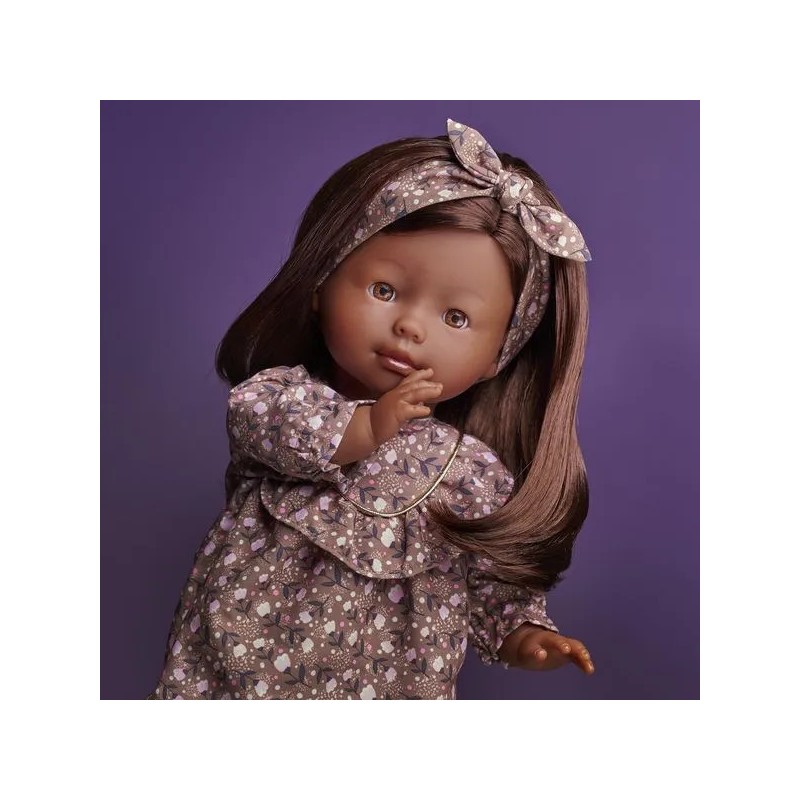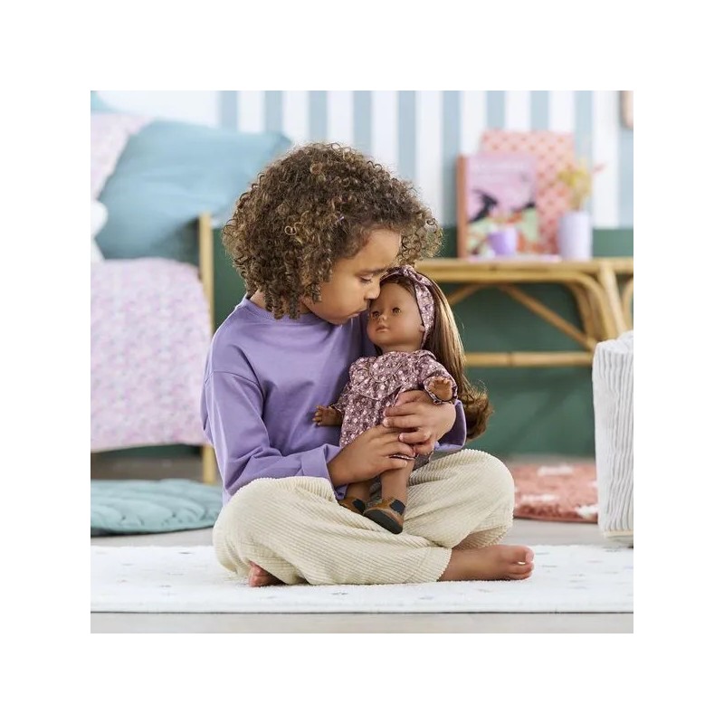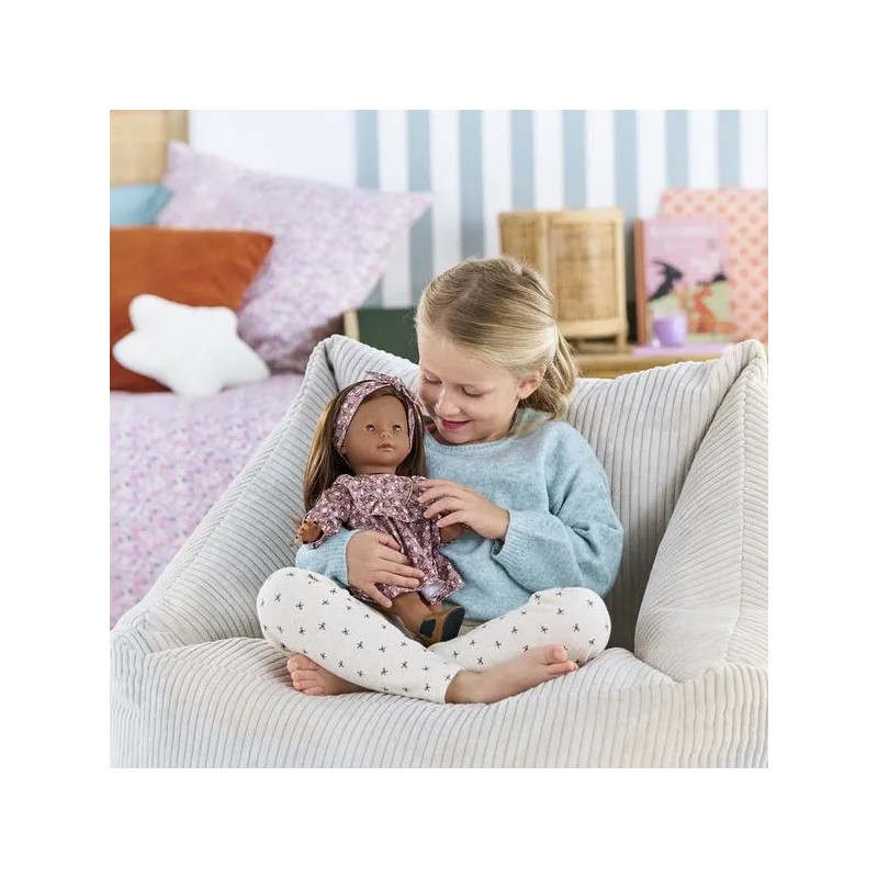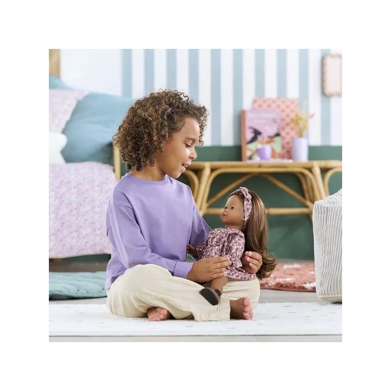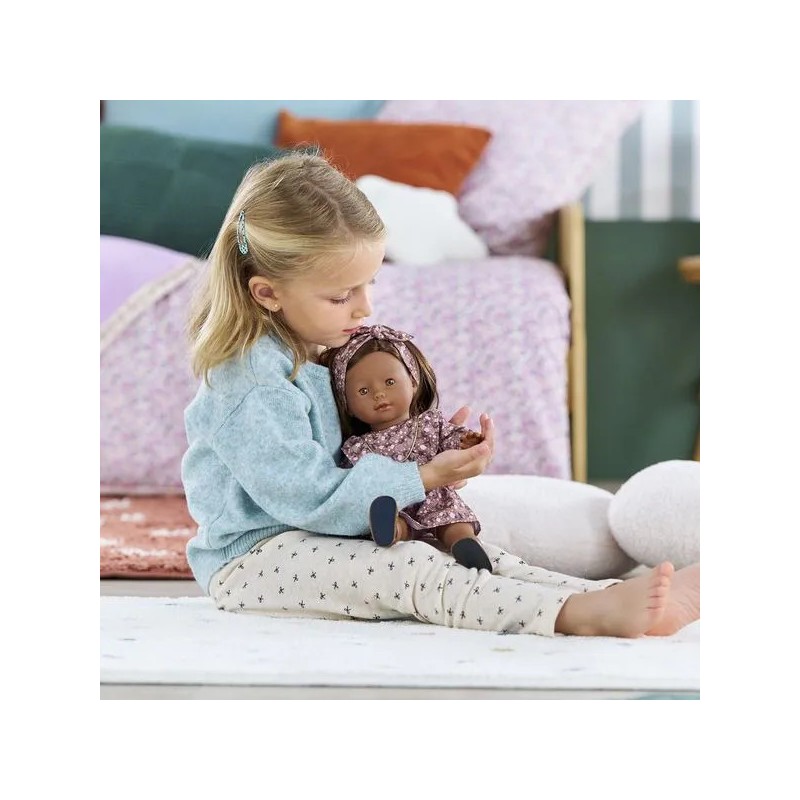 Ils diffusent la délicate senteur de vanille, véritable signature Corolle. Cette poupée réaliste, ferme ses yeux lorsqu'on la couche sur le dos. India est habillée d'une jolie robe marron à fleurs, ornée d'un col travaillé et est coiffée d'un joli bandeau à noeud assorti à sa robe.