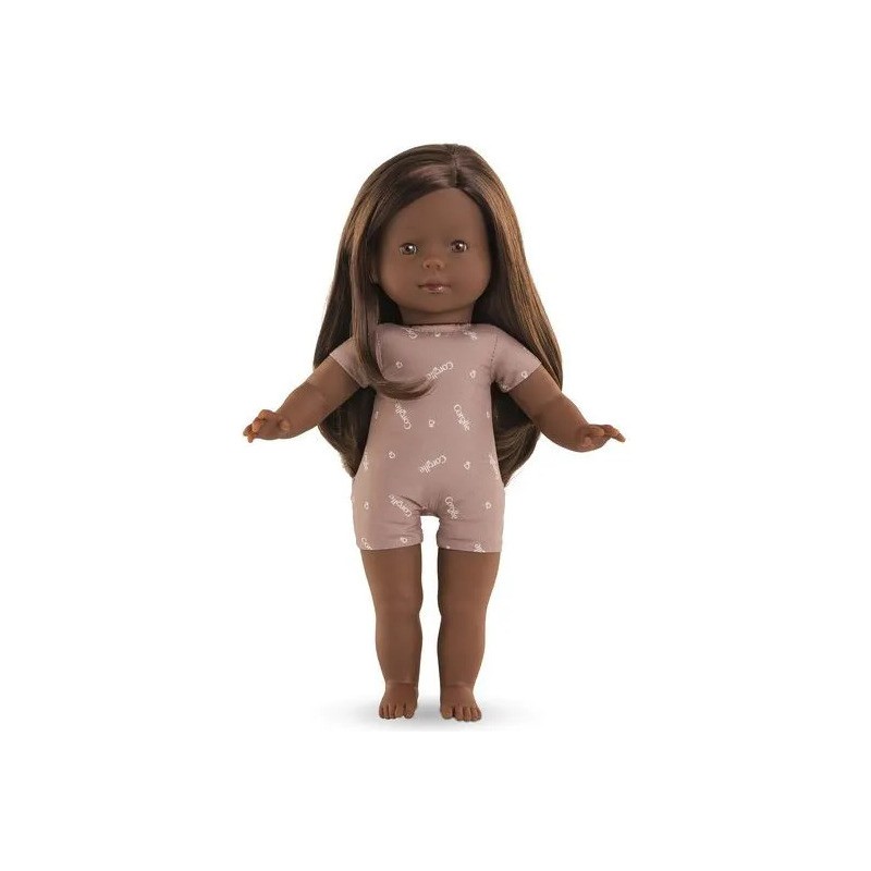 India est une poupée ma Corolle de 36 cm. Elle a le corps souple, avec une toile de corps à imprimé fleuri, et des longs cheveux bruns, faciles à coiffer. Cette poupée à la peau métisse et les yeux marron. Son visage, ses bras et ses jambes, sont en vinyle doux au toucher.