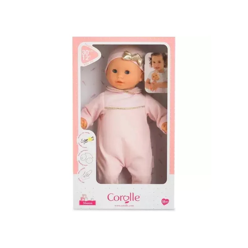 Bébé Calin Manon est un petit poupon de 30 cm, la taille parfaitement adaptée aux petits bras et mains de l'enfant pour le manipuler.