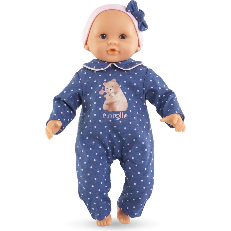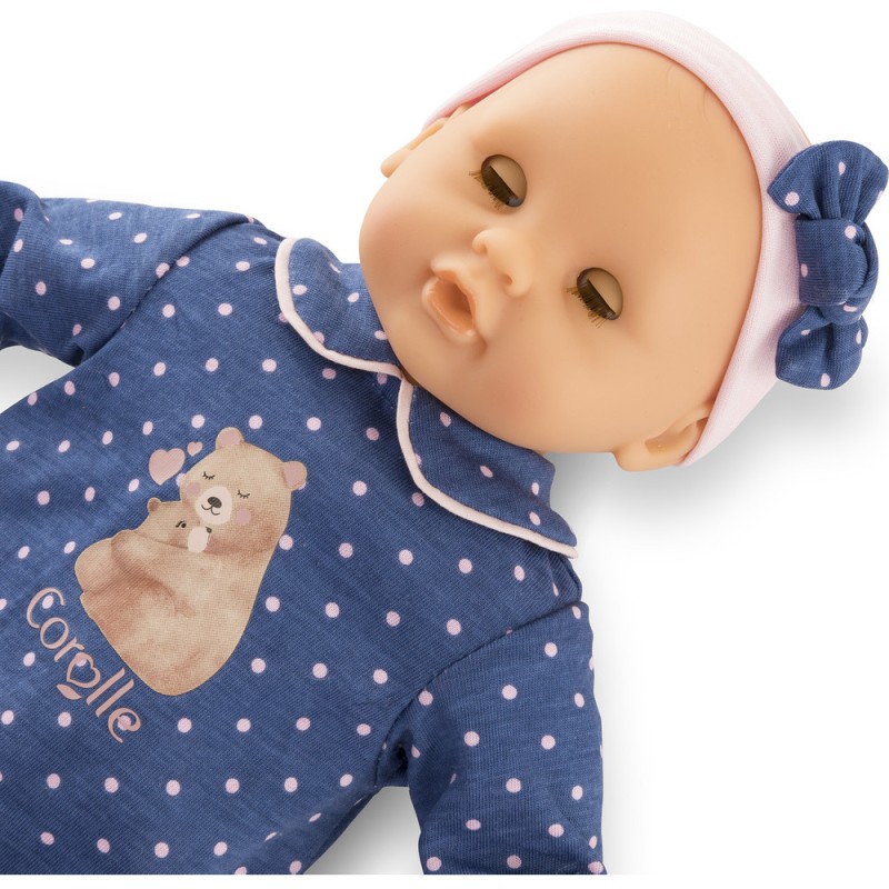Il est coiffé d'un bandeau rose au noeud assorti. Une tendre sérigraphie ourson est aposée sur le devant du pyjama. Votre enfant pourra facilement habiller et déshabiller Capucine grâce aux bandes auto-agrippantes de son pyjama. Comme tous les Bébés Calin, Capucine dispose d'une collection variée de vêtements et d'accessoires dans la gamme mon premier poupon Corolle.