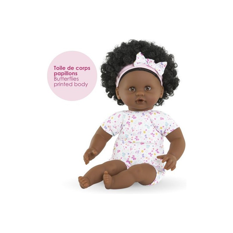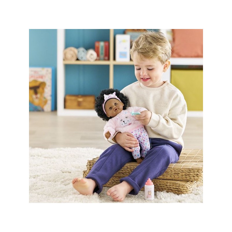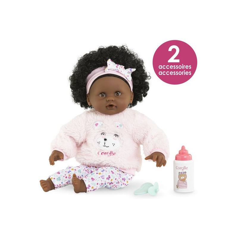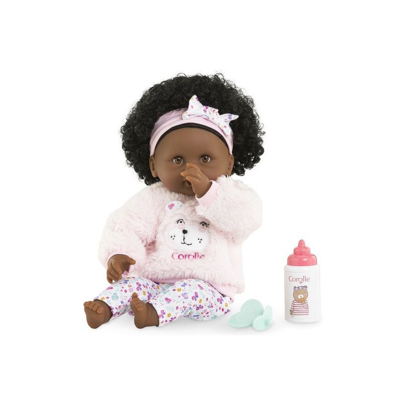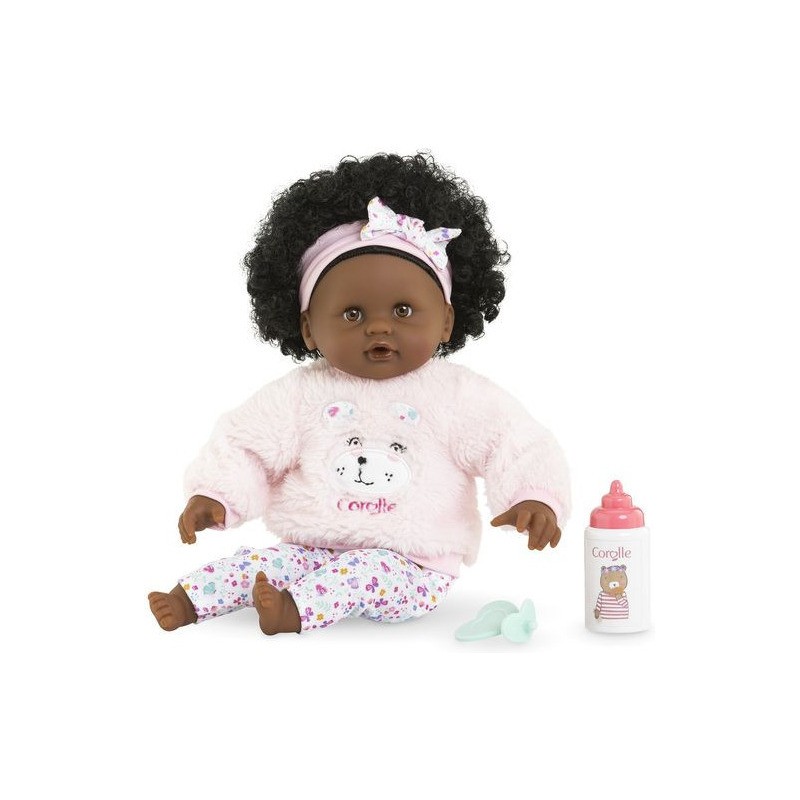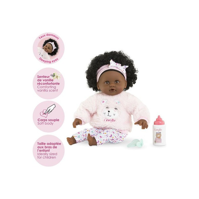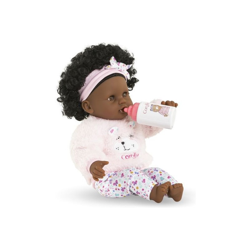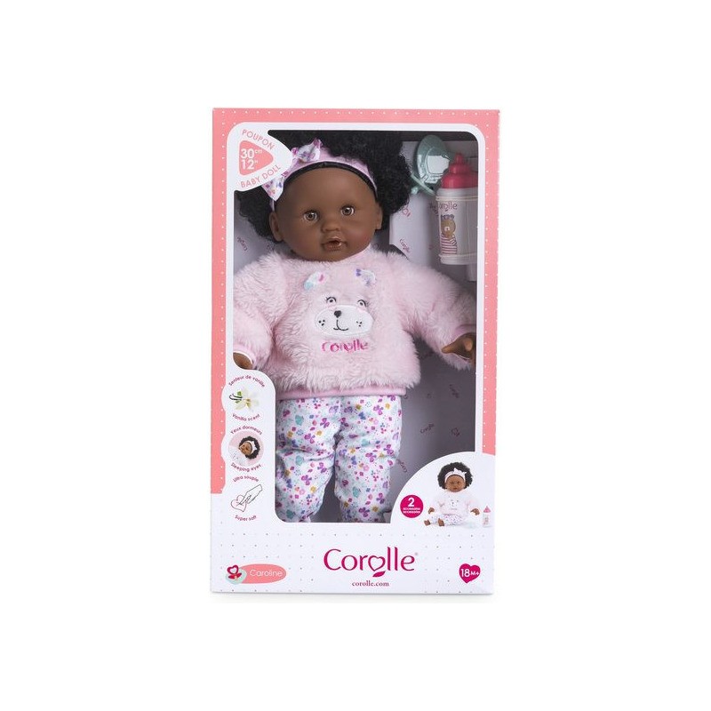 Bébé Calin Caroline est un petit poupon de 30 cm, la taille parfaitement adaptée aux petits bras et mains de l'enfant pour le manipuler. Son corps souple lui permet de prendre les mêmes positions qu'un vrai bébé. Son visage, ses bras et ses jambes, à la délicate senteur de vanille, sont en vinyle doux au toucher. Avec ses yeux dormeurs, il fait dodo quand on le couche sur le dos. Ce petit poupon a la peau foncée, des yeux noisette et des cheveux noirs frisés. Il est habillé d'une tenue sportswear composée d'un sweat peluche tout doux avec une jolie tête d'ourson brodée et d'un legging à motifs. Bébé Calin Caroline porte un bandeau dans ses cheveux frisés. Une fois que l'on a retiré ses vêtements, on peut y découvrir le tissu inédit aux motifs de papillons et de fleurs sur sa toile de corps. Ce poupon est accompagné de deux accessoires : sa tétine et son biberon permettant de bien s'occuper de lui. Bébé Calin Caroline dispose d'une collection variée de vêtements et d'accessoires dans la gamme mon premier poupon Corolle pour pouponner pour la première fois. Dès 18 mois.