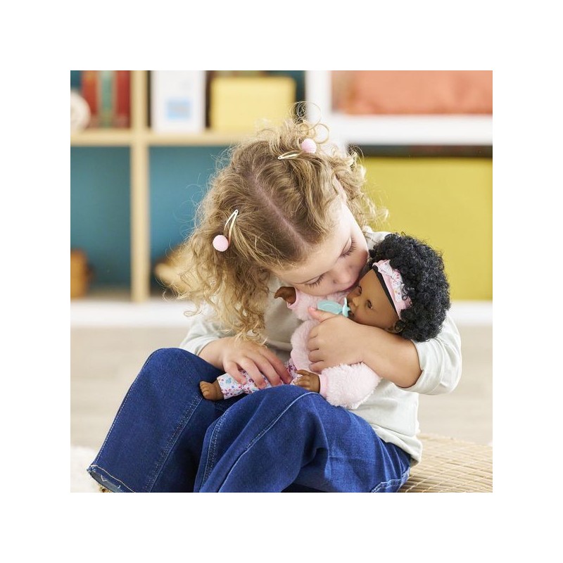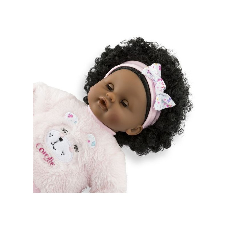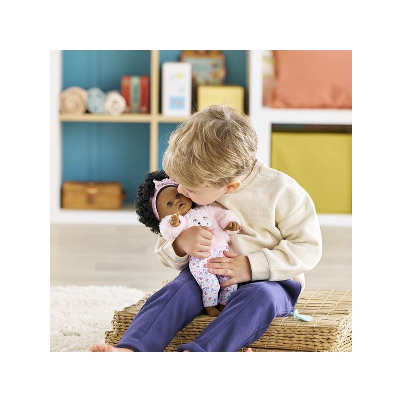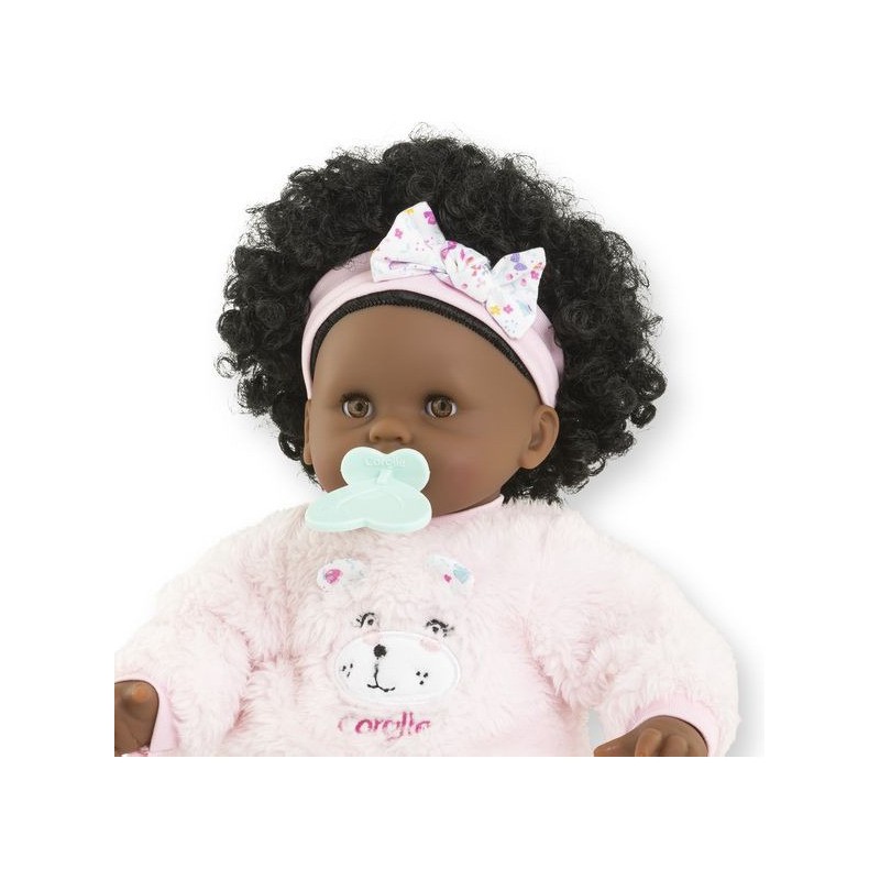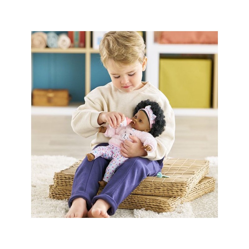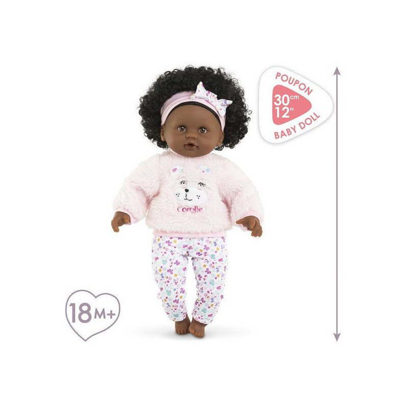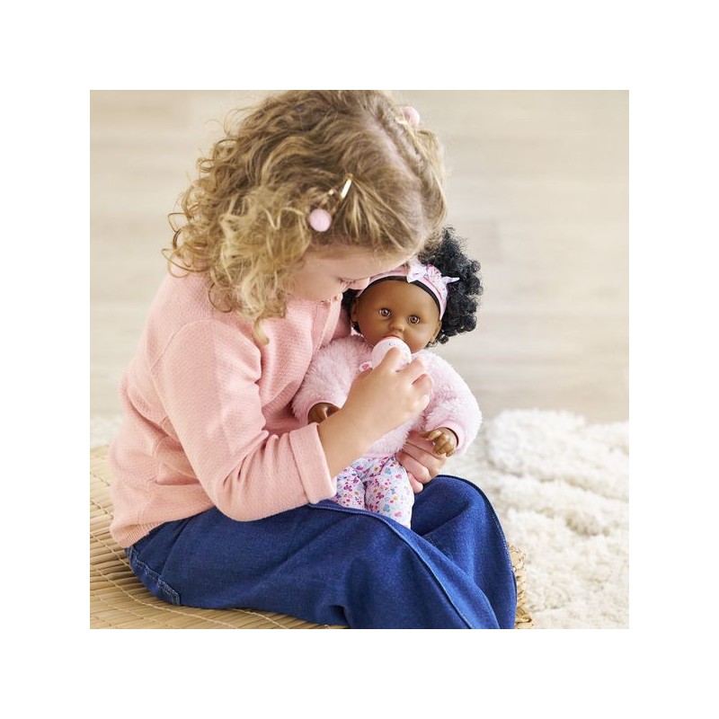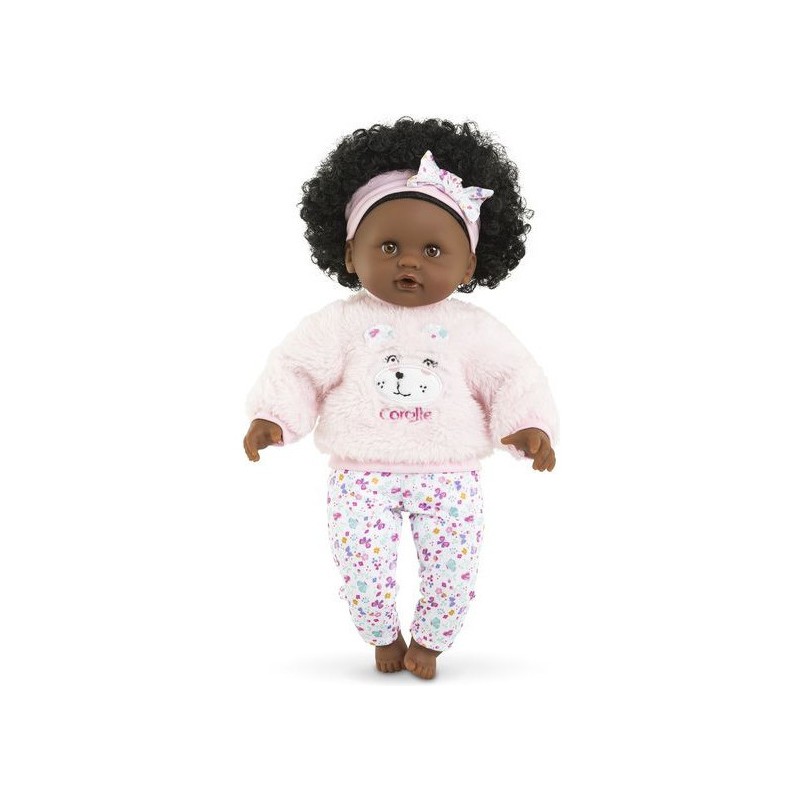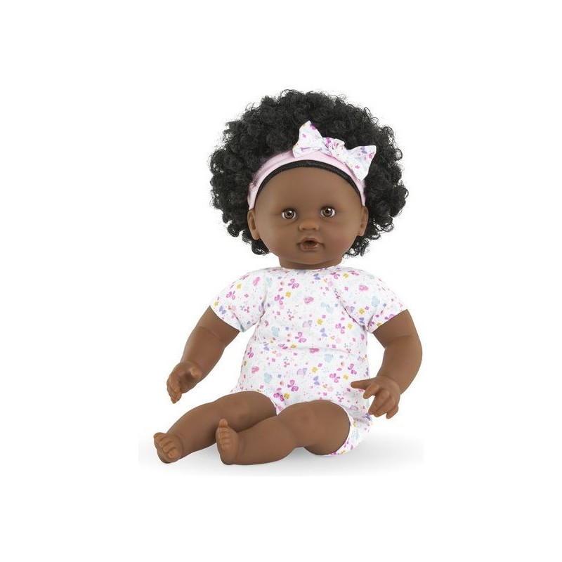 Bébé Calin Caroline est un petit poupon de 30 cm, la taille parfaitement adaptée aux petits bras et mains de l'enfant pour le manipuler. Son corps souple lui permet de prendre les mêmes positions qu'un vrai bébé. Son visage, ses bras et ses jambes, à la délicate senteur de vanille, sont en vinyle doux au toucher. Avec ses yeux dormeurs, il fait dodo quand on le couche sur le dos. Ce petit poupon a la peau foncée, des yeux noisette et des cheveux noirs frisés. Il est habillé d'une tenue sportswear composée d'un sweat peluche tout doux avec une jolie tête d'ourson brodée et d'un legging à motifs. Bébé Calin Caroline porte un bandeau dans ses cheveux frisés. Une fois que l'on a retiré ses vêtements, on peut y découvrir le tissu inédit aux motifs de papillons et de fleurs sur sa toile de corps. Ce poupon est accompagné de deux accessoires : sa tétine et son biberon permettant de bien s'occuper de lui. Bébé Calin Caroline dispose d'une collection variée de vêtements et d'accessoires dans la gamme mon premier poupon Corolle pour pouponner pour la première fois. Dès 18 mois.
