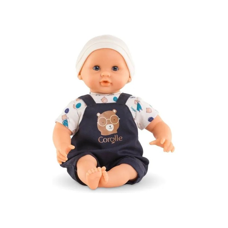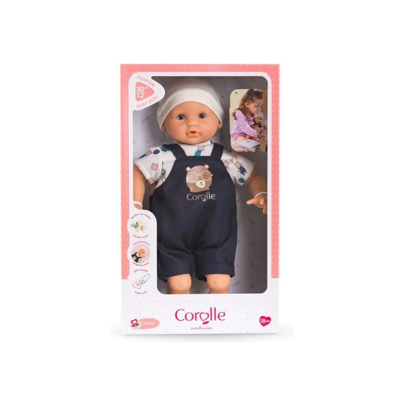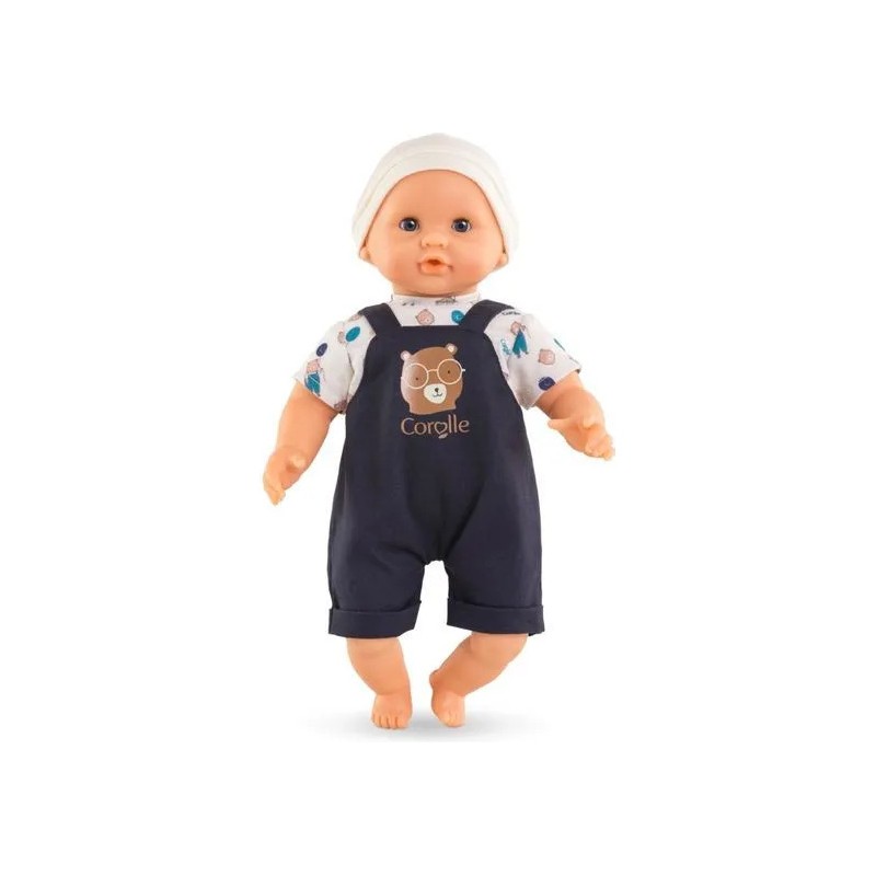 Maël possède bien sûr tous les attributs d'un poupon Corolle : son visage, ses bras et ses jambes sont en vinyle doux au toucher, et possèdent une délicate senteur de vanille, réconfortante pour les enfants. Ce petit poupon, à la peau blanche et aux yeux bleus, est habillé d'une tenue 2-1 composée : d'une jolie salopette bleu marine avec une sérigraphie d'un ourson tout mignon et d'un t-shirt à l'imprimé exclusif oursons.