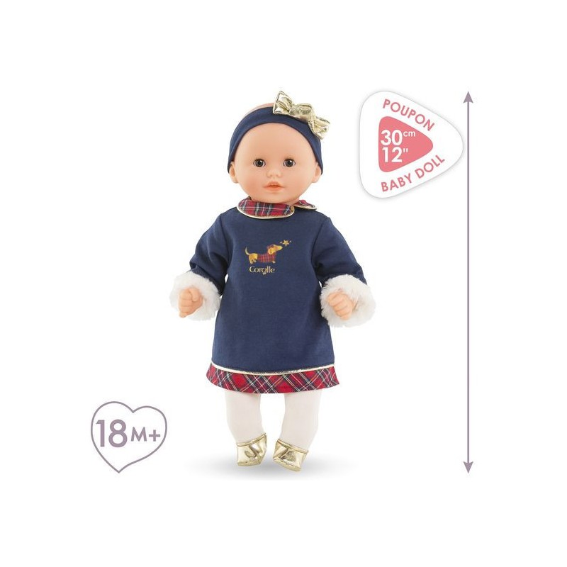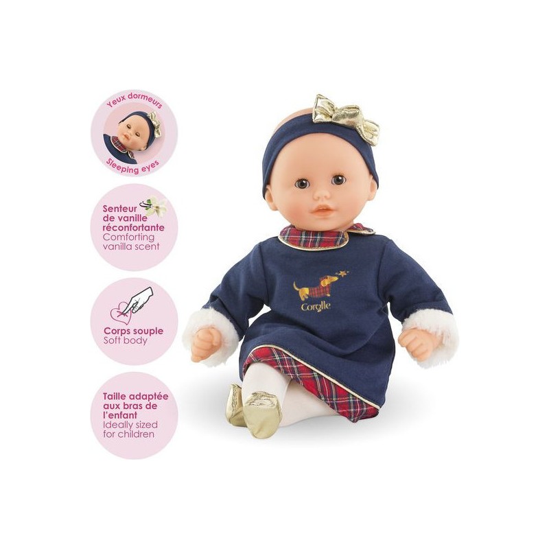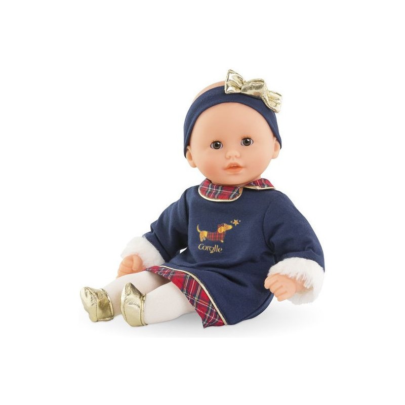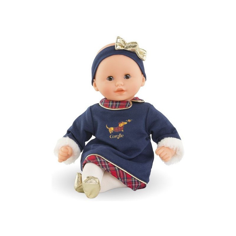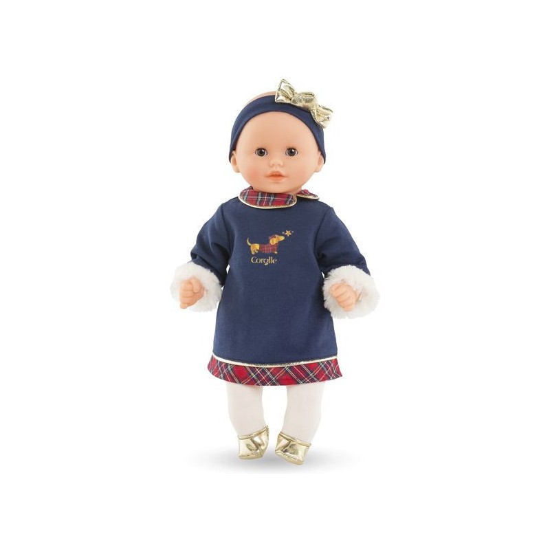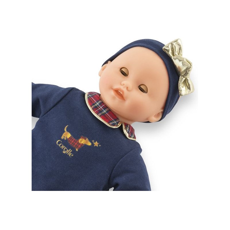 Ce poupon est habillé pour les fêtes avec une magnifique robe bleu marine à manches longues ornée de manchettes en imitation fourrure blanche toute douce. Des touches de tissu écossais décorent le col claudine et l'ourlet de la robe, tandis que quelques détails dorés illuminent l'ensemble. Une sérigraphie pailletée d'un petit teckel en manteau écossais ajoute une note adorable. Pour compléter sa tenue, Bébé Calin Margaux Corolle en Fêtes porte un ensemble collant couleur crème et des ballerines dorées tout-un. Il est coiffé d'un bandeau assorti avec un nœud doré élégant.