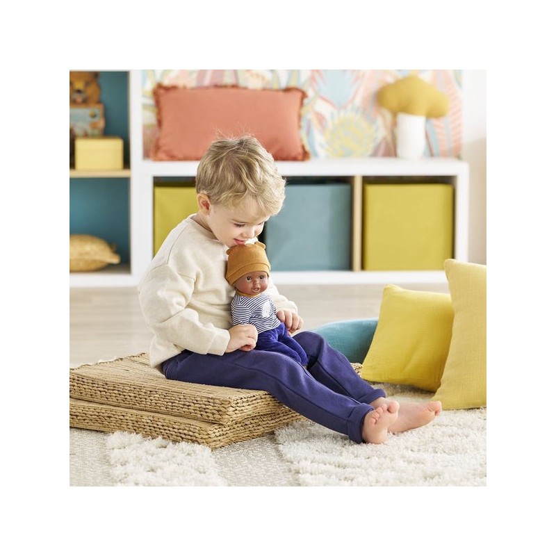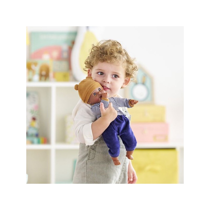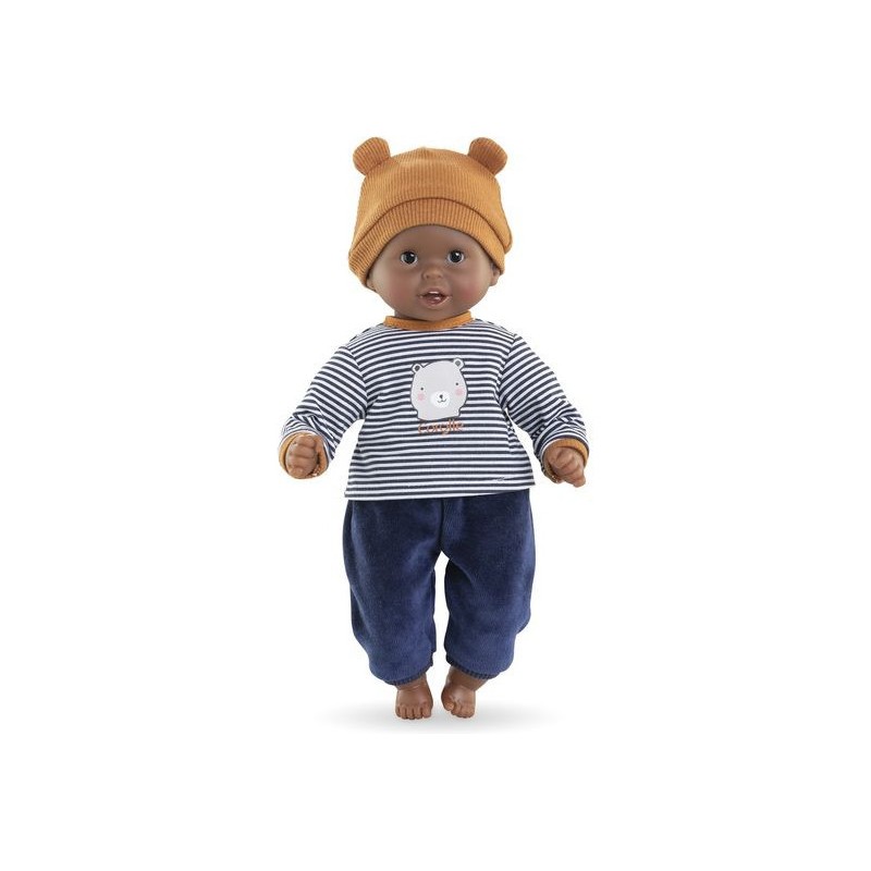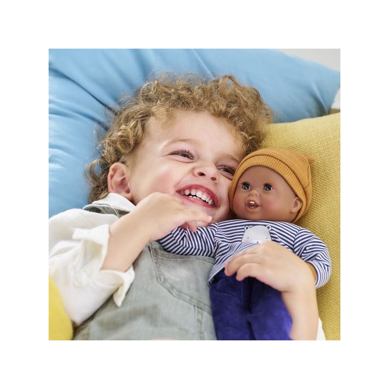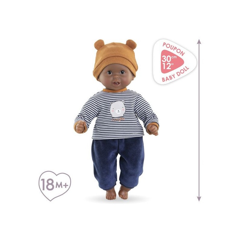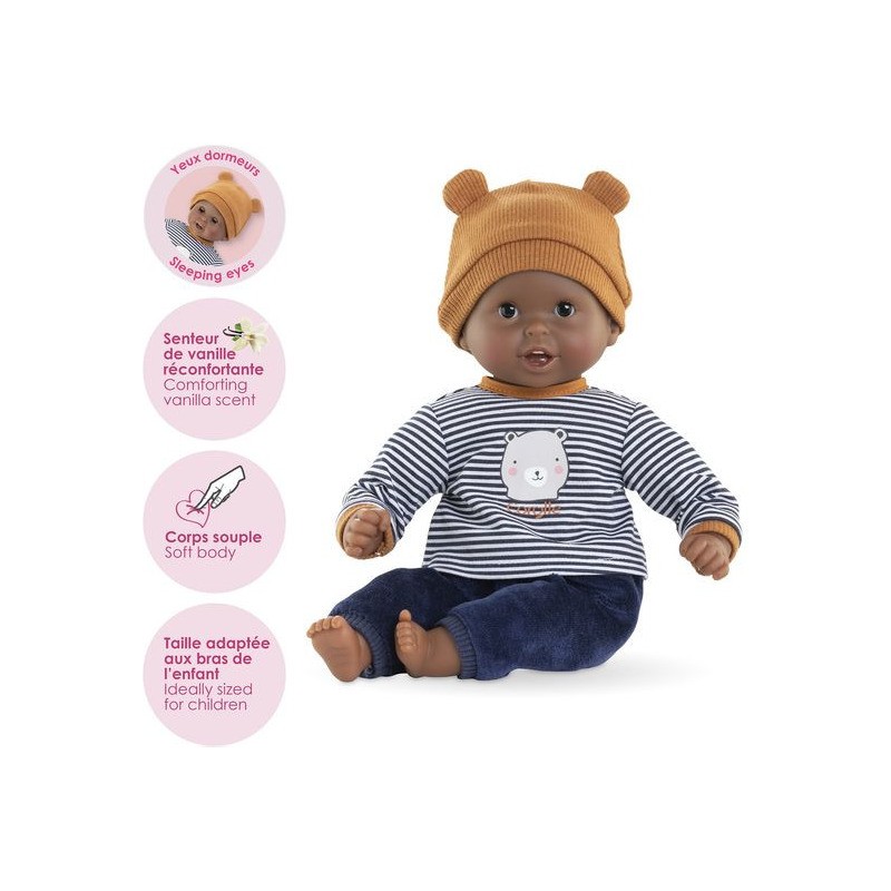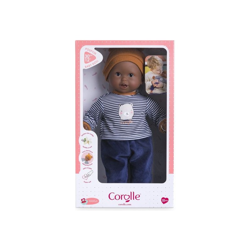 Bébé Calin Marius est un petit poupon de 30 cm, la taille parfaitement adaptée aux petits bras et mains de l'enfant pour le manipuler. Son corps souple lui permet de prendre les mêmes positions qu'un vrai bébé. Ce petit poupon a la peau foncée avec des yeux noirs. Son visage, ses bras et ses jambes, à la délicate senteur de vanille, sont en vinyle doux au toucher. Avec ses yeux dormeurs, il fait dodo quand on le couche sur le dos. Il est habillé d'un pyjama 2 pièces, composé d'un t-shirt marinière manches longues et d'un pantalon tout doux en velours bleu marine. Marius porte un bonnet avec deux petites oreilles d'ours trop mignonnes. Comme tous les petits poupons de la gamme mon premier poupon Corolle, Bébé Calin Marius dispose d'une collection variée de vêtements et d'accessoires pour pouponner pour la première fois. Dès 18 mois.