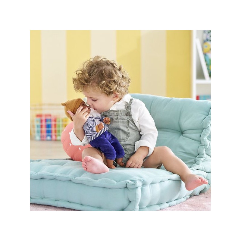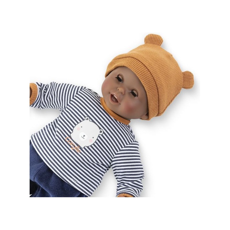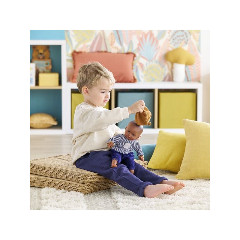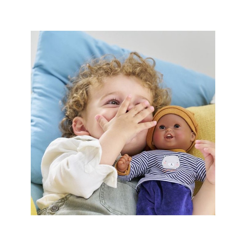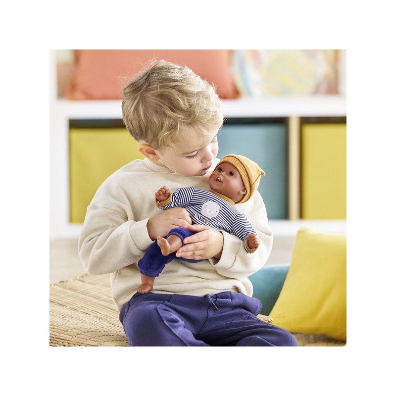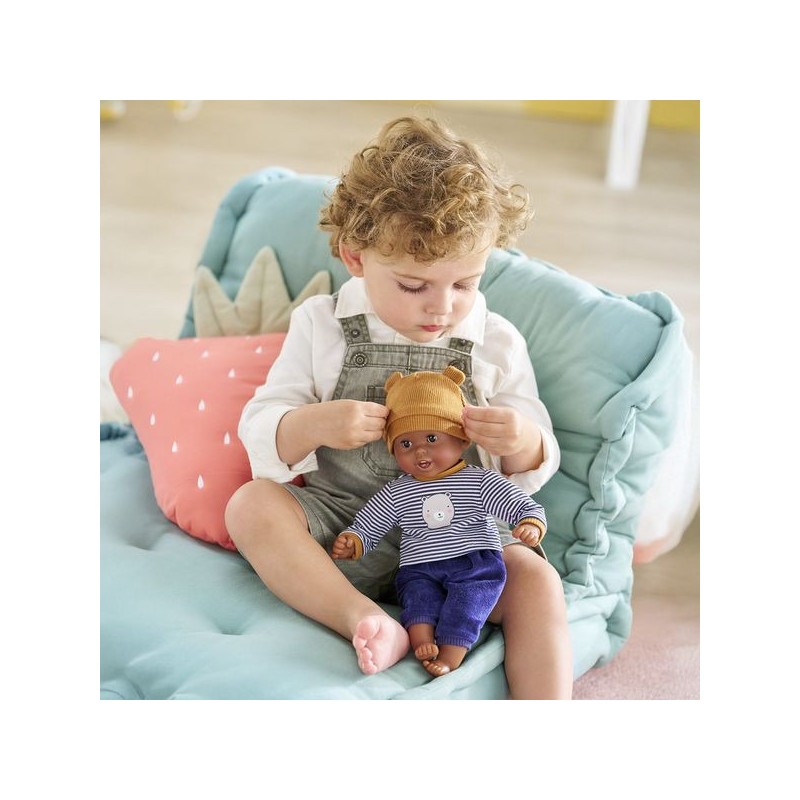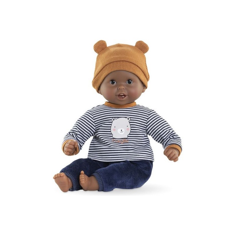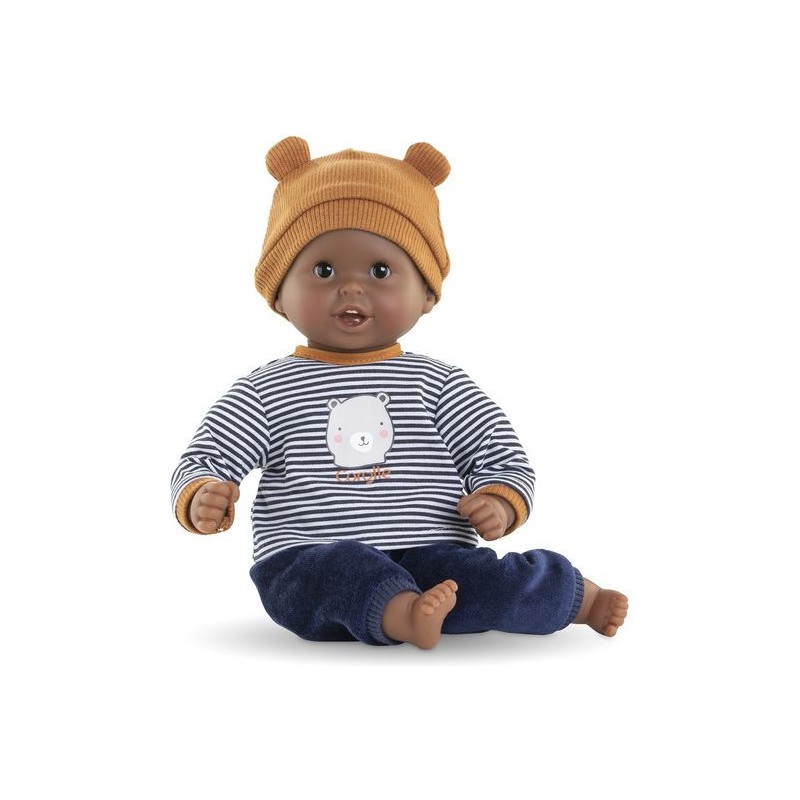 Bébé Calin Marius est un petit poupon de 30 cm, la taille parfaitement adaptée aux petits bras et mains de l'enfant pour le manipuler. Son corps souple lui permet de prendre les mêmes positions qu'un vrai bébé. Ce petit poupon a la peau foncée avec des yeux noirs. Son visage, ses bras et ses jambes, à la délicate senteur de vanille, sont en vinyle doux au toucher. Avec ses yeux dormeurs, il fait dodo quand on le couche sur le dos. Il est habillé d'un pyjama 2 pièces, composé d'un t-shirt marinière manches longues et d'un pantalon tout doux en velours bleu marine. Marius porte un bonnet avec deux petites oreilles d'ours trop mignonnes. Comme tous les petits poupons de la gamme mon premier poupon Corolle, Bébé Calin Marius dispose d'une collection variée de vêtements et d'accessoires pour pouponner pour la première fois. Dès 18 mois.