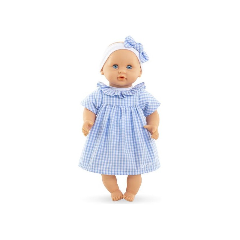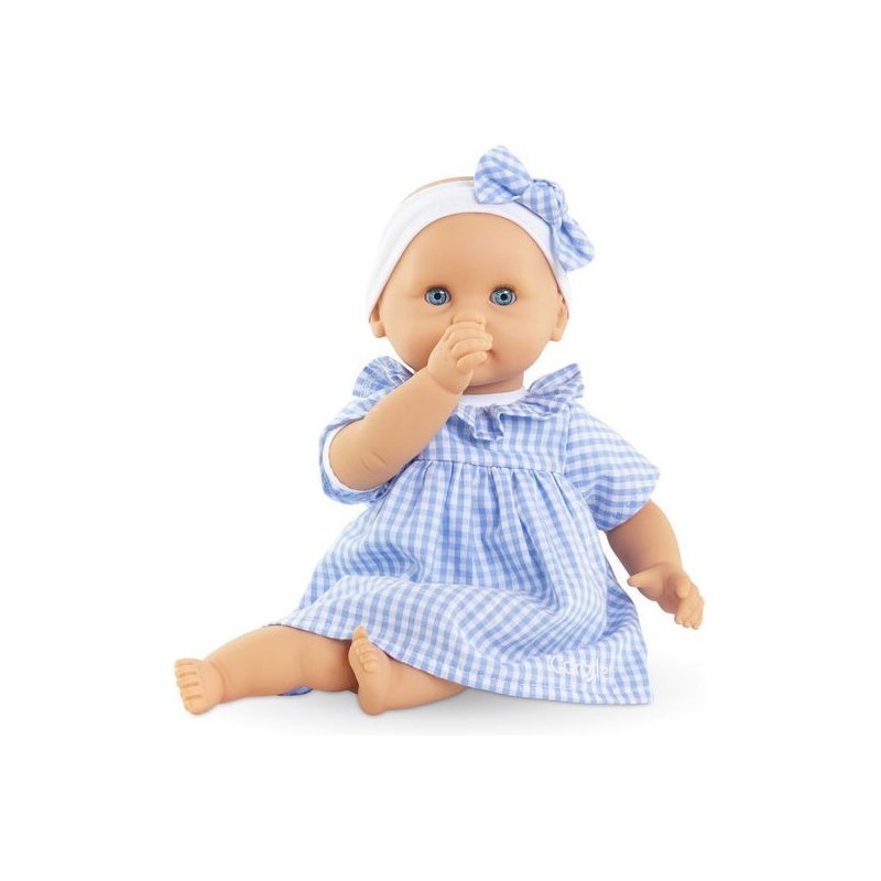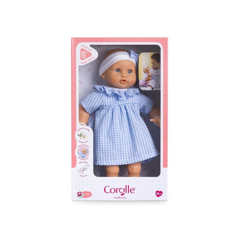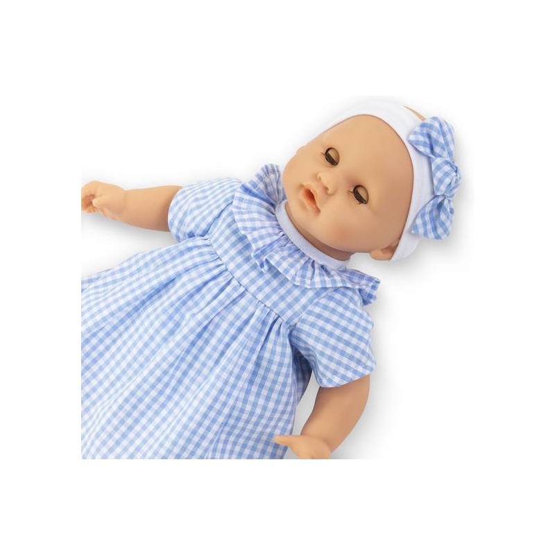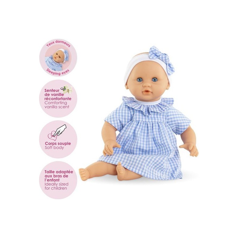Bébé Calin Milly est habillé d'une robe en vichy bleu avec une collerette et coiffé d'un bandeau assorti. Comme tous les petits poupons de la gamme mon premier poupon Corolle, Bébé Calin Milly dispose d'une collection variée de vêtements et d'accessoires pour pouponner pour la première fois.