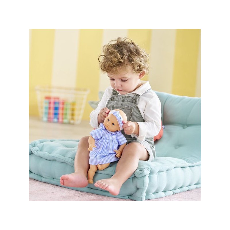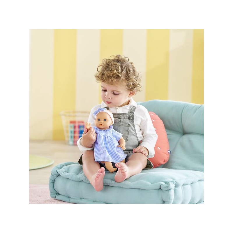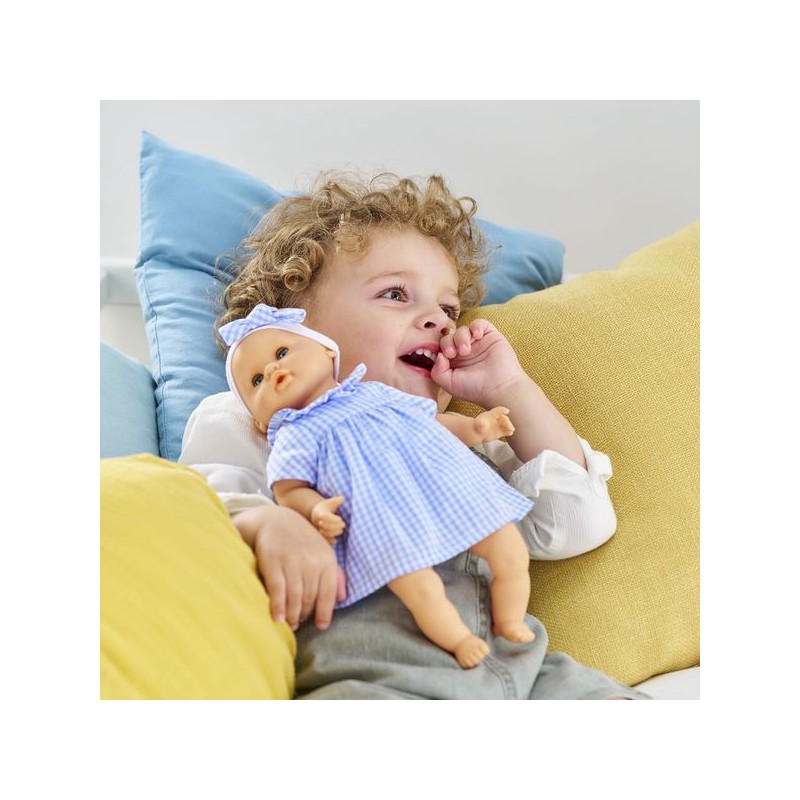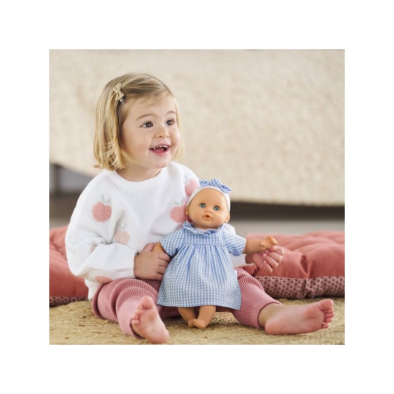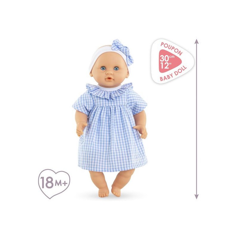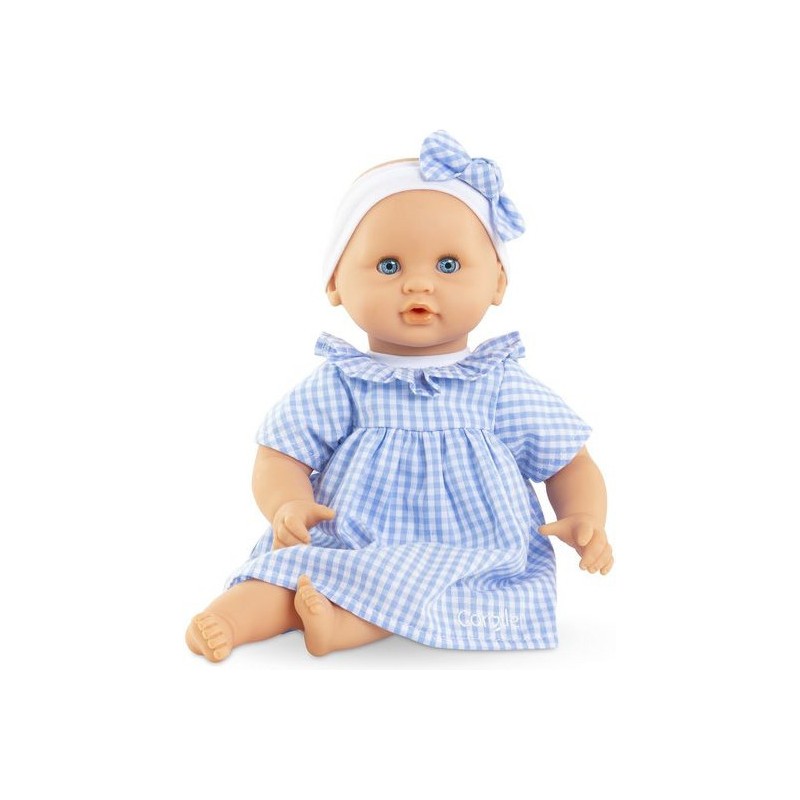 Bébé Calin Milly est habillé d'une robe en vichy bleu avec une collerette et coiffé d'un bandeau assorti. Comme tous les petits poupons de la gamme mon premier poupon Corolle, Bébé Calin Milly dispose d'une collection variée de vêtements et d'accessoires pour pouponner pour la première fois.