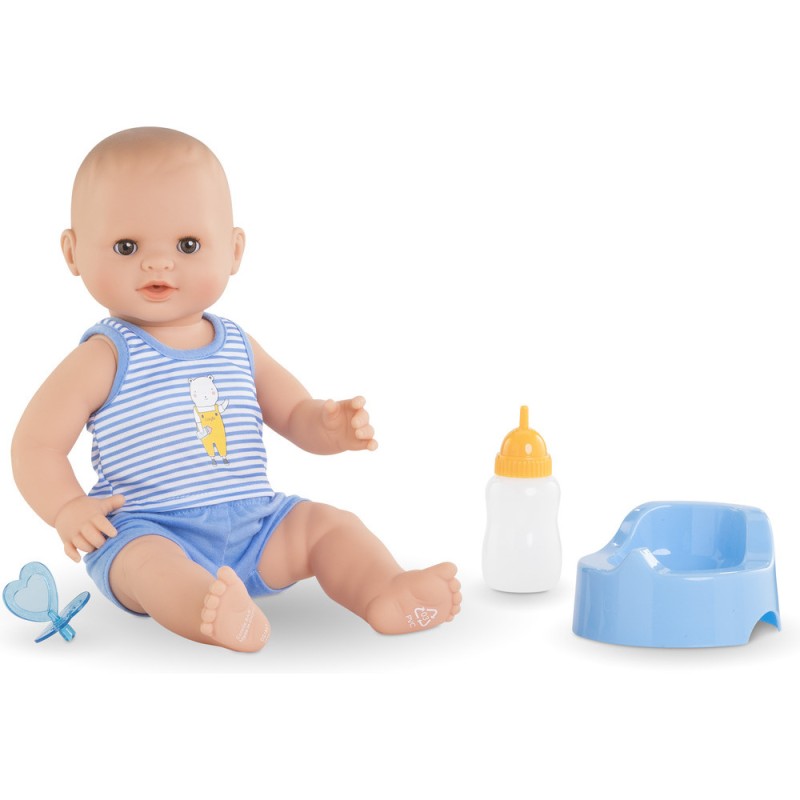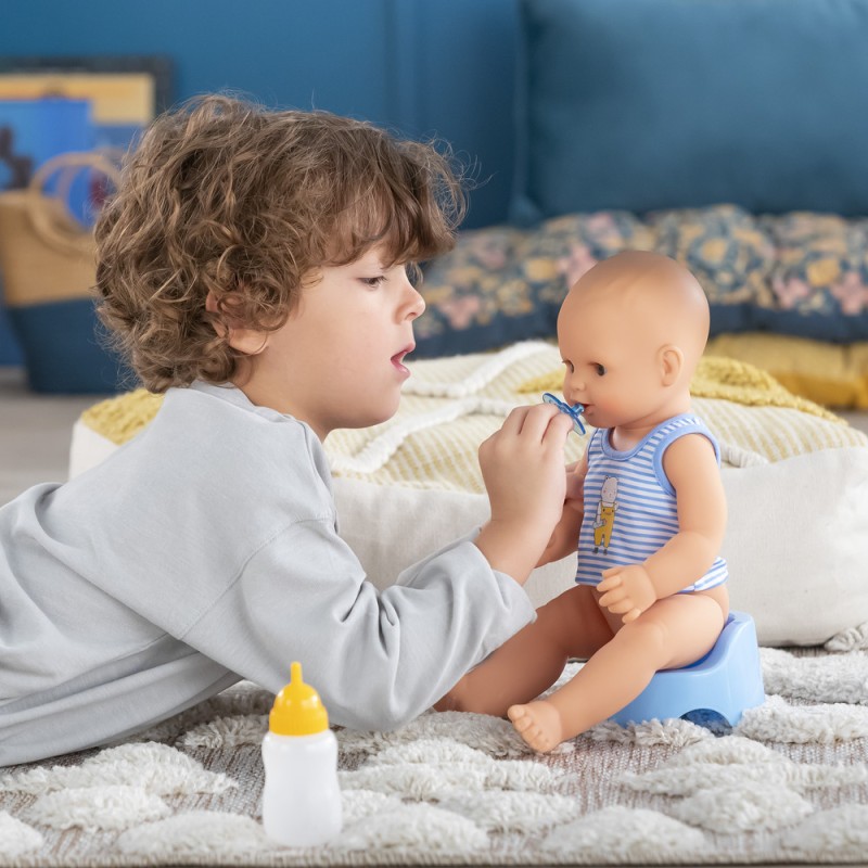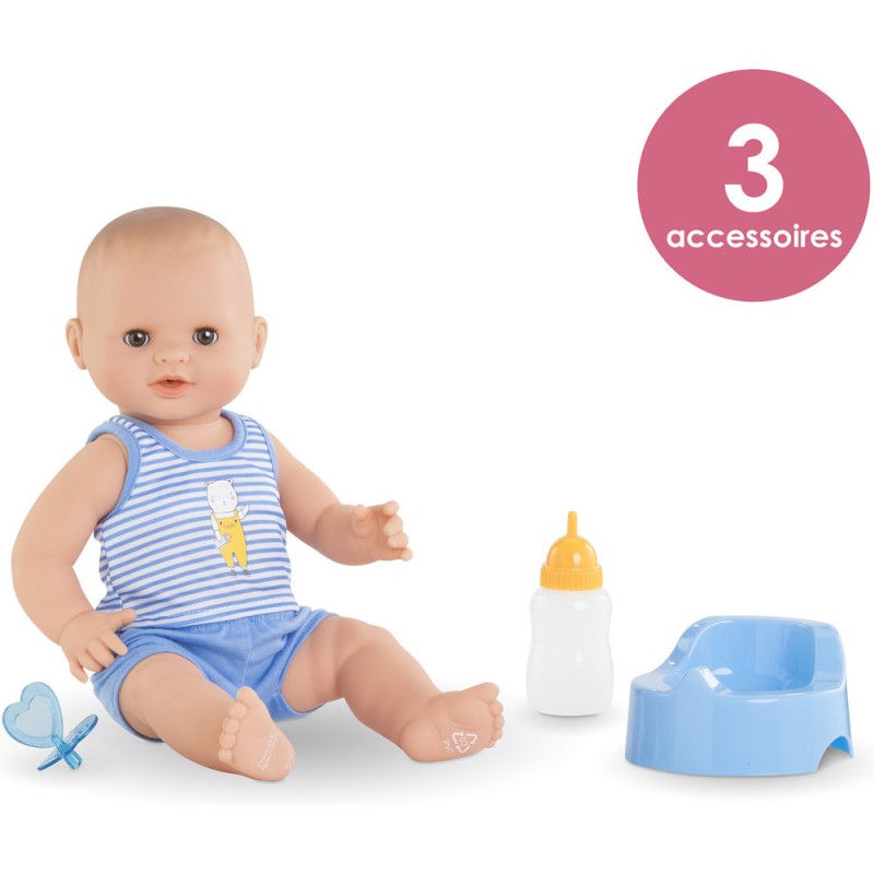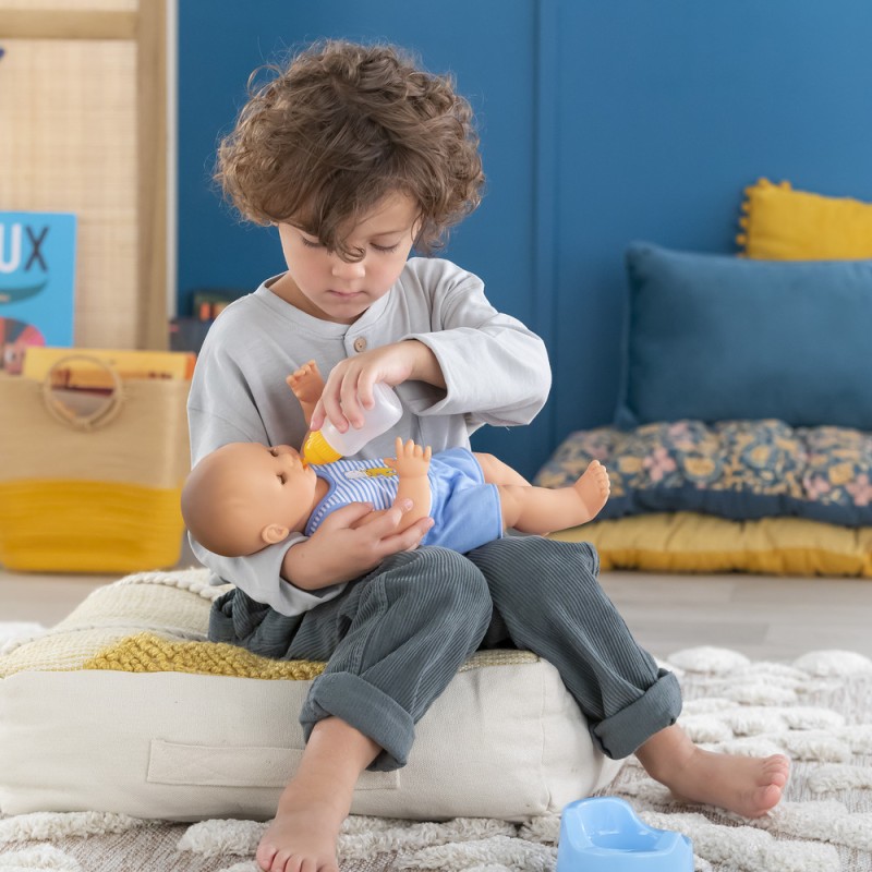 Avec ses 3 accessoires inclus (son pot, son biberon à remplir et sa tétine), ce grand poupon sexué garçon de 36 cm :