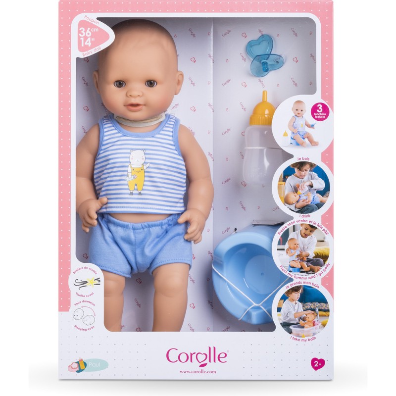 Comme tous les poupons Corolle, Paul fait pipi possède une délicate senteur de vanille et est en vinyle doux au toucher.