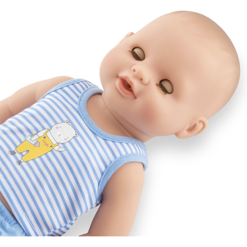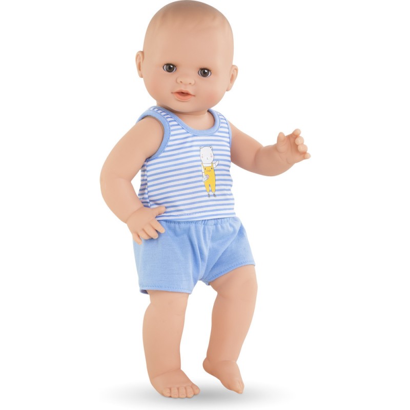 Ce poupon petit garçon a la peau blanche et les yeux marron. Il est habillé d’un débardeur rayé bleu à l'imprimé ourson et d’un bloomer bleu.