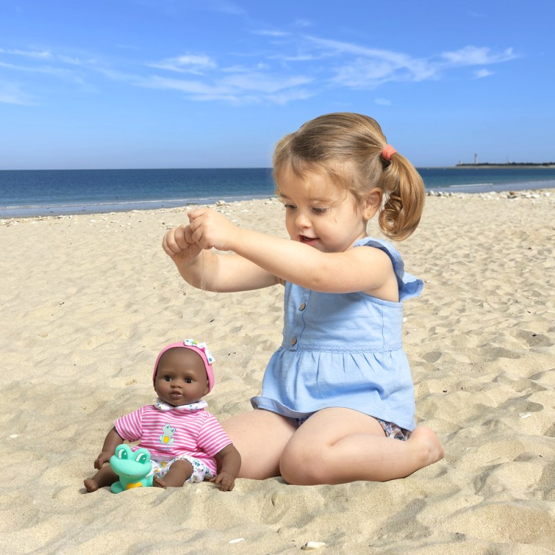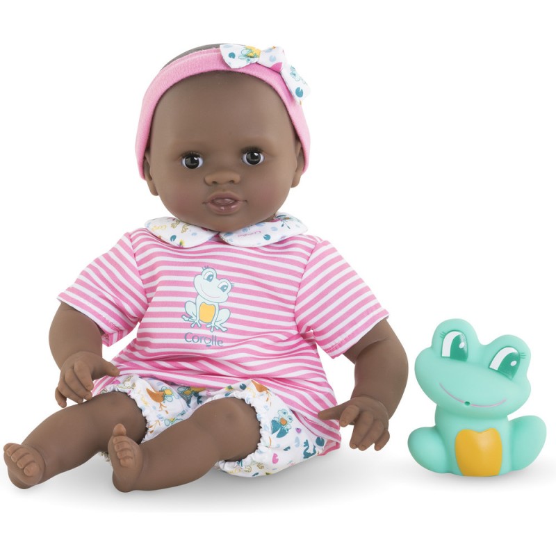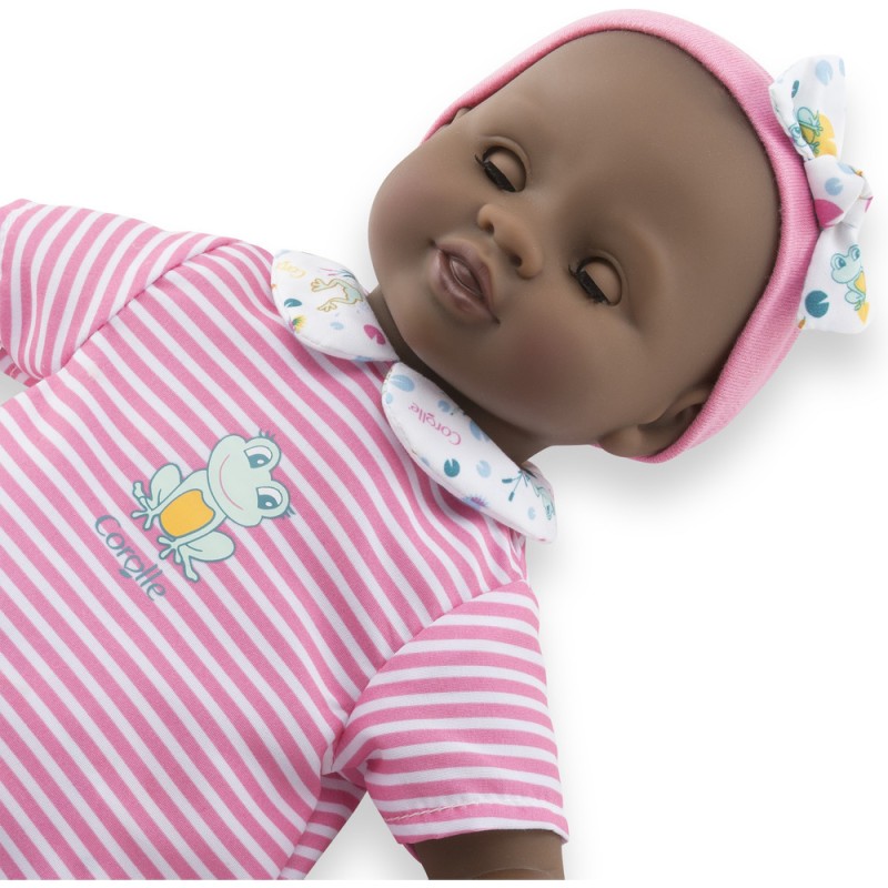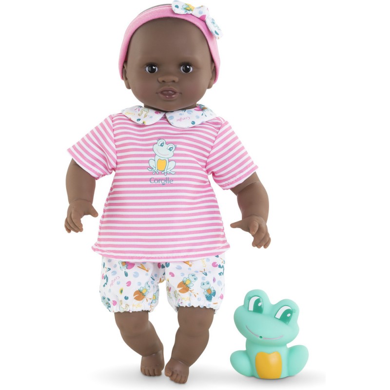 Ce petit poupon à la peau noire et aux yeux marron est habillé d'une blouse rayée rose & d'un short à l'imprimé "grenouilles". Il est coiffé d'un bandeau rose avec un petit nœud assorti.