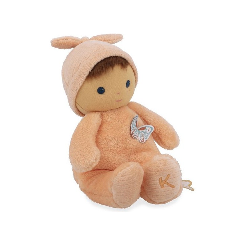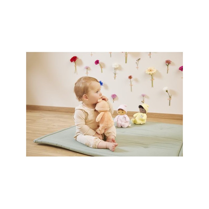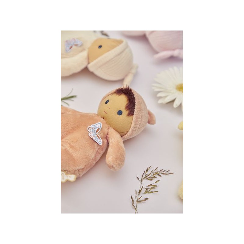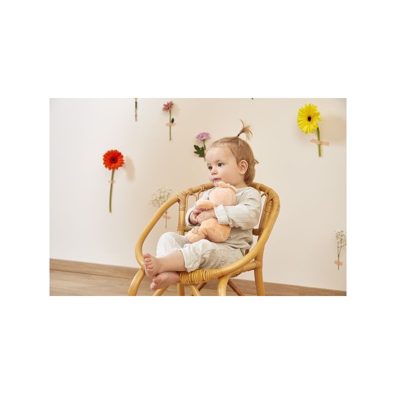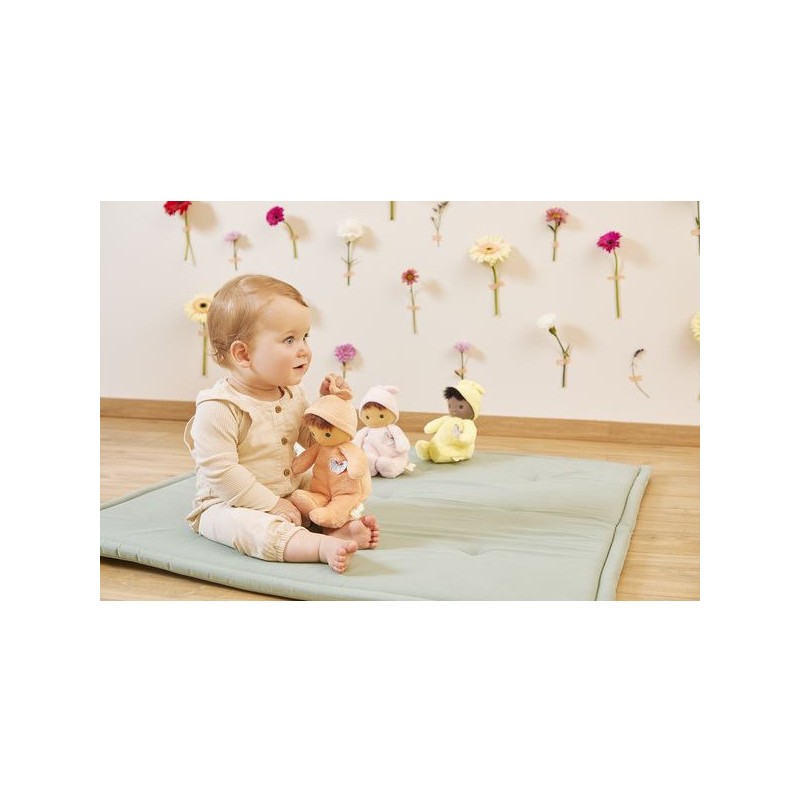 Offrez Bébé Zinnia, un poupon en tissu charmant et plein de douceur, idéale comme doudou ou première poupée pour les tout-petits. Ce délicat poupon châtain de 24 cm se distingue par son corps couleur pêche et ses yeux bleus lumineux. Composé de micro-velours tout doux, de velours côtelé, et rembourré avec du polyester recyclé, ce poupon en tissu offre une texture moelleuse qui invite aux meilleurs câlins. Inspiré par cette fleur vibrante qu’est le zinnia, il est le cadeau parfait pour exprimer l'amour et renforcer les liens d'amitié. La fleur de zinnia est appréciée pour sa capacité à prospérer et à fleurir dans diverses conditions, ce qui fait de ce poupon un symbole de résilience et d'épanouissement affectif entre l'enfant et ses proches. Le torse de cette petite poupée est orné d'un papillon délicat, rappelant la légèreté et la grâce des fleurs : un détail enchanteur qui fera chavirer tous les cœurs. L'étiquette en forme de papillon est une invitation ludique à développer la dextérité et la curiosité sensorielle de bébé. Chaque interaction avec Bébé Zinnia stimule les sens en douceur et encourage le développement tactile des jeunes enfants. Son adorable bonnet noué est un élément de plus à explorer. Fabriqué avec 90% de matériaux recyclés, ce premier poupon illustre notre engagement à réduire notre impact environnemental tout en assurant une qualité et une sécurité sans compromis. Lavable en machine à 30°, Bébé Zinnia est conçu pour résister aux aventures quotidiennes et rester un fidèle compagnon dès la naissance de bébé et au-delà. Bébé Zinnia n'est pas juste une petite peluche, c'est un premier ami, un gardien de souvenirs d'enfance et un symbole de la tendresse que vous pouvez offrir à bébé. Ce doudou rose est un cadeau de naissance empreint d'amour et de douceur, qui promet de devenir le compagnon chéri des tout-petits pour les années à venir.