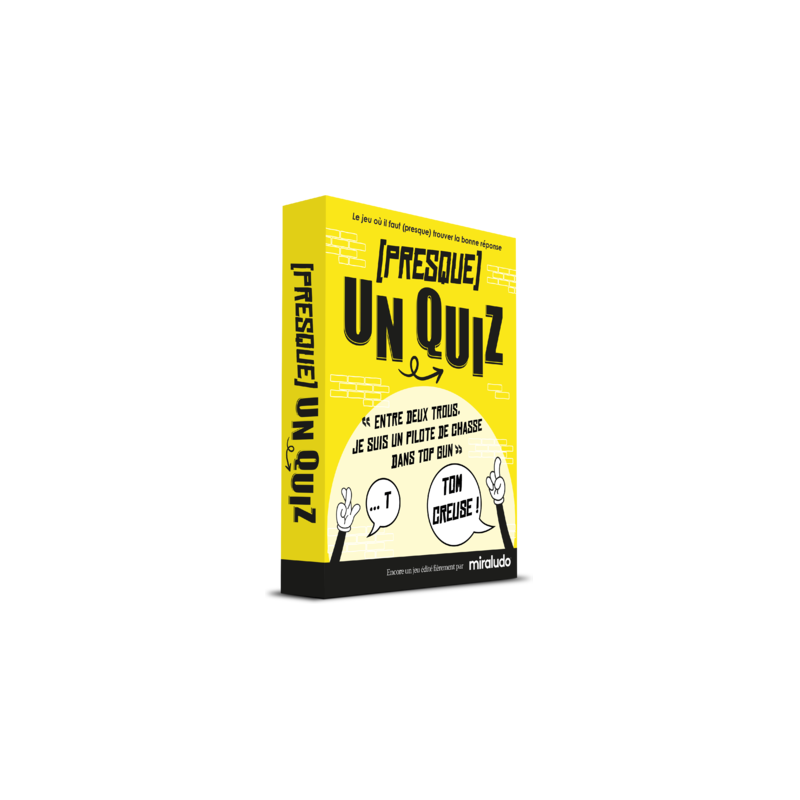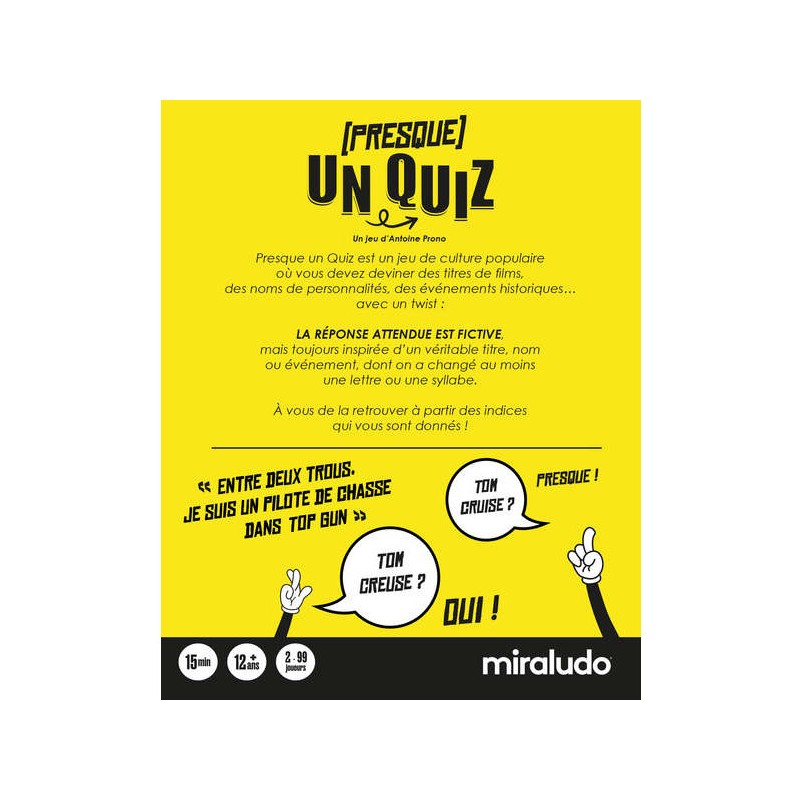 Presque un Quiz est un jeu de culture populaire où vous devez deviner des titres de films, des noms de personnalités, des événements historiques… avec un twist : La RÉPonse Attendue Est Fictive, mais toujours inspirée d’un véritable titre, nom ou événement, dont on a changé au moins une lettre ou une syllabe. À vous de la retrouver à partir des indices qui vous sont donnés ! On essaie une carte ? Voici l'indice : "entre deux trous, je suis un pilote de chasse dans Top Gun". Vous entendez Top Gun, vous pensez "Tom Cruise". Vous y êtes presque... la bonne réponse qui est "Tom Creuse".