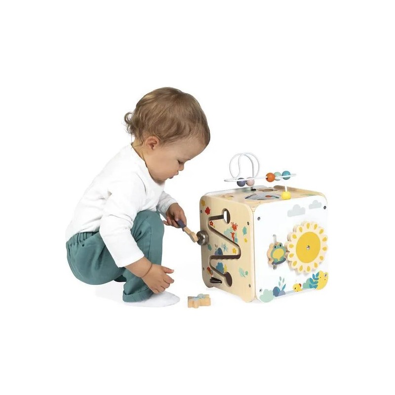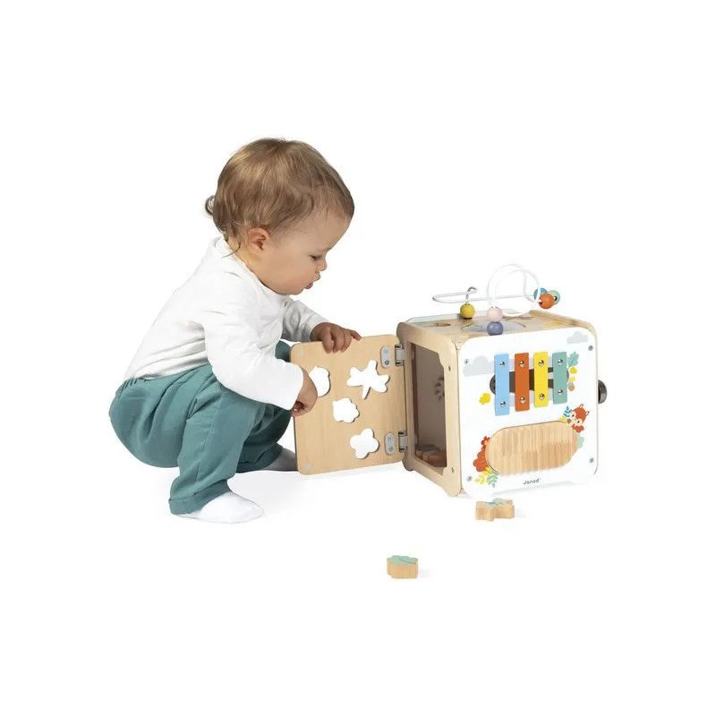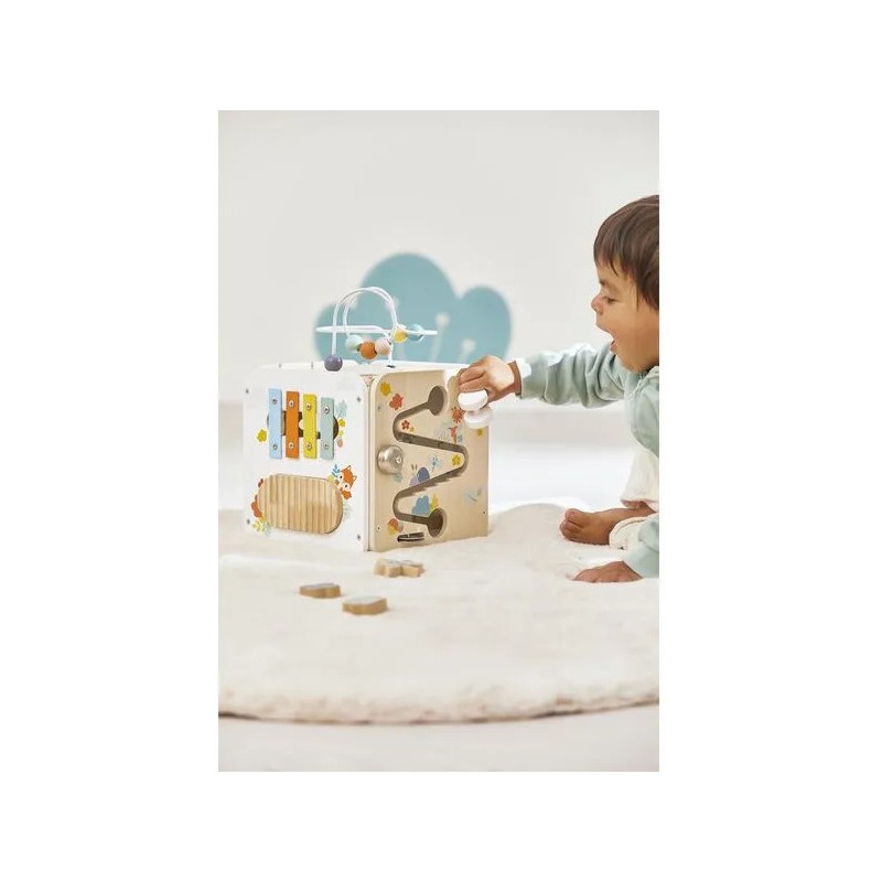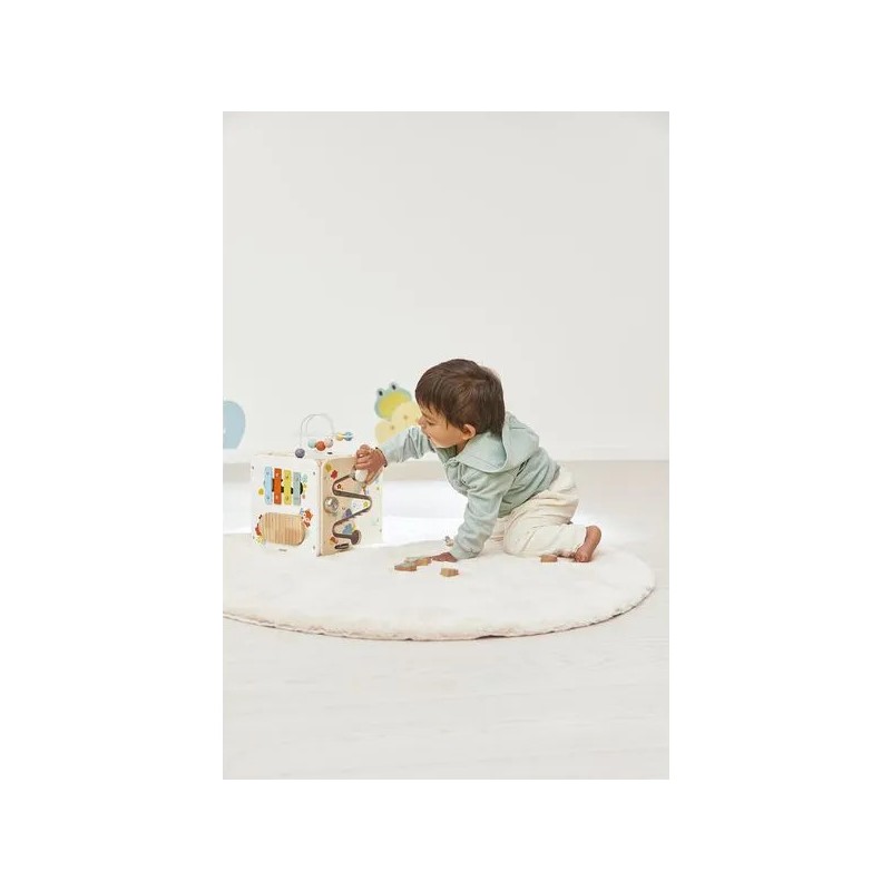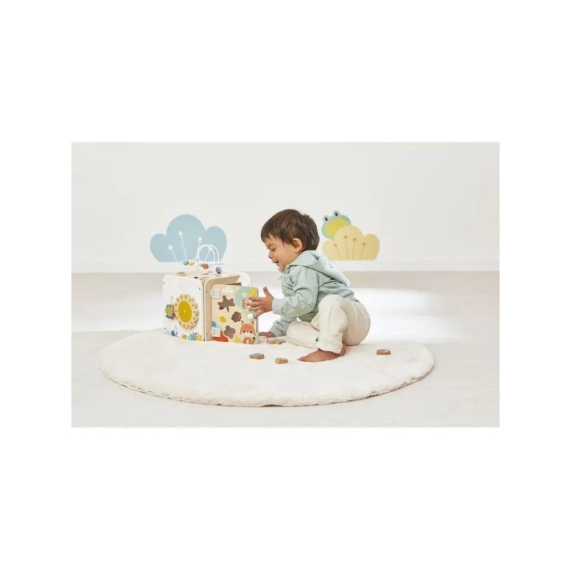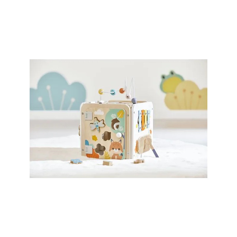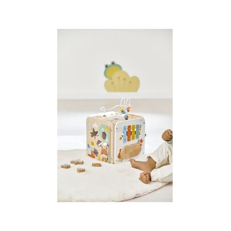 Bébé n'a pas fini de s'amuser avec ce cube d'activités en bois ! Idéal dès 18 mois, c'est un jouet d'éveil complet et pensé pour stimuler les sens des tout-petits. Il développe la motricité fine, le toucher et la coordination oeil-main. Avec ses 8 activités réparties sur chaque face, ce grand cube multi-activités regorge de surprises, toutes à portée de main de bébé ! On y retrouve : 1 xylophone en métal accompagné de sa baguette, 1 gratte-gratte à frotter comme un petit instrument de percussion, 1 miroir pour se regarder sur le dessus qui déforme bébé et provoque des éclats de rire, 1 looping à perles colorées, 1 descendeur avec sa bobine qui fait sonner une clochette et des cymballes sur son passage et 1 boite à forme avec 4 pièces à encastrer (1 fleur, 1 noisette, 1 libellule et 1 feuille). Un dernier détail amusant vient compléter ce joli cube : 1 grenouille s'est installée près du soleil ! Et quand elle saute… le soleil se met à tourner ! Un vrai petit tour de magie mécanique qui amuse bébé et l’aide à comprendre le lien entre ses gestes et leurs effets. Malin, une porte aimantée permet de récupérer les pièces tombées à l'intérieur du cube. Grâce à ses charnières souples en plastique, la porte peut être repositionnée facilement en cas de déboîtement. Ce cube d'activités invite bébé à explorer, manipuler, écouter et observer ce qui l'entoure. Un univers bucolique inspiré de la forêt, où chaque détail invite à l’éveil et à la curiosité ! Issu de notre collection de jouets d’éveil en bois Pure, ce maxi cube multi-activités est composé de bois certifié Fsc™.