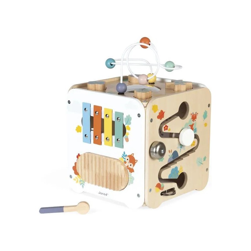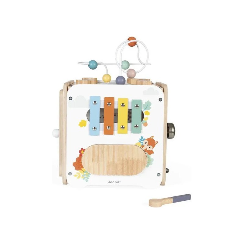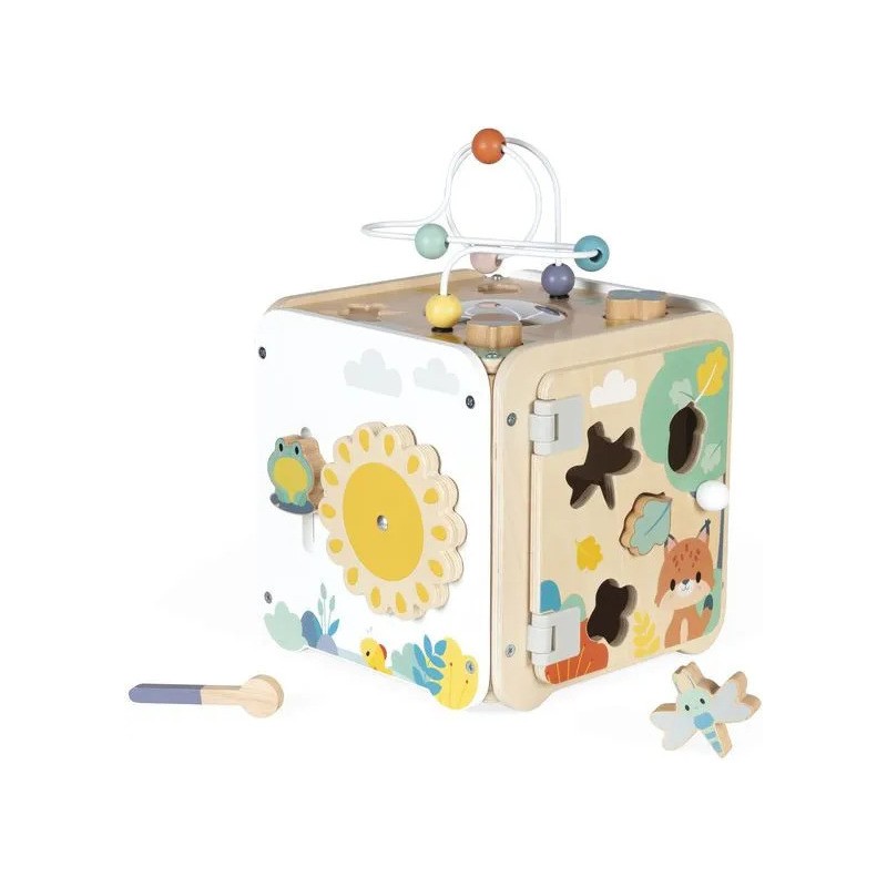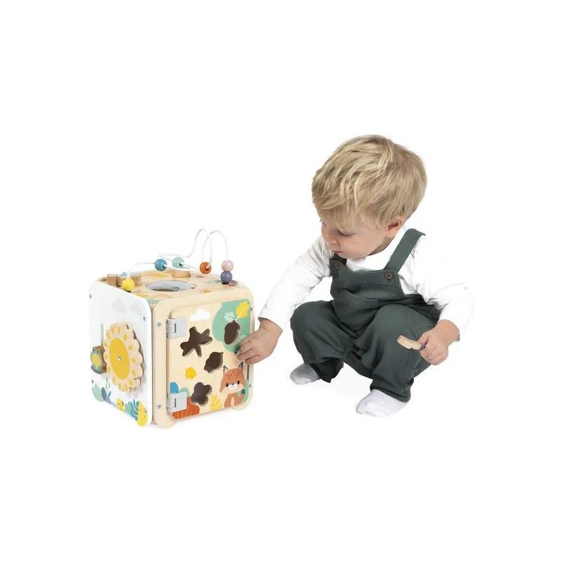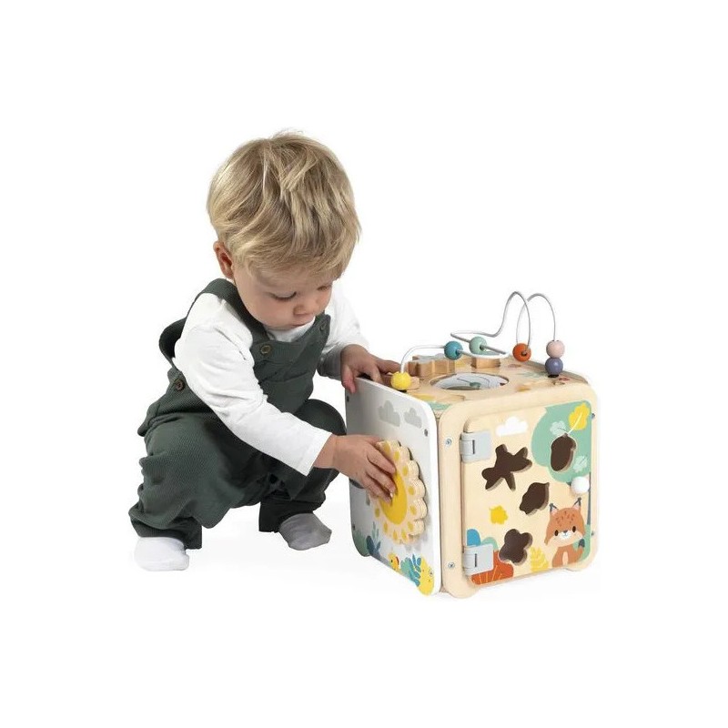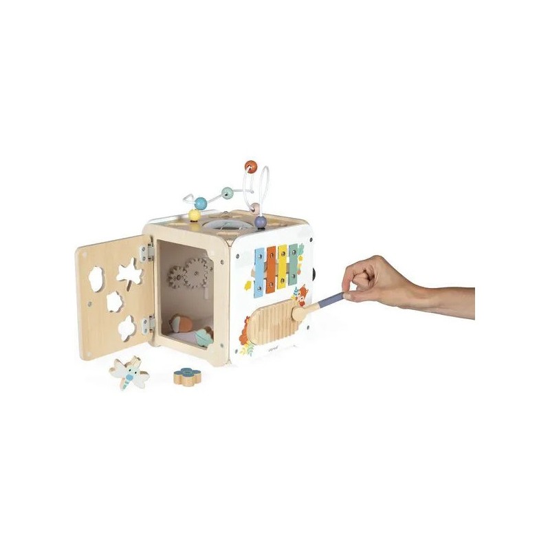 Bébé n'a pas fini de s'amuser avec ce cube d'activités en bois ! Idéal dès 18 mois, c'est un jouet d'éveil complet et pensé pour stimuler les sens des tout-petits. Il développe la motricité fine, le toucher et la coordination oeil-main. Avec ses 8 activités réparties sur chaque face, ce grand cube multi-activités regorge de surprises, toutes à portée de main de bébé ! On y retrouve : 1 xylophone en métal accompagné de sa baguette, 1 gratte-gratte à frotter comme un petit instrument de percussion, 1 miroir pour se regarder sur le dessus qui déforme bébé et provoque des éclats de rire, 1 looping à perles colorées, 1 descendeur avec sa bobine qui fait sonner une clochette et des cymballes sur son passage et 1 boite à forme avec 4 pièces à encastrer (1 fleur, 1 noisette, 1 libellule et 1 feuille). Un dernier détail amusant vient compléter ce joli cube : 1 grenouille s'est installée près du soleil ! Et quand elle saute… le soleil se met à tourner ! Un vrai petit tour de magie mécanique qui amuse bébé et l’aide à comprendre le lien entre ses gestes et leurs effets. Malin, une porte aimantée permet de récupérer les pièces tombées à l'intérieur du cube. Grâce à ses charnières souples en plastique, la porte peut être repositionnée facilement en cas de déboîtement. Ce cube d'activités invite bébé à explorer, manipuler, écouter et observer ce qui l'entoure. Un univers bucolique inspiré de la forêt, où chaque détail invite à l’éveil et à la curiosité ! Issu de notre collection de jouets d’éveil en bois Pure, ce maxi cube multi-activités est composé de bois certifié Fsc™.