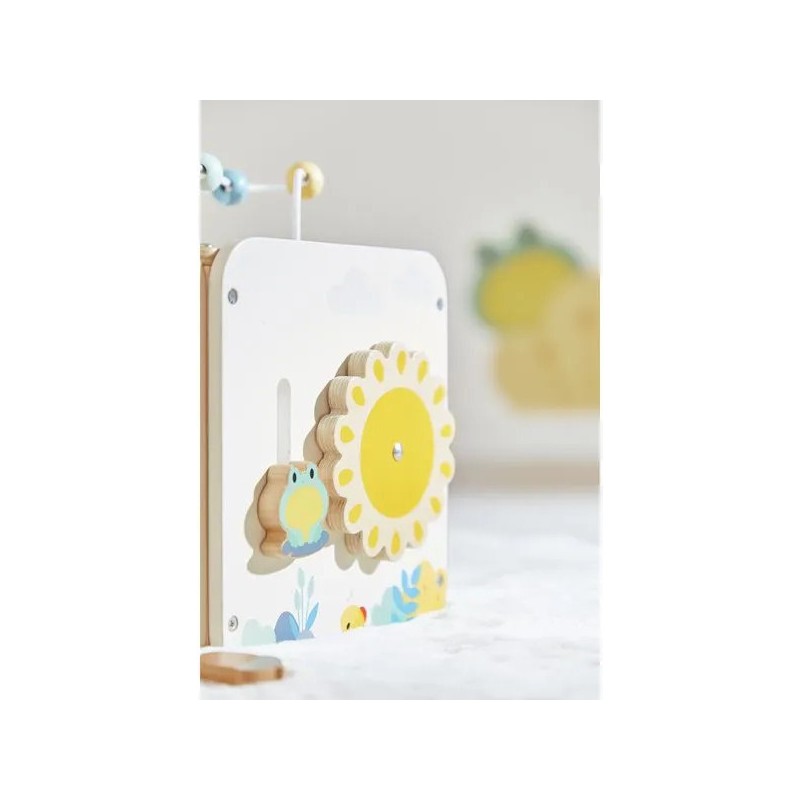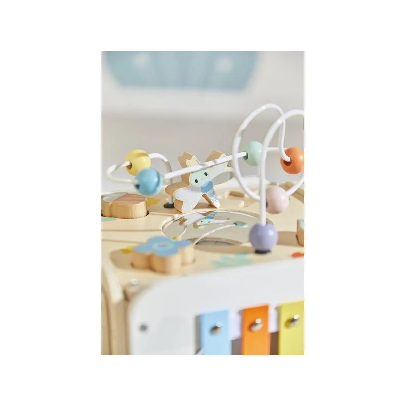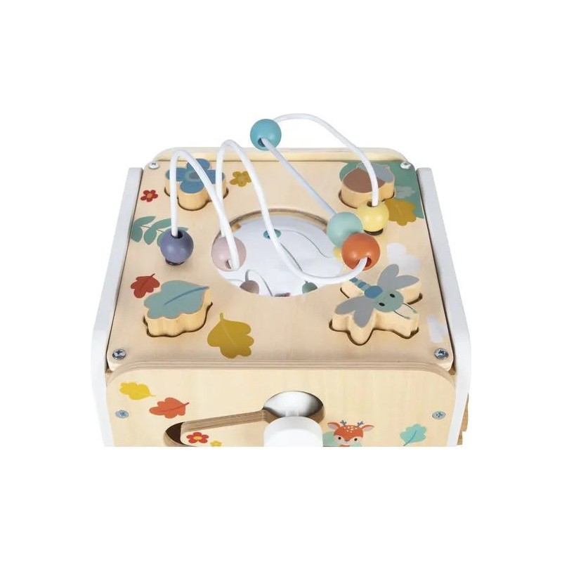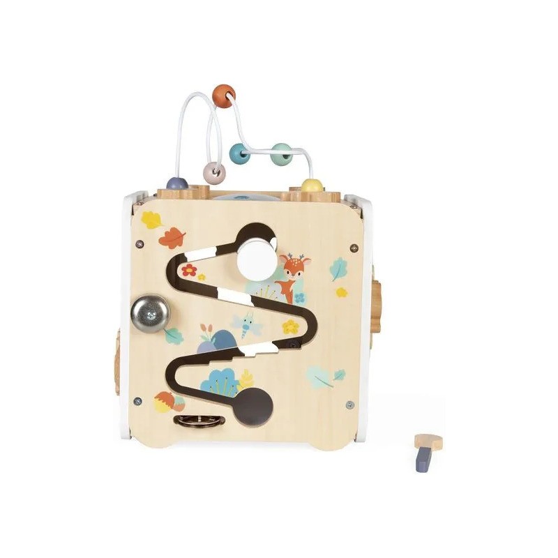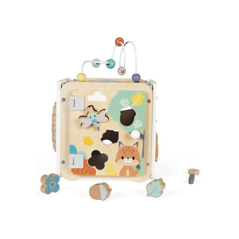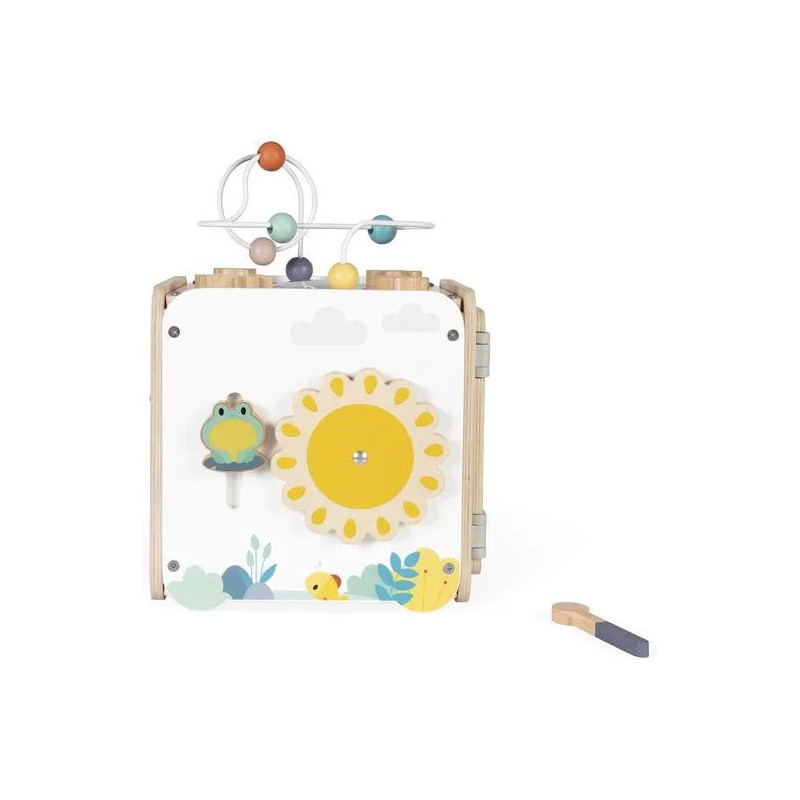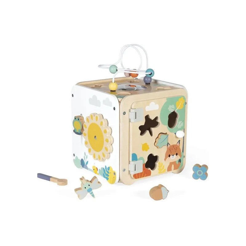 Bébé n'a pas fini de s'amuser avec ce cube d'activités en bois ! Idéal dès 18 mois, c'est un jouet d'éveil complet et pensé pour stimuler les sens des tout-petits. Il développe la motricité fine, le toucher et la coordination oeil-main. Avec ses 8 activités réparties sur chaque face, ce grand cube multi-activités regorge de surprises, toutes à portée de main de bébé ! On y retrouve : 1 xylophone en métal accompagné de sa baguette, 1 gratte-gratte à frotter comme un petit instrument de percussion, 1 miroir pour se regarder sur le dessus qui déforme bébé et provoque des éclats de rire, 1 looping à perles colorées, 1 descendeur avec sa bobine qui fait sonner une clochette et des cymballes sur son passage et 1 boite à forme avec 4 pièces à encastrer (1 fleur, 1 noisette, 1 libellule et 1 feuille). Un dernier détail amusant vient compléter ce joli cube : 1 grenouille s'est installée près du soleil ! Et quand elle saute… le soleil se met à tourner ! Un vrai petit tour de magie mécanique qui amuse bébé et l’aide à comprendre le lien entre ses gestes et leurs effets. Malin, une porte aimantée permet de récupérer les pièces tombées à l'intérieur du cube. Grâce à ses charnières souples en plastique, la porte peut être repositionnée facilement en cas de déboîtement. Ce cube d'activités invite bébé à explorer, manipuler, écouter et observer ce qui l'entoure. Un univers bucolique inspiré de la forêt, où chaque détail invite à l’éveil et à la curiosité ! Issu de notre collection de jouets d’éveil en bois Pure, ce maxi cube multi-activités est composé de bois certifié Fsc™.
