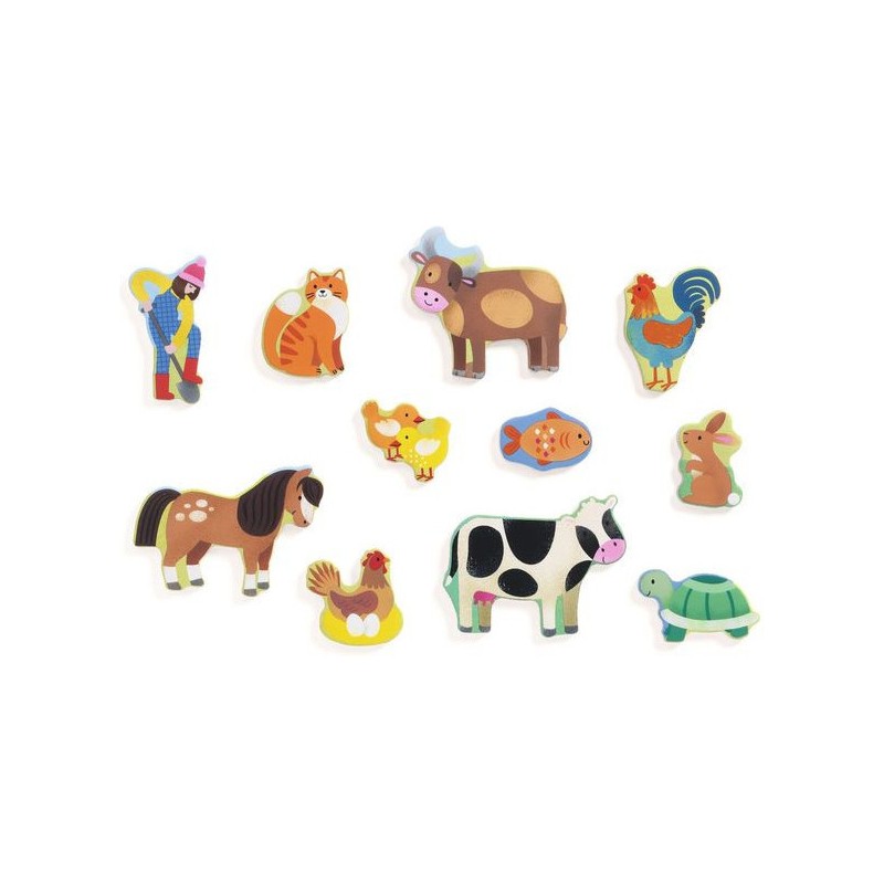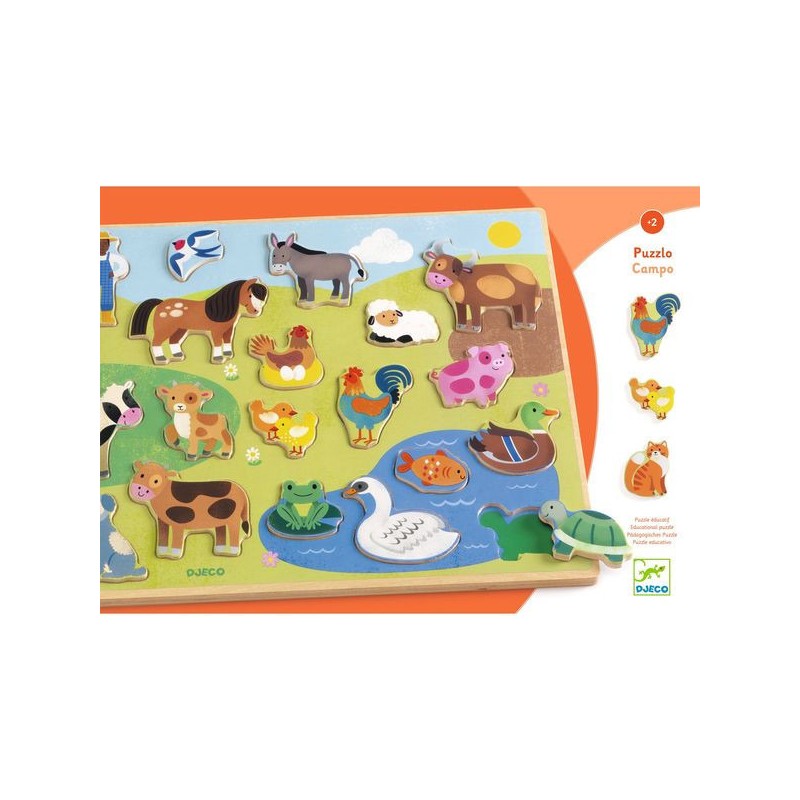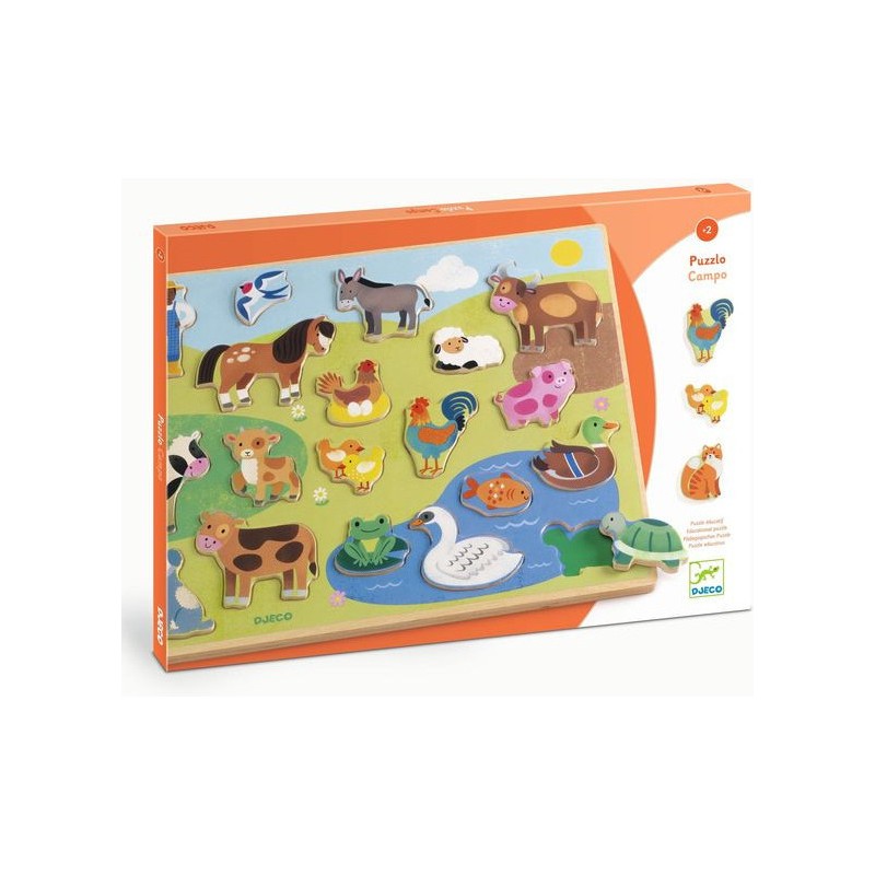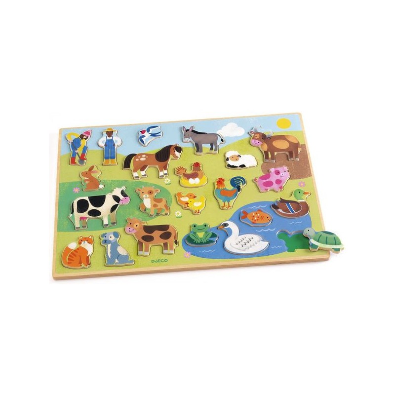 Un puzzle en bois sur le thème de la ferme. L’enfant place les 22 pièces en reconnaissant sur le plateau les silhouettes des animaux de la ferme.