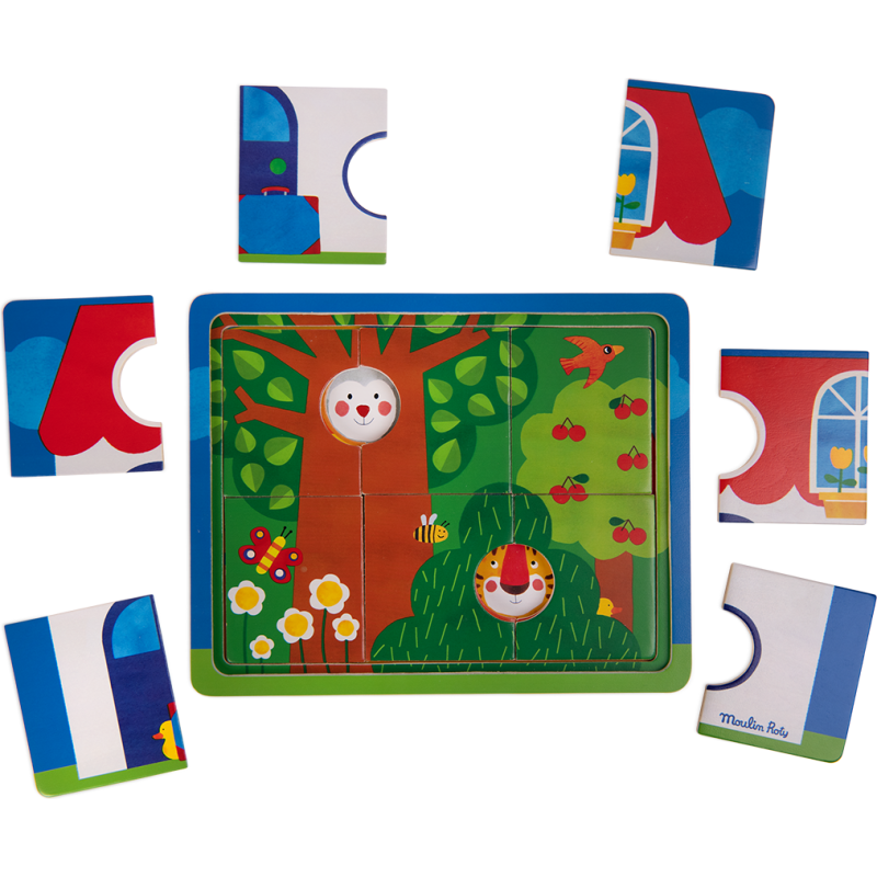 Puzzle en bois. 6 pcs sur 3 niveaux successifs. Chaque puzzle est associé à une couleur pour faciliter l'apprentissage. Les pièces sont faciles à attraper grâce aux fenêtres. Chaque niveau révèle une histoire dans un nouveau décor Les Popipop. 2 ans et +