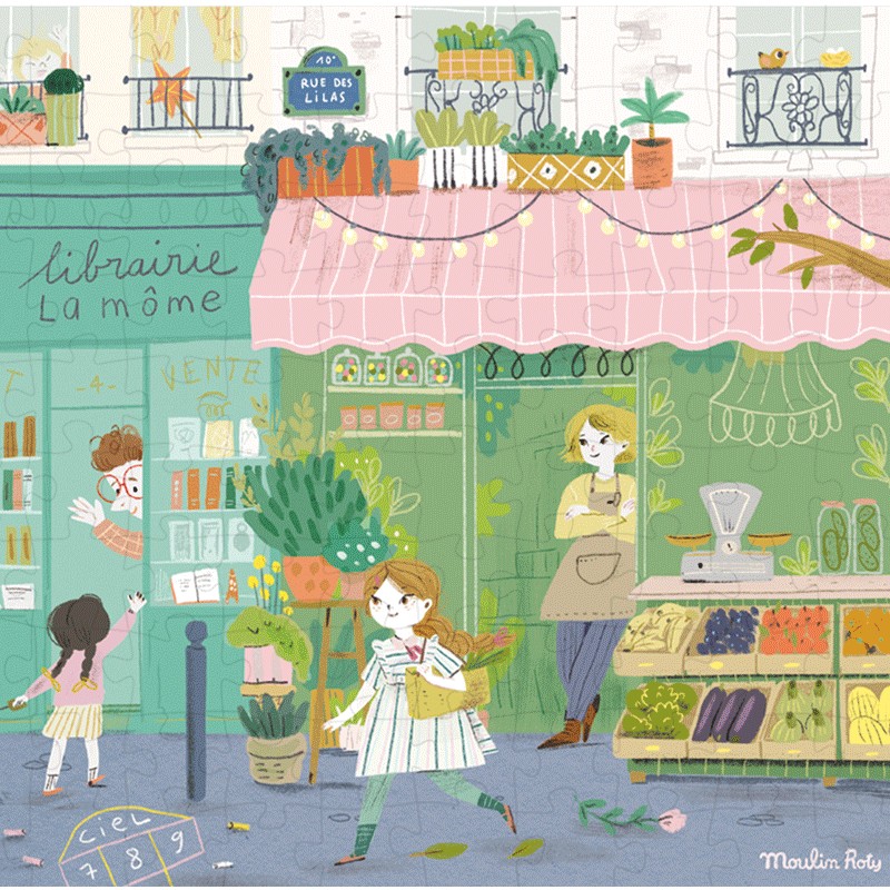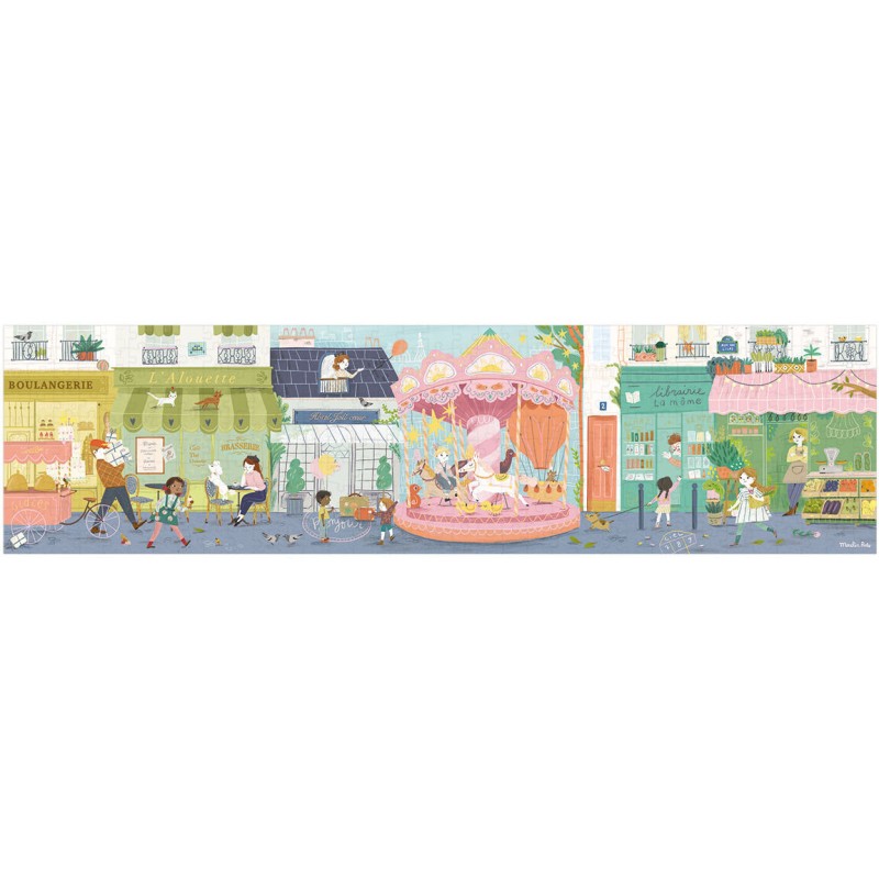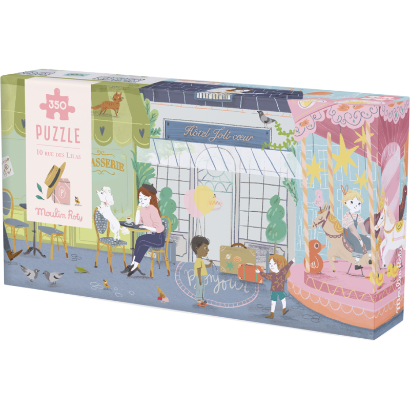 Puzzle panoramique 350 pcs. 10 rue des Lilas. illustré par Lucille Michieli + 1 poster modèle. Façades colorées. petits commerces de proximité… à toute heure de la journée. Les Parisiennes aiment se retrouver dans cette jolie rue très animée. 7 ans et +