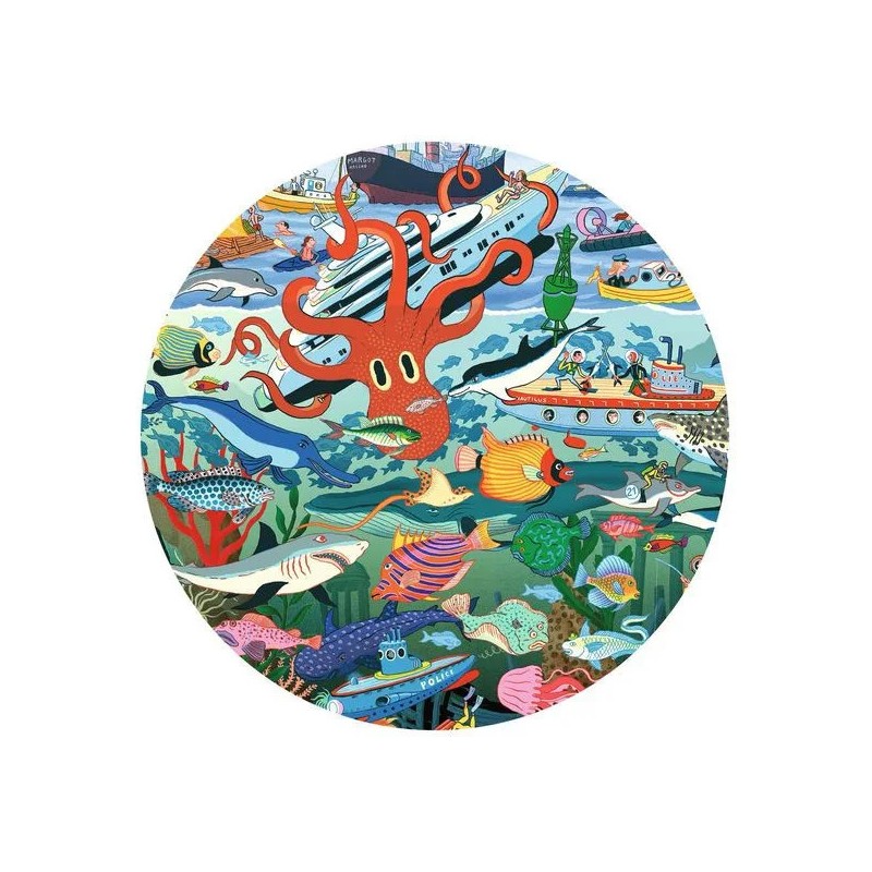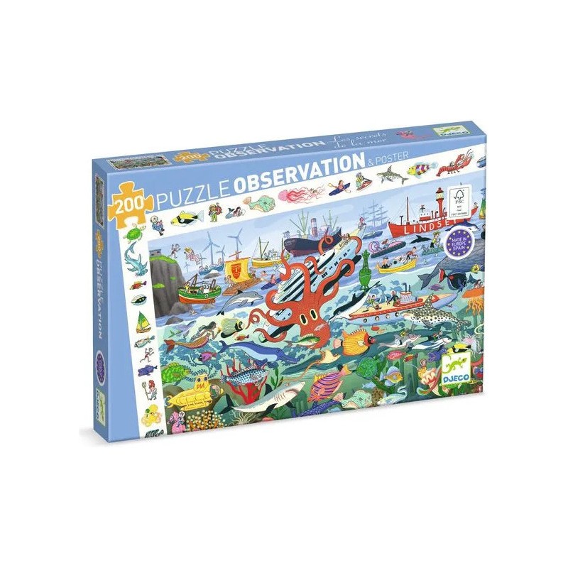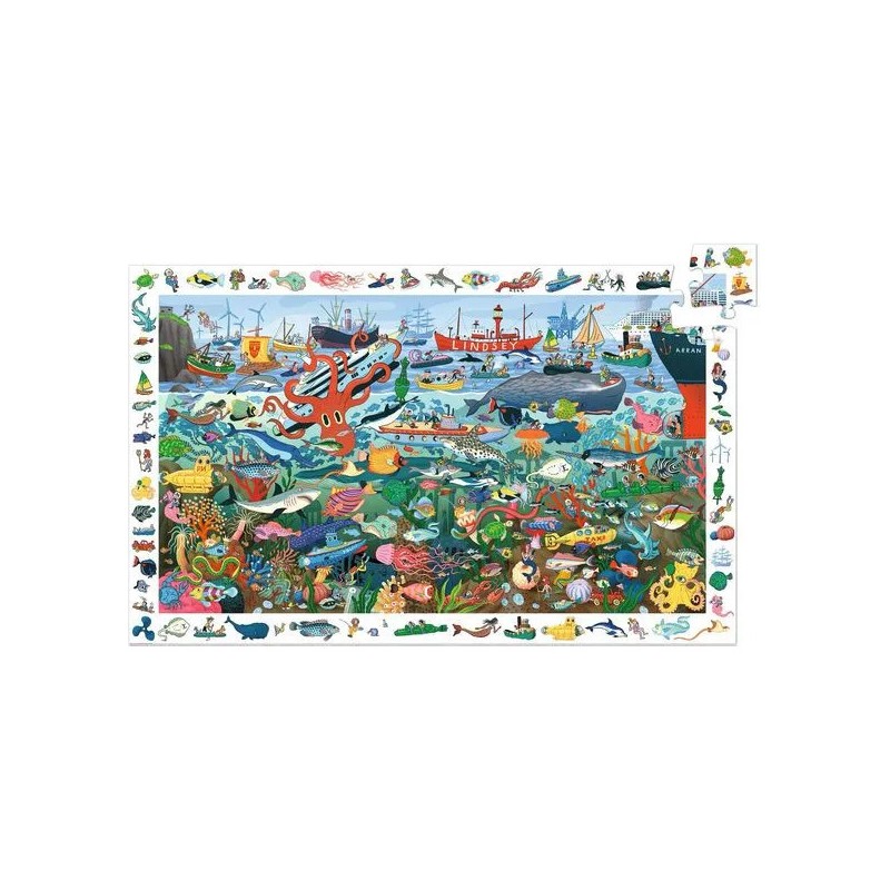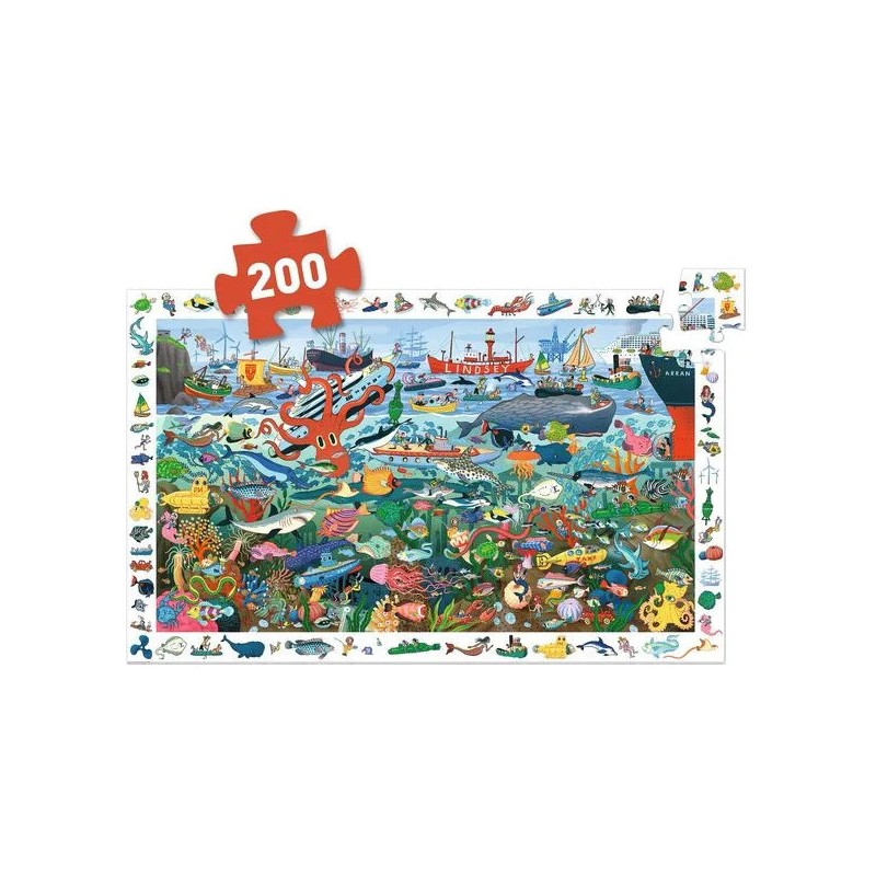 Un puzzle observation de 200 pièces pour découvrir les secrets de la mer. L’enfant crée son puzzle puis s’amuse à retrouver dans l’image les éléments de la frise.