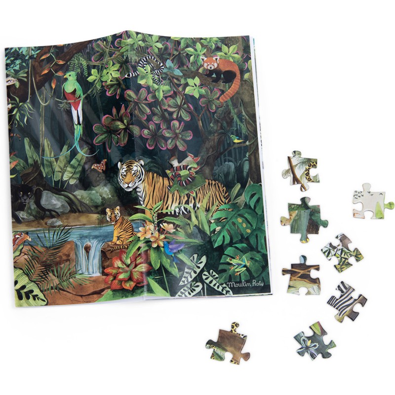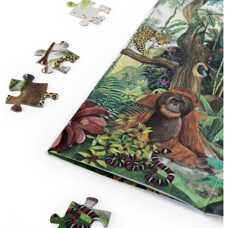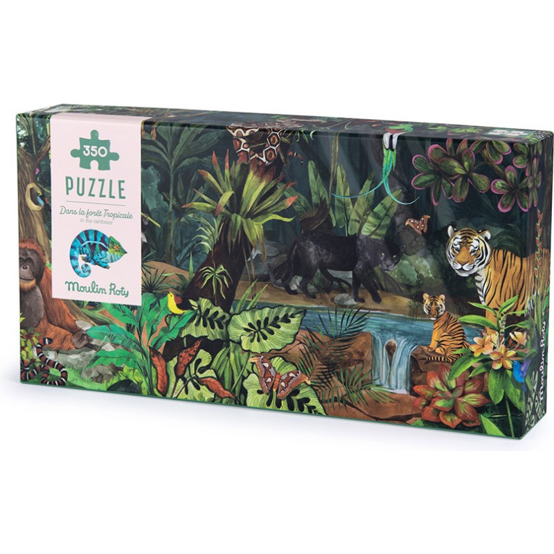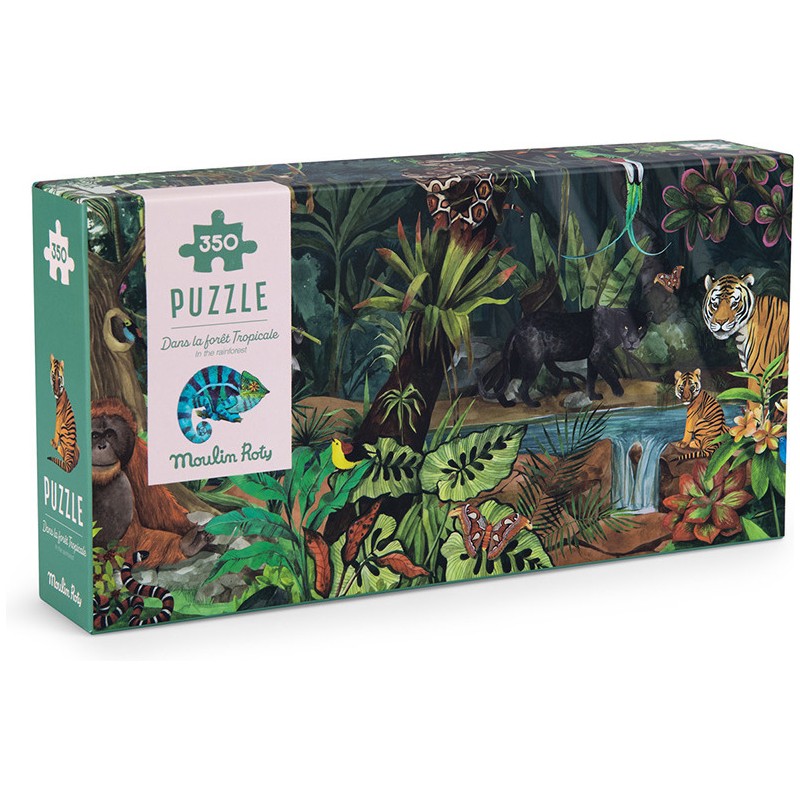 Puzzle panoramique 350 pcs Dans la forêt tropicale + 1 poster modèle. Découvre l'habitat de 50 % des animaux et plantes du monde. Une fois assembl, teste tes capacités d'observation. Combien comptes-tu d'espèces ? Te souviens-tu de leurs noms ? 7 ans et +
