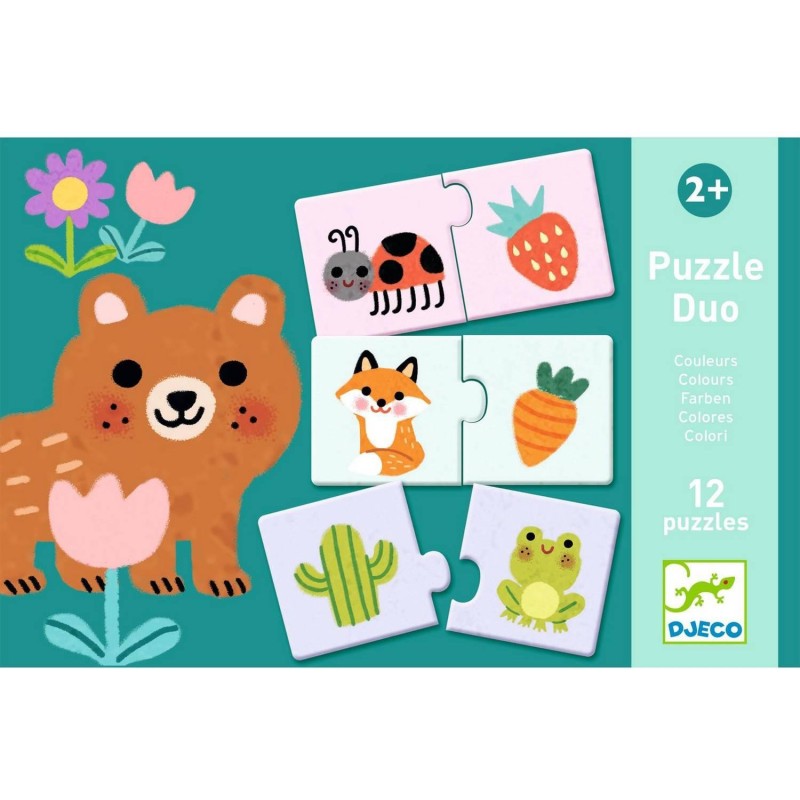 Puzzle duo Couleurs est un puzzle éducatif pour débuter l’apprentissage des couleurs. L’enfant associe l'objet et l'animal de la même couleur. À partir de 2 ans.