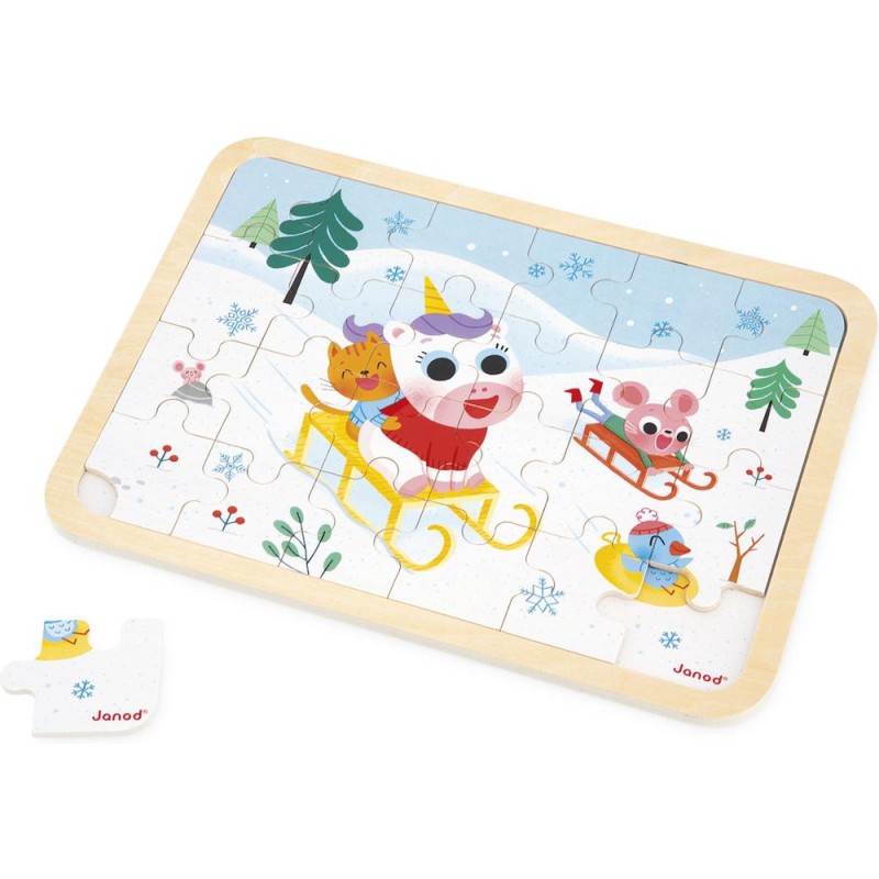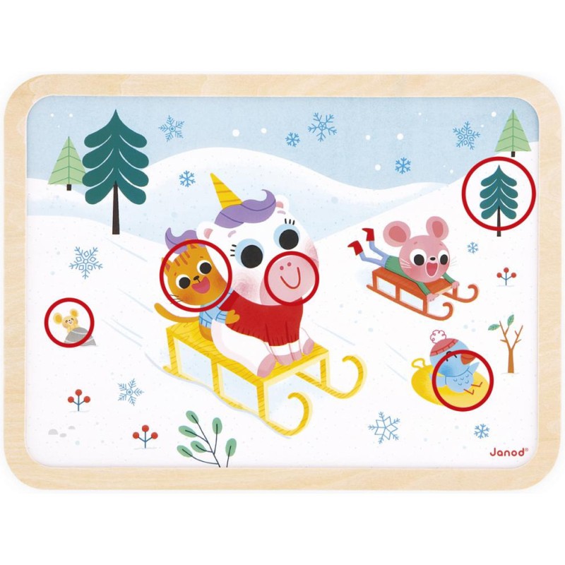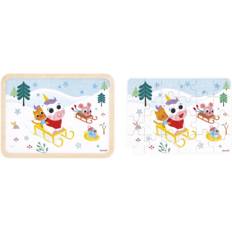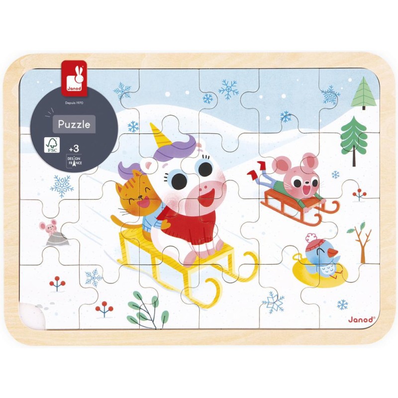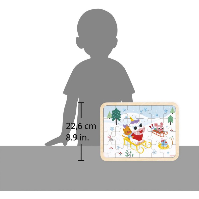 Prêts pour une course en luge ? Avec ce puzzle de 24 pièces, les enfants développent leur concentration et leur motricité fine, mais aussi leur sens de l’observation, dès l’âge de 3 ans. Pièce par pièce, ils assemblent un décor hivernal, où la licorne retrouve ses amis pour jouer dans la neige ! Il y a de la place pour deux sur la luge jaune, pendant que la souris sur la luge orange s’amuse à glisser allongée … Et le petit oiseau ? On dirait bien qu’il a pris la tête ! Le modèle du puzzle est imprimé sur le fond du plateau, pour aider les enfants dans sa réalisation. Idéal pour apprendre les noms des animaux de la ferme et ravir les fans de licornes, ce puzzle en bois invite les petits à faire preuve de déduction. Comment ? En incluant un jeu des différences ! Il y a 5 différences qui se sont glissées sur l’illustration du puzzle : amusez-vous à les retrouver en famille ! Malin, le puzzle est doté d’une petite encoche dans un angle pour faciliter le retrait des pièces. Avec son puzzle montagne, votre enfant se divertit et stimule son cerveau avec une activité calme qui a fait ses preuves ! Dans son format 30 x 22 cm, il est composé de bois issu de forêts gérées durablement, certifié Fsc™. Plus vite, plus vite !