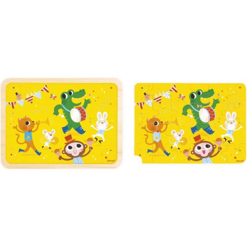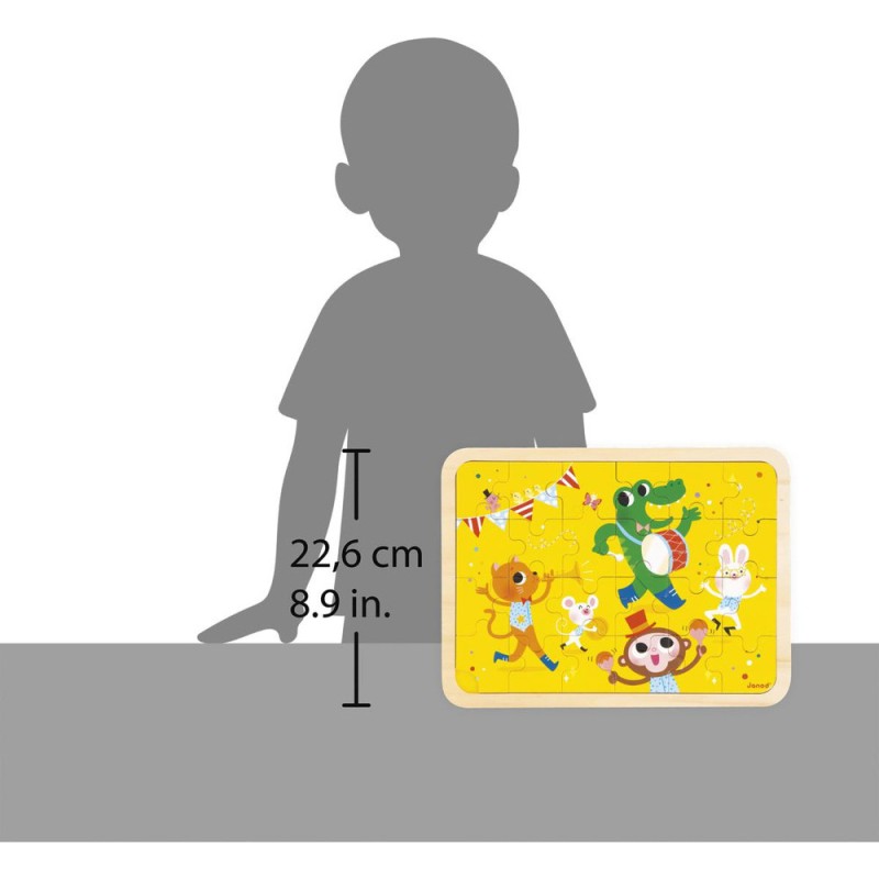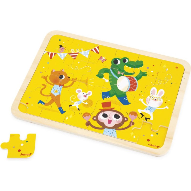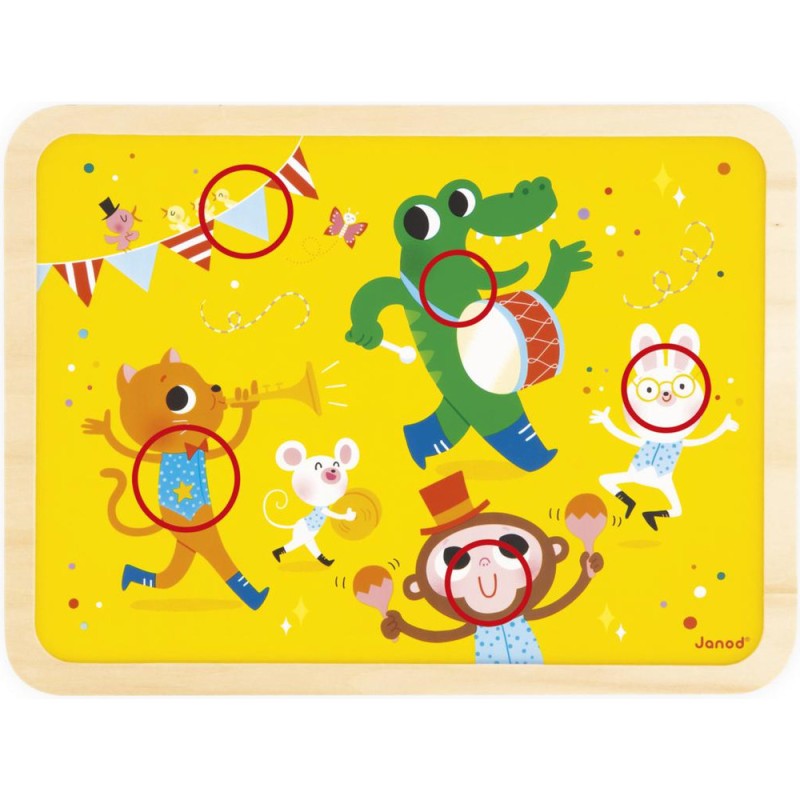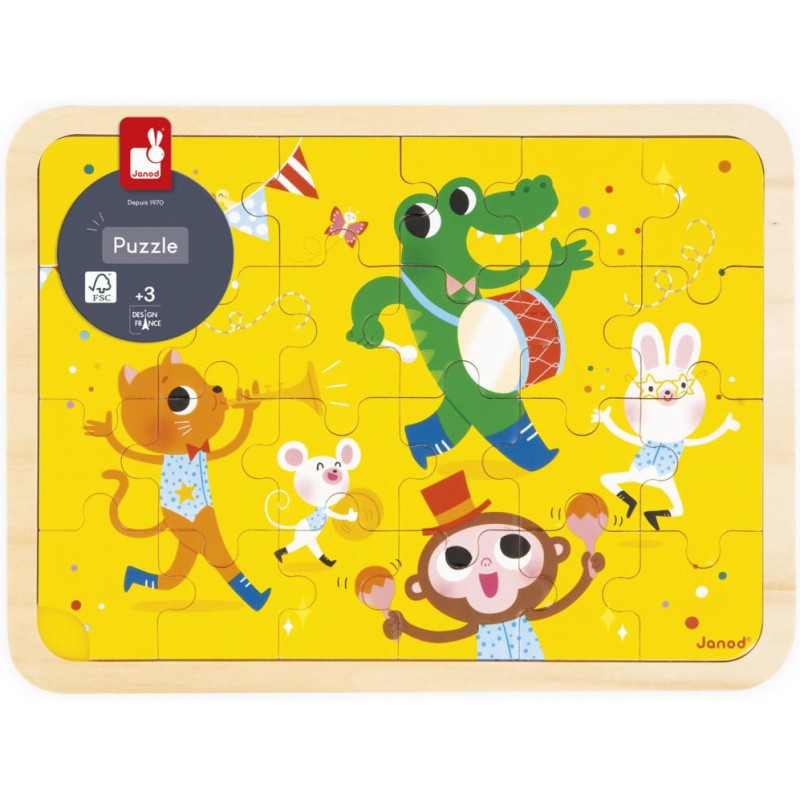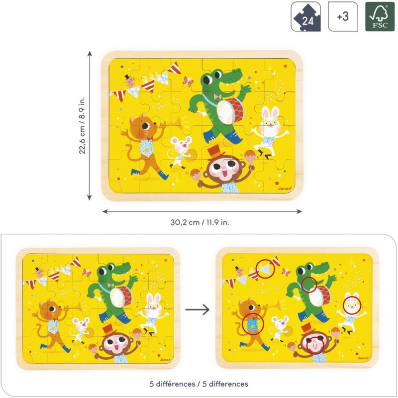 Les animaux sont en fête ! Avec ce puzzle de 24 pièces, les enfants développent leur concentration et leur motricité fine, mais aussi leur sens de l’observation, dès l’âge de 3 ans. Pièce par pièce, ils assemblent un décor festif, où la fanfare des animaux bat la mesure ! Un chat trompettiste, un crocodile avec un tambour … Et ce lapin ? Il met juste l’ambiance ! Le modèle du puzzle est imprimé sur le fond du plateau, pour aider les enfants dans sa réalisation. Idéal pour apprendre les noms des animaux et des instruments de musique, ce puzzle en bois invite les petits à faire preuve de déduction. Comment ? En incluant un jeu des différences ! Il y a 5 différences qui se sont glissées sur l’illustration du puzzle : amusez-vous à les retrouver en famille ! Malin, le puzzle est doté d’une petite encoche dans un angle pour faciliter le retrait des pièces. Avec son puzzle animaux, votre enfant se divertit et stimule son cerveau avec une activité calme qui a fait ses preuves ! Dans son format 30 x 22 cm, il est composé de bois issu de forêts gérées durablement, certifié Fsc™. Allez, musique !