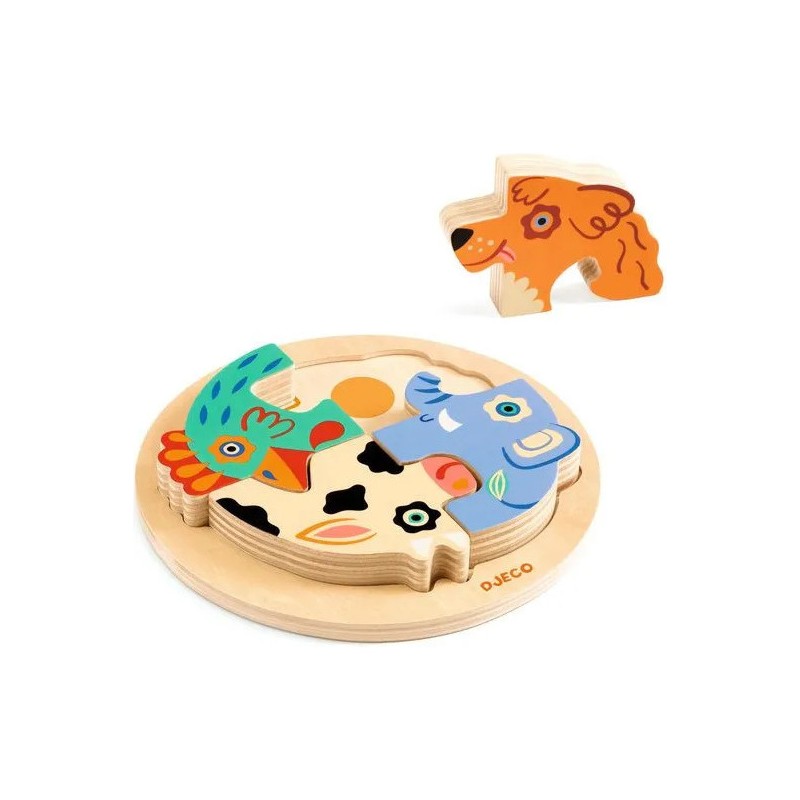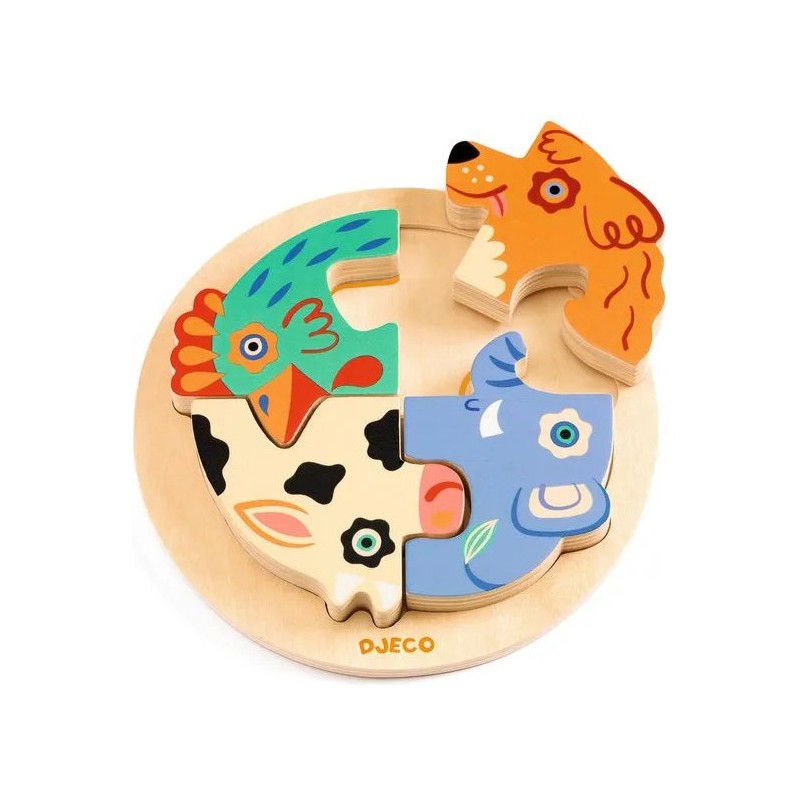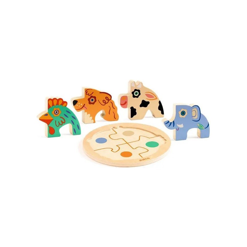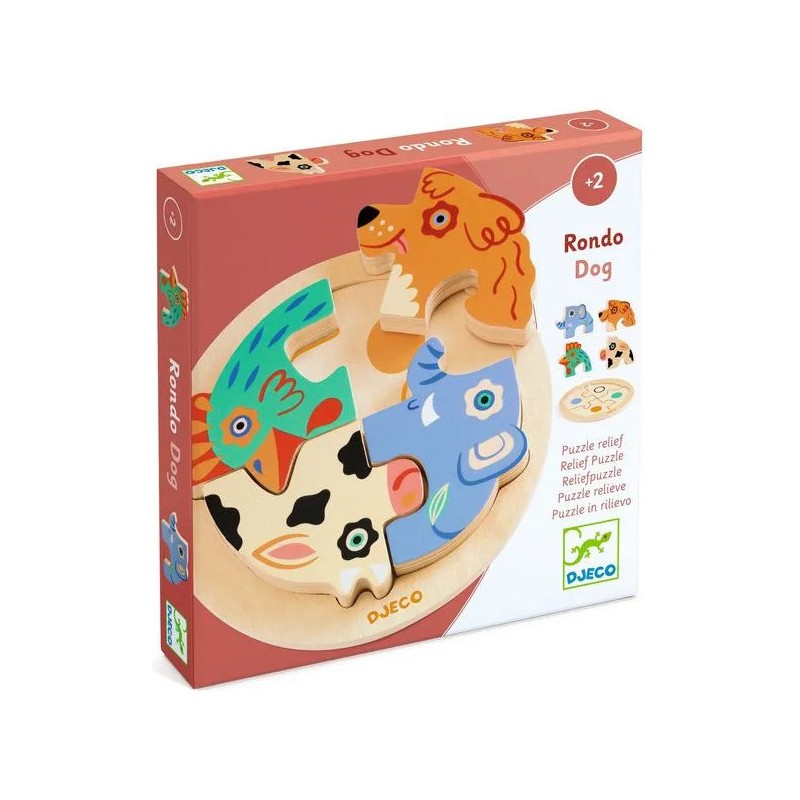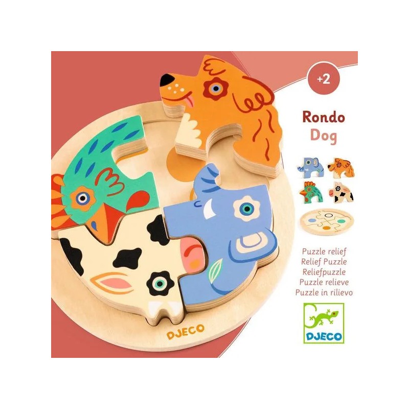 Rondo Dog est un puzzle en bois facile à assembler sur le thème des animaux. Les quatre animaux forment une ronde, et l’enfant les place en suivant la découpe extérieure et les traits au sol, développant ainsi sa perception des formes et sa coordination.