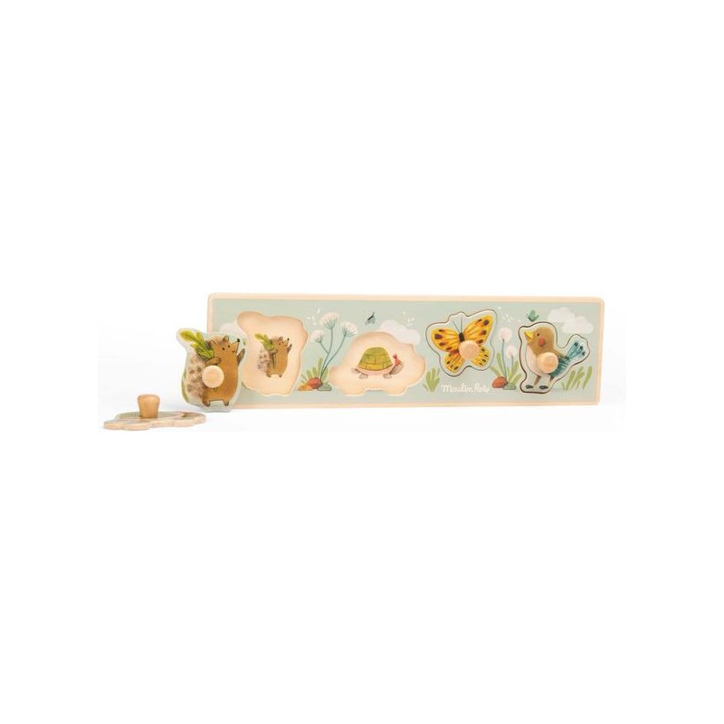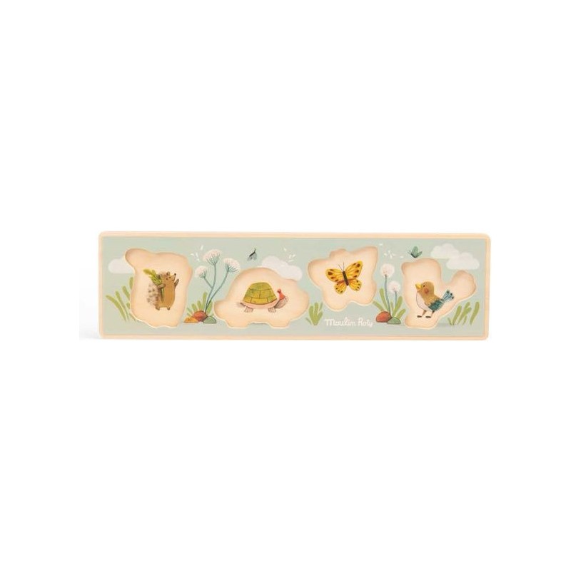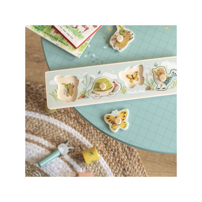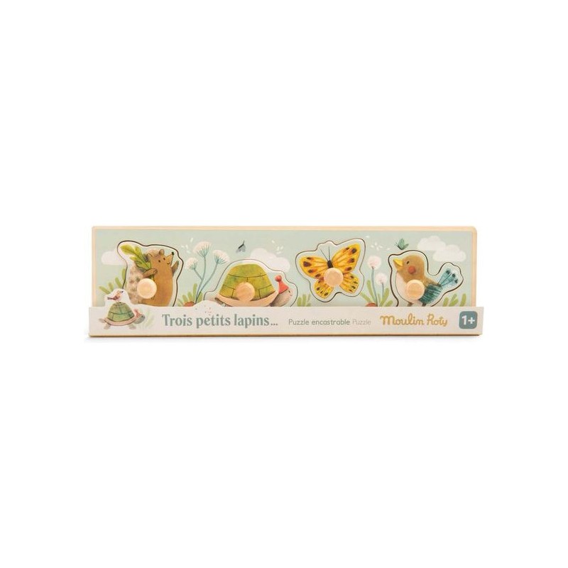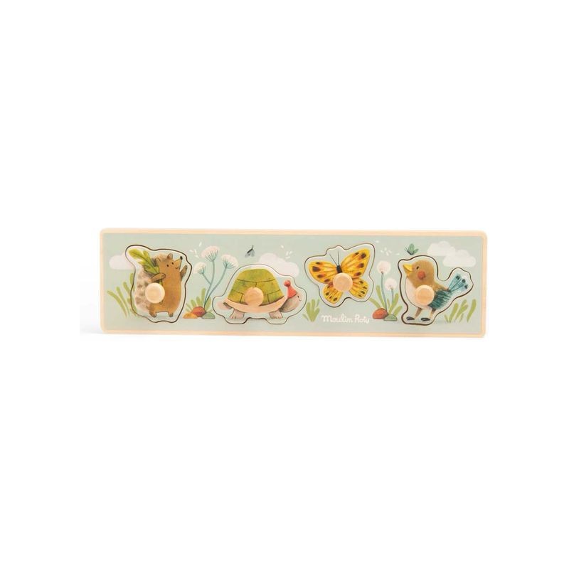 Puzzle d'encastrement en bois, avec 4 pièces aux illustrations de jolis animaux colorés pour appréhender les formes et les couleurs. Chaque pièce dispose d'une poignée, facile à attraper par les petites mains.