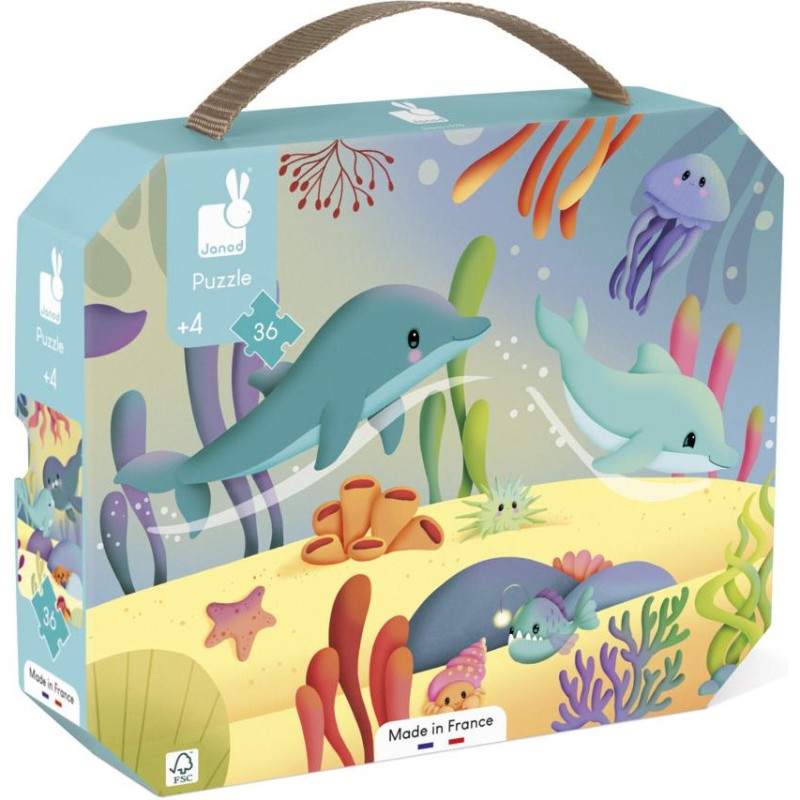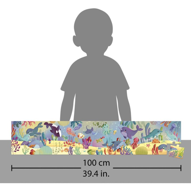 Découvrez les profondeurs de l’océan ! Plongez à la recherche d’animaux marins avec cette frise illustrée de 36 pièces sur le thème des créatures marines, adaptée aux enfants dès 4 ans. Ce puzzle panoramique de 100 x 20 cm offre une immersion totale dans les profondeurs aquatiques. Les pièces sont parfaitement adaptées aux petites mains des enfants de 4 ans et permettent de développer leur motricité fine et leur logique. Ce puzzle marin est aussi idéal pour stimuler la concentration et la patience. Le poster fourni peut être utilisé comme modèle pour aider les enfants dans l’assemblage du casse-tête. Un panorama enchanteur s’offre alors à eux, comme s’ils naviguaient à bord d’un sous-marin tels des explorateurs des mers ! Ils pourront ensuite se servir de ce puzzle comme d'un cherche et trouve et ainsi se mettre au défi de repérer et de nommer tous les animaux marins qui s’y cachent. Le tout est vendu dans une jolie valisette avec poignée, pratique pour le rangement et le transport. Avec ce puzzle, les enfants et les adultes peuvent partager un moment de calme et de sérénité : c’est l’occasion de stimuler l’imagination des plus petits. Alors, embarquez tous ensemble ! Fabriqué en France, ce puzzle est réalisé avec des encres végétales et du carton Fsc™.