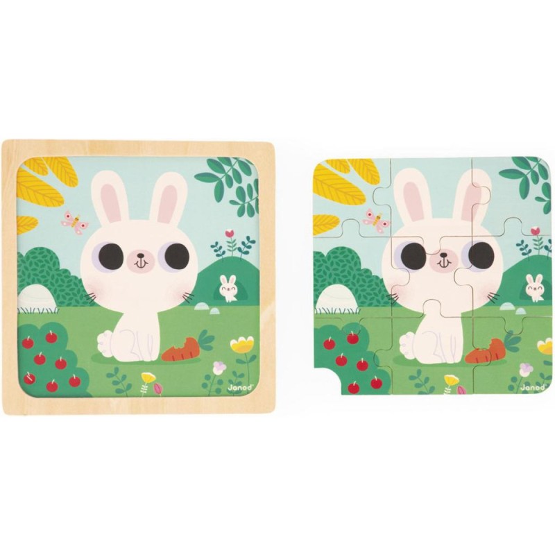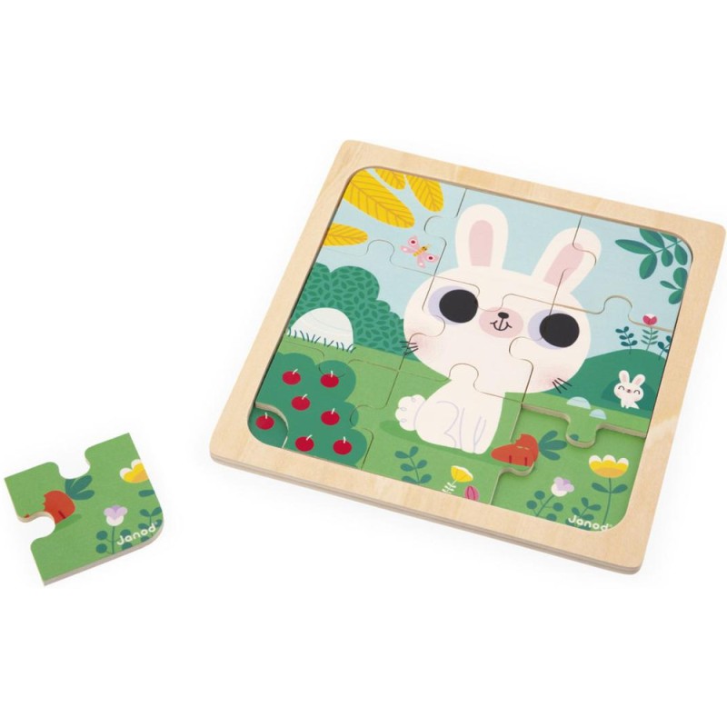 Le petit lapin blanc attend les plus petits pour une initiation amusante aux premiers puzzles ! Dès 18 mois, les puzzles en bois peuvent être proposés aux bébés, ils sont une grande source d'apprentissage et de satisfaction pour nos enfants, donc pourquoi s'en priver ! Sur ce modèle de puzzle premier âge, les enfants vont adorer la jolie scène en pleine nature avec cet adorable lapin gourmand. Il se compose de 9 pièces en bois et d’une encoche facilitant le retrait des pièces. Sous le puzzle, le modèle imprimé permettra d'aider les petits pour les premières fois. Le tout se trouve sur un support en bois, ce qui permet de ranger et de transporter facilement ce jeu d'éveil. Ce puzzle est idéal pour aider votre enfant à développer sa motricité fine, sa concentration et son autonomie. Il est fabriqué en bois Fsc.