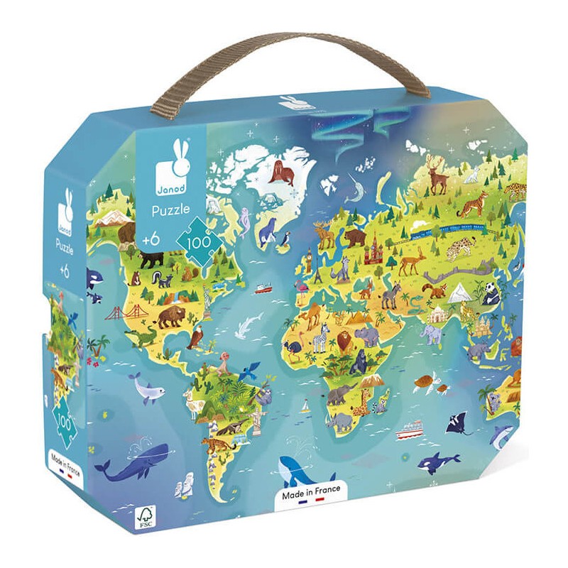 De Sydney à Los Angeles, partez à la rencontre des monuments mythiques et des animaux qui peuplent la planète avec ce puzzle en carton de 100 pièces ! Les explorateurs en herbe et les petits fans de géographie dès 6 ans vont être ravis. Illustré avec plein de détails, ce magnifique puzzle aidera votre enfant à développer sa mémoire et sa dextérité. Avec son grand nombre de pièces, c'est un puzzle qui promet de beaux challenges et de longs moments d'amusement ! Il est fourni avec un poster servant de modèle, pour guider l'enfant dans ses premières réalisations. Très pratique, le puzzle se range dans sa jolie valisette avec poignée pour un rangement et un transport faciles ! Craquez dès maintenant pour ce puzzle fabriqué en France avec du carton Fsc mixte et des encres végétales.