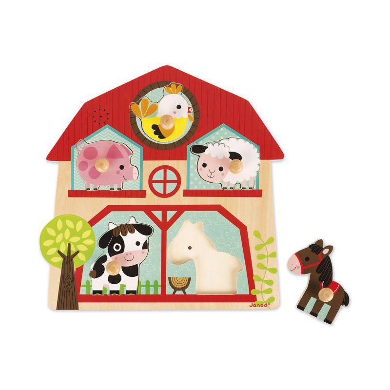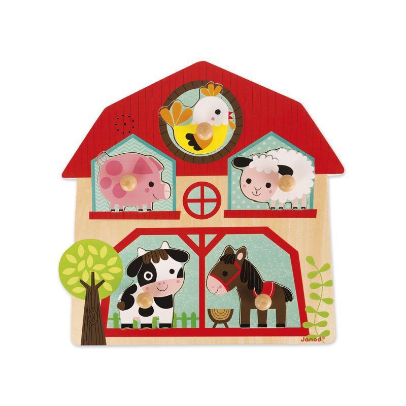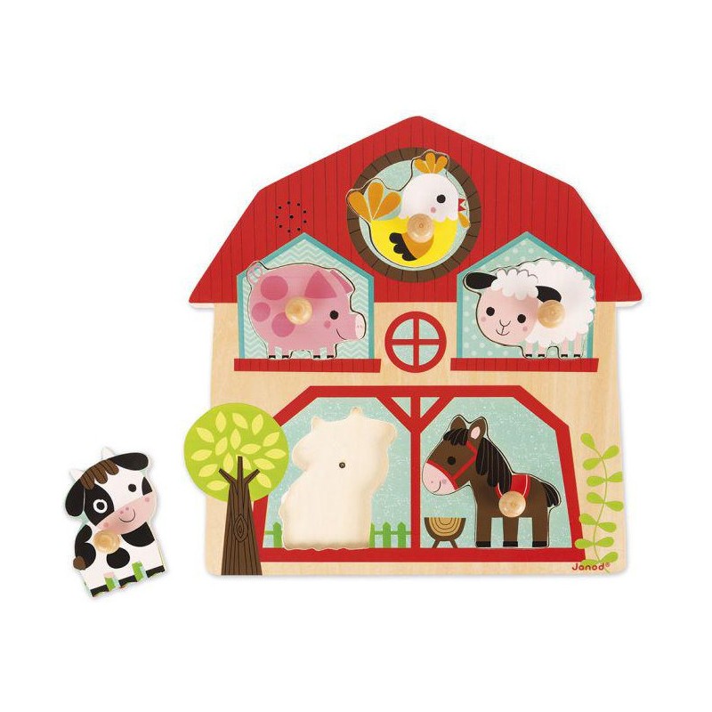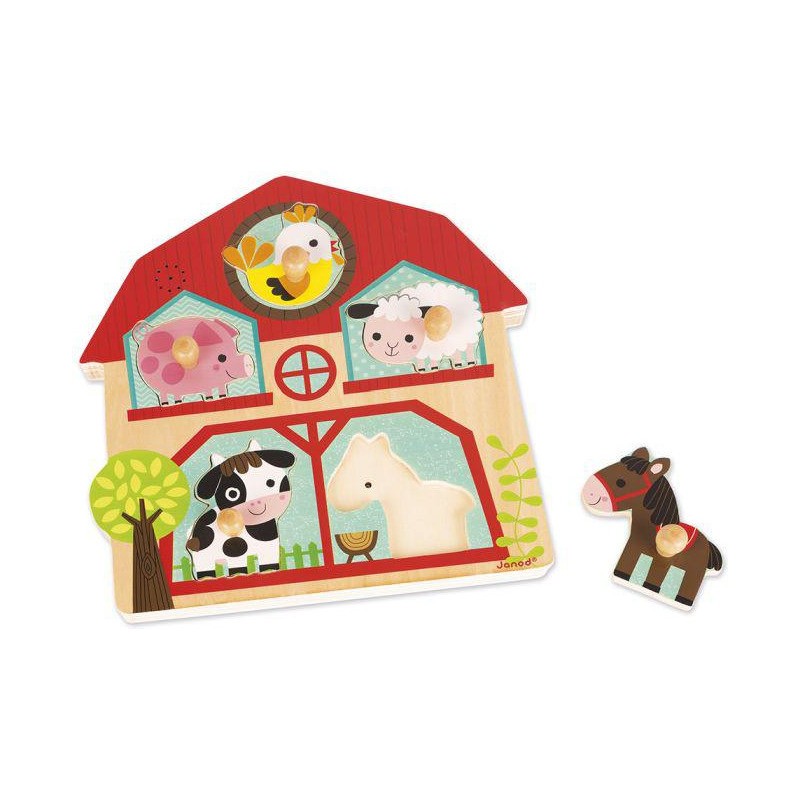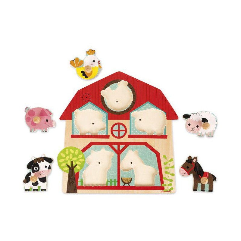 Les tout-petits adorent les animaux de la ferme, ce puzzle à encastrement sur ce thème les encouragera donc à manipuler les pièces et à les remettre au bon endroit. Et en plus, ce puzzle est musical, ainsi lorsque l'enfant place la pièce, le cri de l'animal retentit pour le plus grand plaisir de votre petit. Ce puzzle en bois se compose de 5 pièces à encastrer, représentant chacune un animal de la ferme, une vache, un cheval, une poule, un mouton, un cochon. Avec ses couleurs vives et ses grosses pièces faciles à manipuler, il sera idéal pour l'éveil des petits.