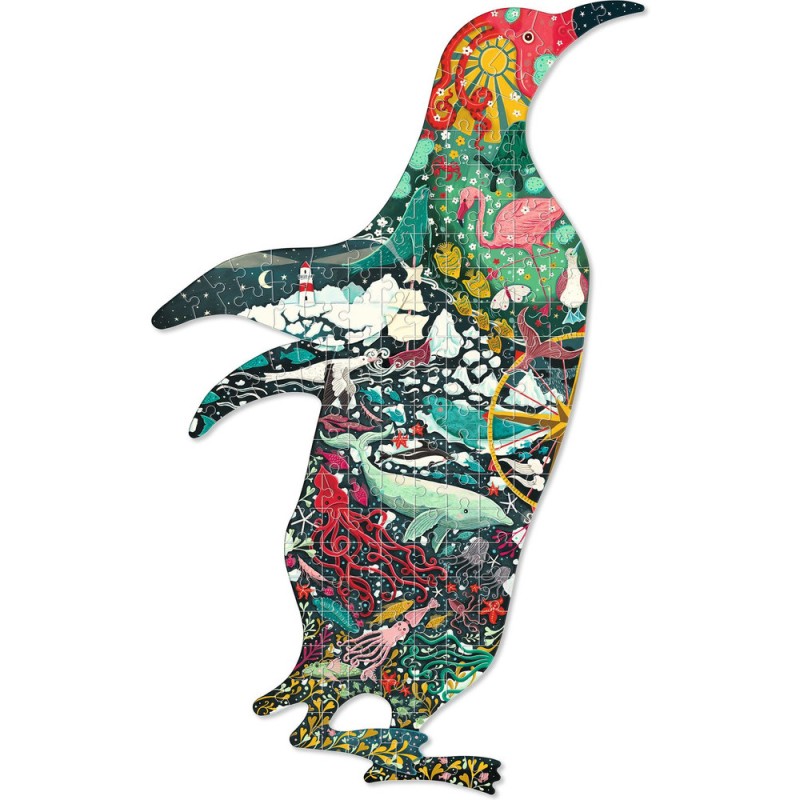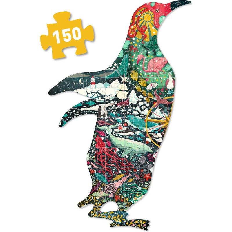 Le Puzz'Art Penguin est un puzzle de 150 pièces. Dans un format inédit, sans coin ni bordure, tout l'art du puzzle est bousculé. L'enfant découvre à travers cette grande silhouette ajourée un manchot, dans lequel fourmille un monde imaginaire.